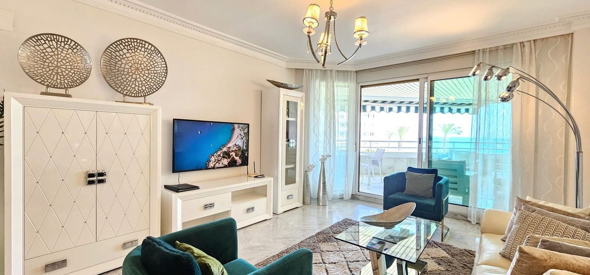 - Beautiful apartment in a gated community Playa Esmeralda, located on beachfront, in Golden Mile, Marbella. The apartment has 2 bedrooms, 2 bathrooms (one in-suite), living room with access to the spacious terrace with amazing view to the sea, beach and gardens. Kitchen is equipped with all appliances. In the urbanization there is two swimming pools, beautiful gardens, gym, direct access to the beach and 24 hours security sistem with camaras.