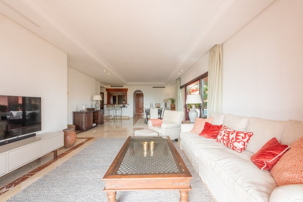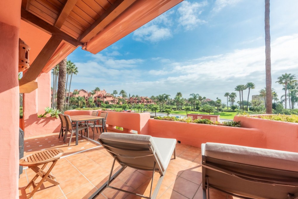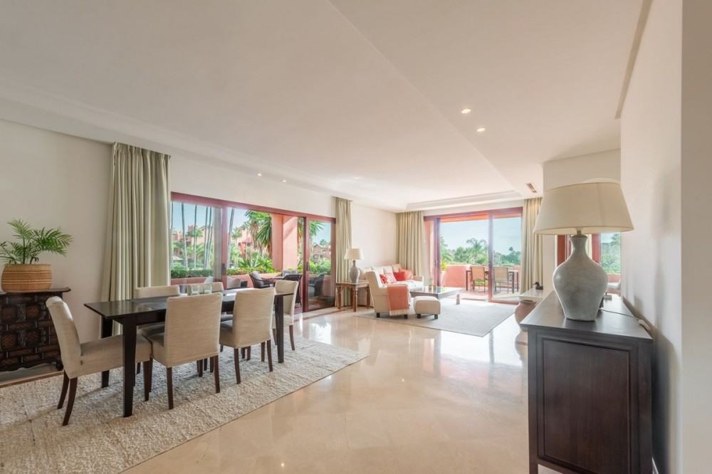- Exceptional Frontline Beach Corner Apartment with Spectacular Views Experience coastal living at its finest in this stunning frontline beach corner apartment, which offers breathtaking views of the Mediterranean Sea and the majestic mountains beyond. Situated on the first floor of one of the most luxurious and sought-after apartment complexes along Estepona's New Golden Mile, this residence is a true gem. What sets this apartment apart are the two expansive terraces flanking both sides of the living area, providing not only ample outdoor space for relaxation and entertainment but also allowing an abundance of natural light to fill the interiors. The panoramic vistas from these terraces are truly mesmerizing, making every moment spent here a visual delight—no additional wall decoration is needed to enhance the beauty of your surroundings. The apartment features a welcoming hallway, a fully fitted kitchen with an adjacent utility room, a master bedroom with an en-suite bathroom and direct access to one of the generous terraces, a guest bedroom with its own small balcony, and a guest bathroom. The spacious layout offers the potential to convert the property into a three-bedroom home, as other similar units in the complex have successfully done. Sold partially furnished, it also includes an underground garage space and a storage room. Residents of this gated community enjoy 24/7 security and concierge services, alongside beautifully maintained tropical gardens, tranquil water ponds, two inviting swimming pool areas, and an indoor gym. We highly recommend scheduling a viewing to fully appreciate the spectacular views and luxurious lifestyle this remarkable apartment offers!