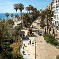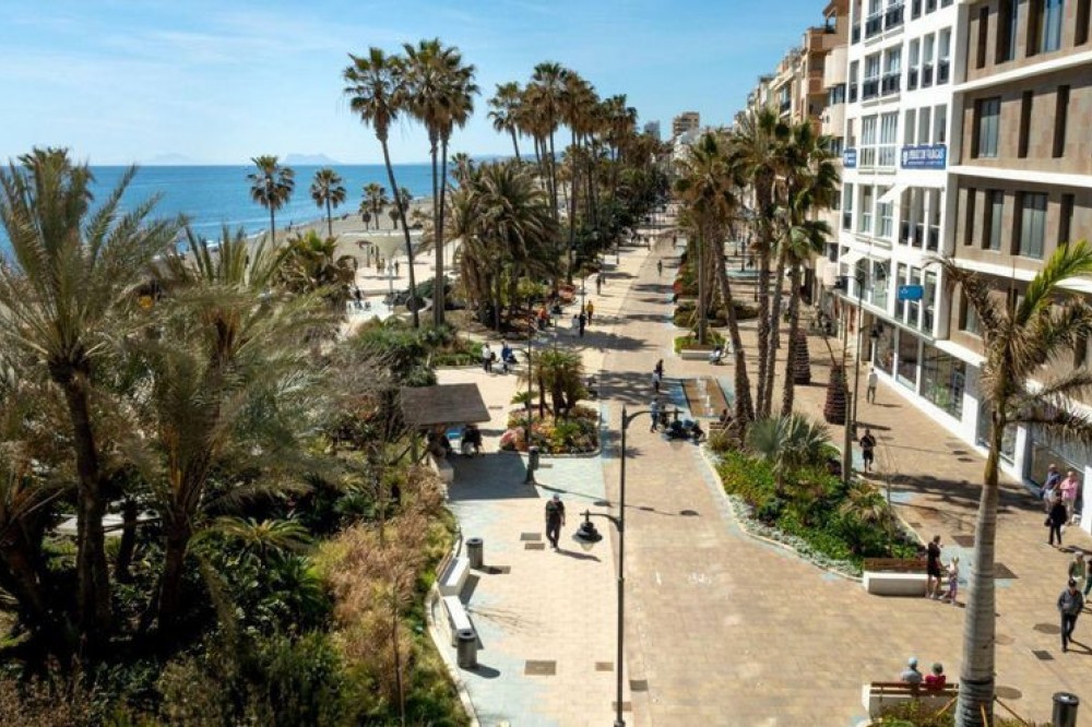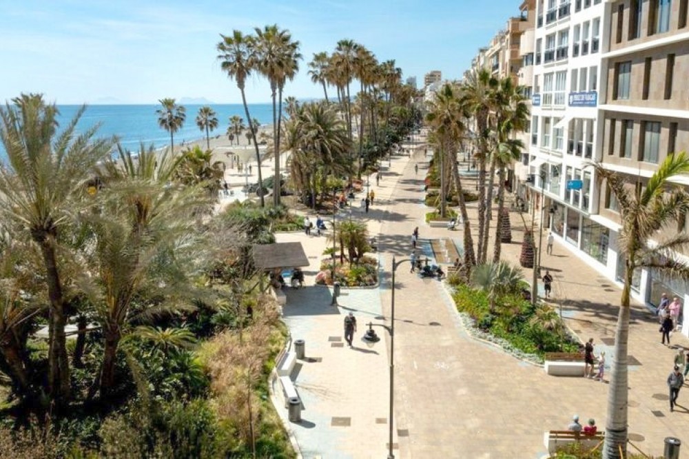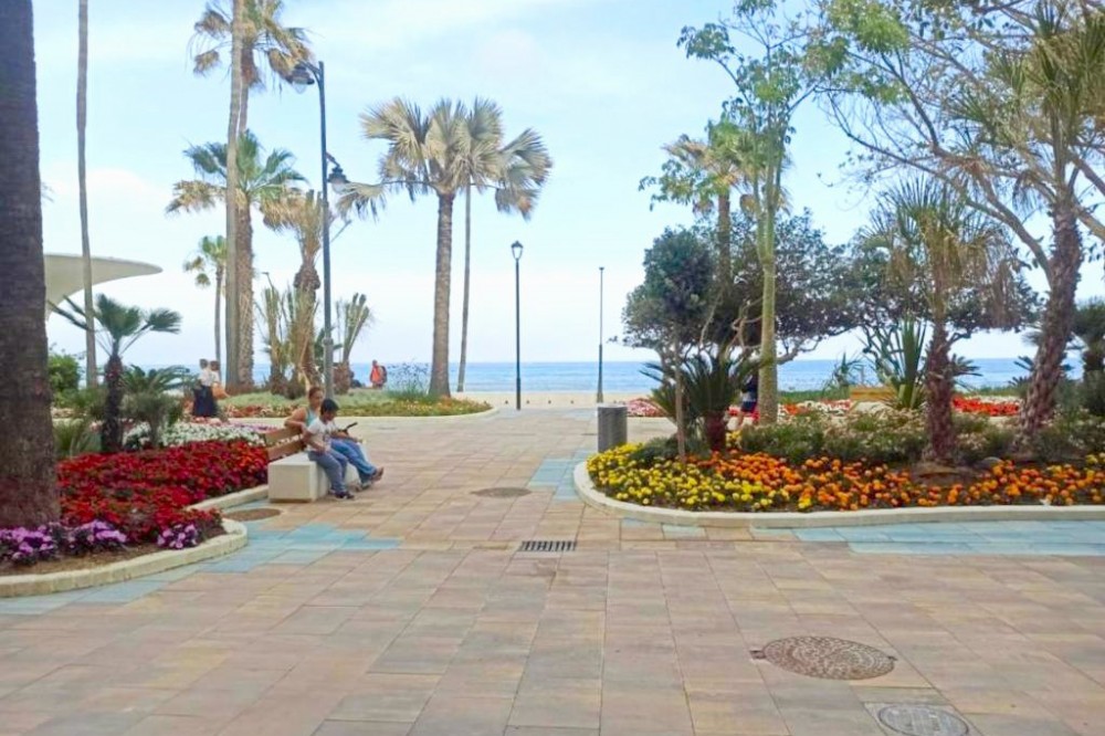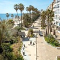 - This first-floor apartment, located in the exclusive Paseo Maritimo area in the center of Estepona, stands out for its side sea views and direct access to the promenade. Fully renovated and ready to move in, the property offers a privileged location just a few meters from the beach and close to all essential services such as shops, restaurants, schools, and public transport. The main area of the property consists of an open-plan living room with an integrated dining area, providing a spacious and bright atmosphere. The parquet flooring and large windows with glass doors add warmth and light to the space. The kitchen, fully equipped and designed in an open-plan style with a peninsula, is integrated into the social area, facilitating interaction and optimal use of space. From the living room, there is access to a balcony-style terrace of approximately 7m², ideal for enjoying the side sea views and the Costa del Sol climate. The apartment features two bedrooms, both with built-in wardrobes and modern finishes. The master bedroom has a large private bathroom with a spacious shower, while the second bathroom is also fully equipped and maintains the same contemporary design. Finishes include porcelain flooring in wet areas and double glazing on all windows, ensuring comfort and efficiency. Additional features include air conditioning, reinforced entrance door, elevator in the building, and direct access to the promenade. The apartment is delivered fully furnished and in excellent condition, with all elements recently renovated. Furthermore, the property is close to all urban amenities such as shops, the port, schools, and restaurants, making daily life in the center of Estepona by the sea convenient and enjoyable.