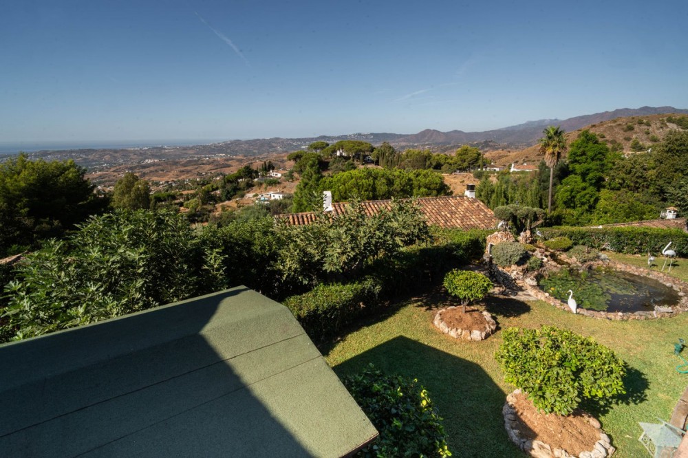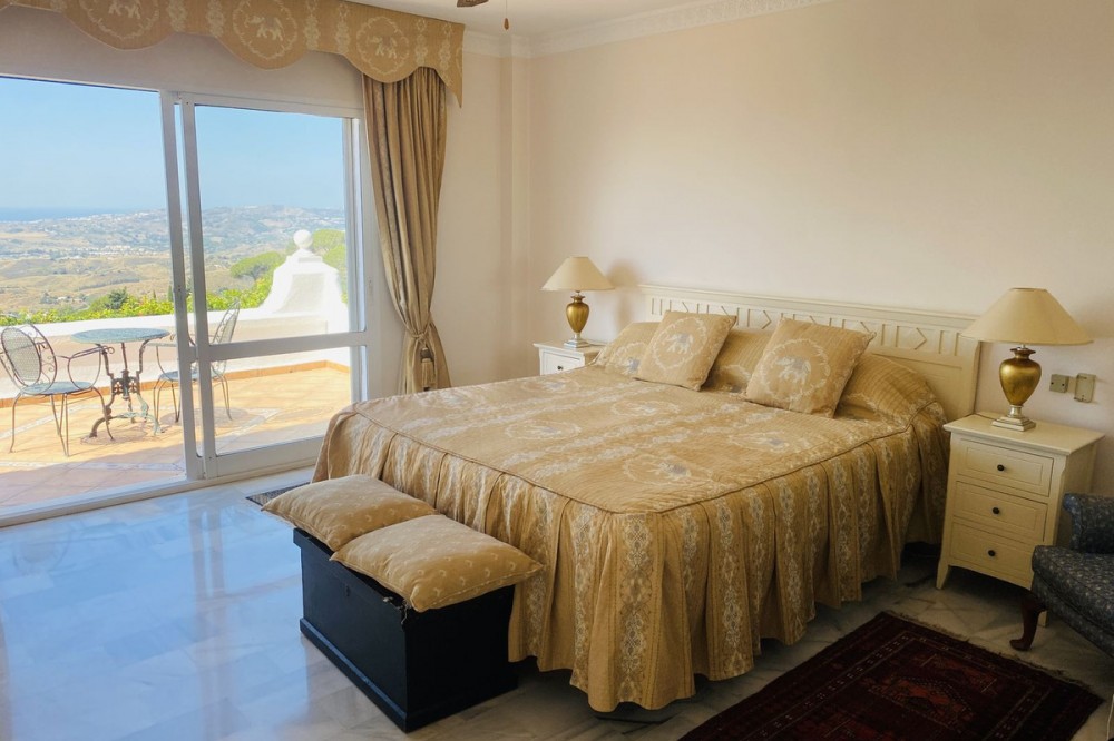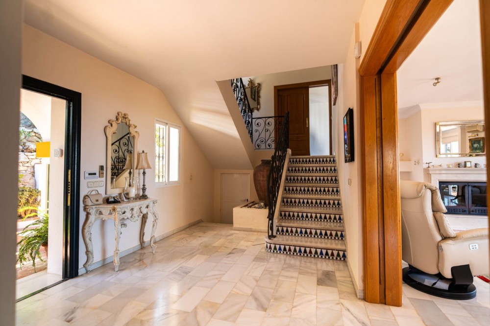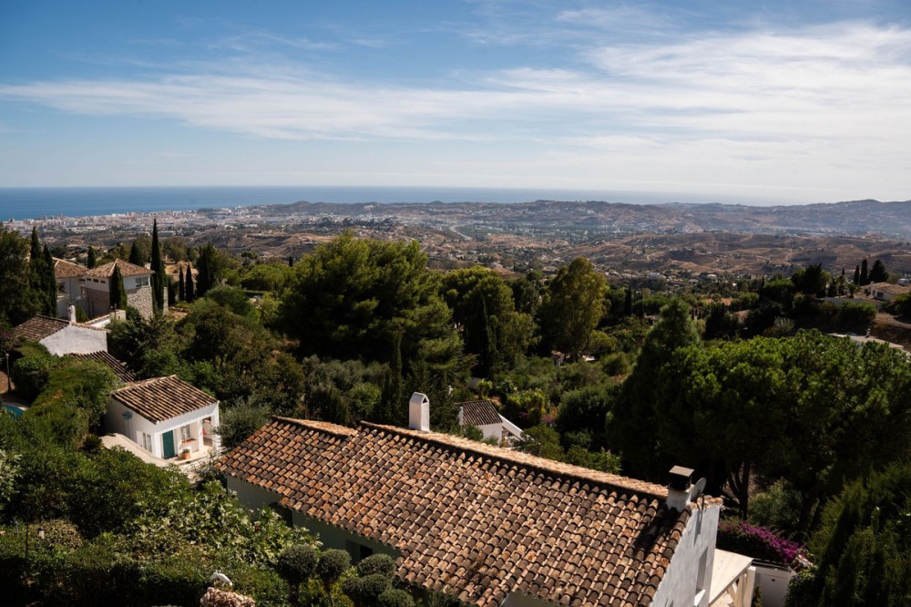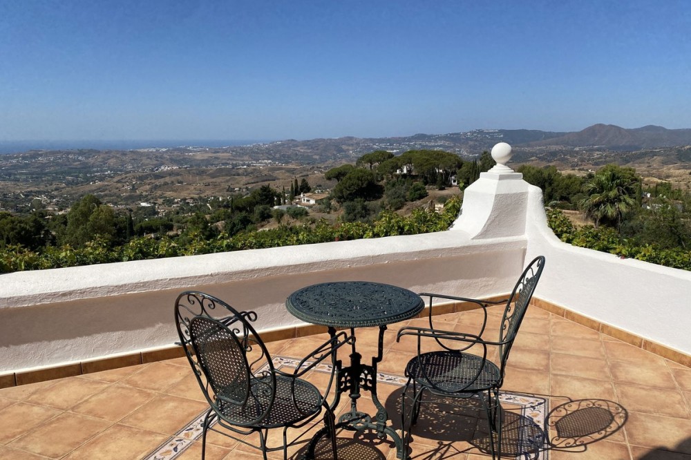 - Detached 5-bedroom Villa in Mijas La Nueva with Breathtaking Panoramic Views From its commanding position in Mijas La Nueva, this villa enjoys phenomenal panoramic vistas stretching from the Mediterranean coastline to the surrounding mountains, with spectacular sunsets as the sun dips behind the peaks. The views are breathtaking, inspiring, and truly unparalleled. Not only does this home boast some of the best views in the area, it is also one of the largest properties within Mijas La Nueva, offering exceptional space, versatility, and character across its multiple levels. Key Features: Five bedrooms, two full bathrooms, plus guest toilet Upper level: Exceptionally large master bedroom with built-in closets, ensuite bathroom, and private terrace overlooking the spectacular views, plus two further bedrooms sharing a family bathroom Intermediate level: Large space currently used as a yoga studio, easily converted into a fourth bedroom or self-contained apartment Ground floor: Fifth bedroom, currently used as an office Large basement level used for storage, with potential for a home gym Spacious lounge with a beautiful double glass door fireplace that distributes heat throughout the home, including the upstairs bedrooms. The lounge also features two sets of double sliding glass doors opening onto the terraces, for indoor–outdoor flow. Large enough to accommodate a full living area with sofas, the fireplace, and a dining space - again all set against a backdrop of amazing VIEWS. The country style kitchen is very functional, with a central island and gas cooker (bottle-fed), abundant cupboards, generous work surfaces, and a bright, practical layout designed for those who love to cook. South- and southeast-facing windows flood the space with natural light and showcase the views. Also includes a double fridge-freezer and a separate pantry. Private pool area set into natural rock, with shaded overhang, outdoor kitchen/entertaining space, kidney-shaped pool, and fountain feature Expansive terraces designed to maximize the panoramic coastal and mountain views Mature gardens with fruit trees, vegetable patch, fish pond, and tool shed Wellness amenities including Jacuzzi and sauna Private parking for three to four cars on a shared driveway with just one other villa, with space available to build a carport if desired Community Benefits: Set within the desirable Mijas La Nueva urbanization, residents also enjoy access to two communal swimming pools, an on-site bar and restaurant, and a tennis court. This villa is a rare opportunity to own one of the most substantial and uniquely positioned homes in Mijas La Nueva, where inspiring views and lifestyle amenities come together in a truly special setting. VIEWINGS now welcome!