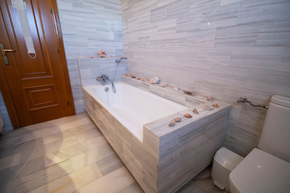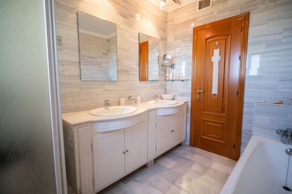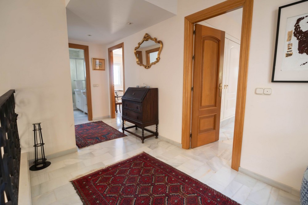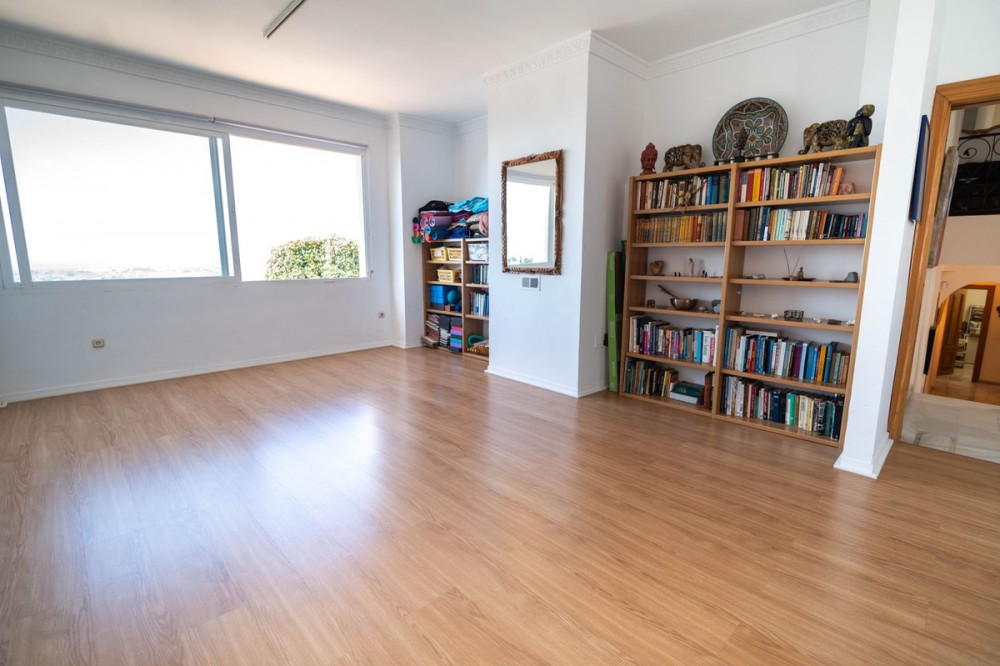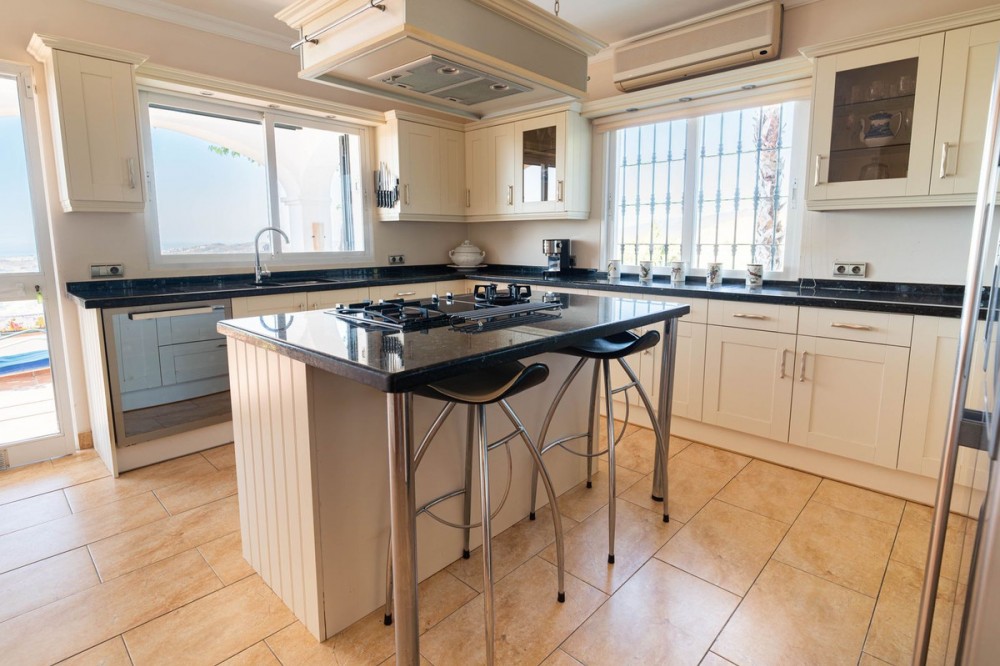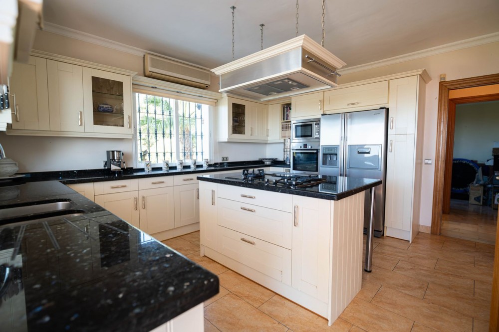 - Detached 5-bedroom Villa in Mijas La Nueva with Breathtaking Panoramic Views From its commanding position in Mijas La Nueva, this villa enjoys phenomenal panoramic vistas stretching from the Mediterranean coastline to the surrounding mountains, with spectacular sunsets as the sun dips behind the peaks. The views are breathtaking, inspiring, and truly unparalleled. Not only does this home boast some of the best views in the area, it is also one of the largest properties within Mijas La Nueva, offering exceptional space, versatility, and character across its multiple levels. Key Features: Five bedrooms, two full bathrooms, plus guest toilet Upper level: Exceptionally large master bedroom with built-in closets, ensuite bathroom, and private terrace overlooking the spectacular views, plus two further bedrooms sharing a family bathroom Intermediate level: Large space currently used as a yoga studio, easily converted into a fourth bedroom or self-contained apartment Ground floor: Fifth bedroom, currently used as an office Large basement level used for storage, with potential for a home gym Spacious lounge with a beautiful double glass door fireplace that distributes heat throughout the home, including the upstairs bedrooms. The lounge also features two sets of double sliding glass doors opening onto the terraces, for indoor–outdoor flow. Large enough to accommodate a full living area with sofas, the fireplace, and a dining space - again all set against a backdrop of amazing VIEWS. The country style kitchen is very functional, with a central island and gas cooker (bottle-fed), abundant cupboards, generous work surfaces, and a bright, practical layout designed for those who love to cook. South- and southeast-facing windows flood the space with natural light and showcase the views. Also includes a double fridge-freezer and a separate pantry. Private pool area set into natural rock, with shaded overhang, outdoor kitchen/entertaining space, kidney-shaped pool, and fountain feature Expansive terraces designed to maximize the panoramic coastal and mountain views Mature gardens with fruit trees, vegetable patch, fish pond, and tool shed Wellness amenities including Jacuzzi and sauna Private parking for three to four cars on a shared driveway with just one other villa, with space available to build a carport if desired Community Benefits: Set within the desirable Mijas La Nueva urbanization, residents also enjoy access to two communal swimming pools, an on-site bar and restaurant, and a tennis court. This villa is a rare opportunity to own one of the most substantial and uniquely positioned homes in Mijas La Nueva, where inspiring views and lifestyle amenities come together in a truly special setting. VIEWINGS now welcome!