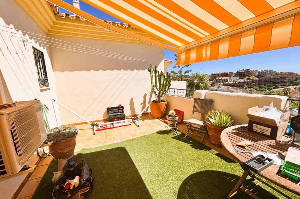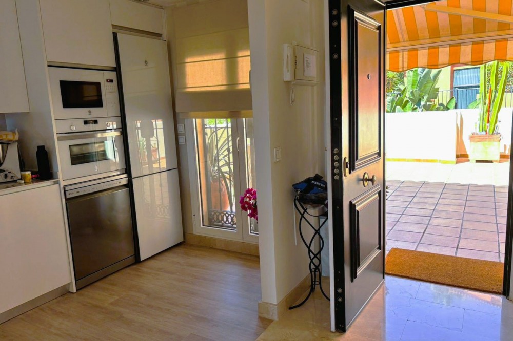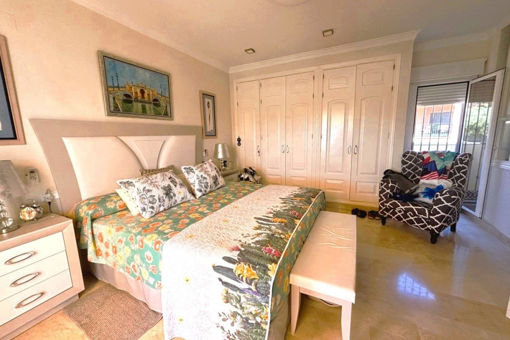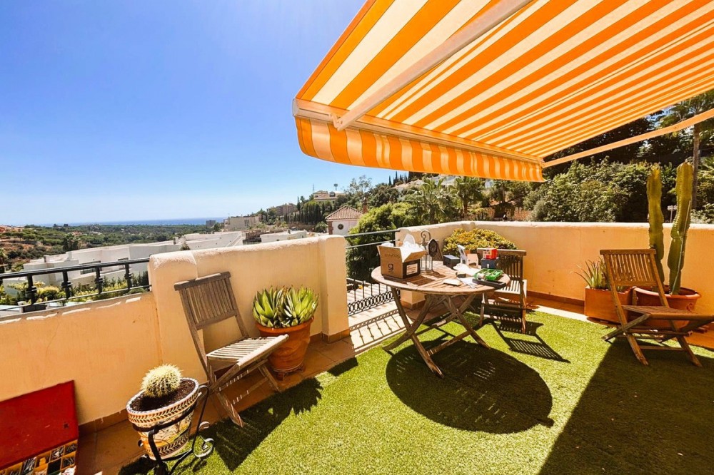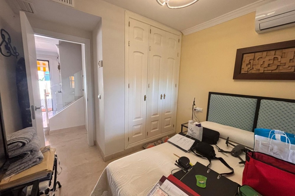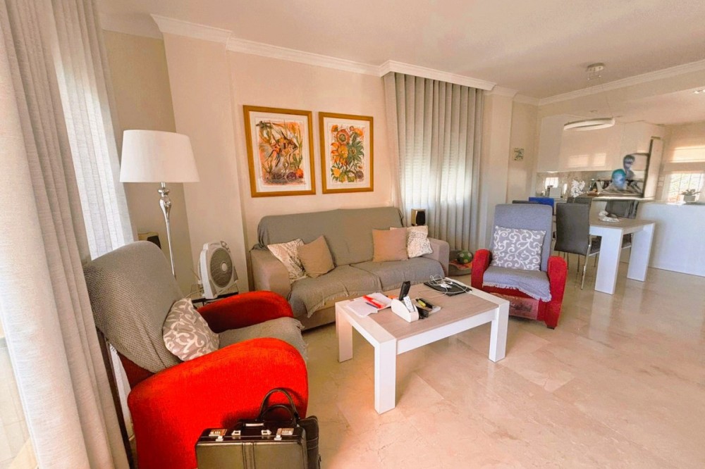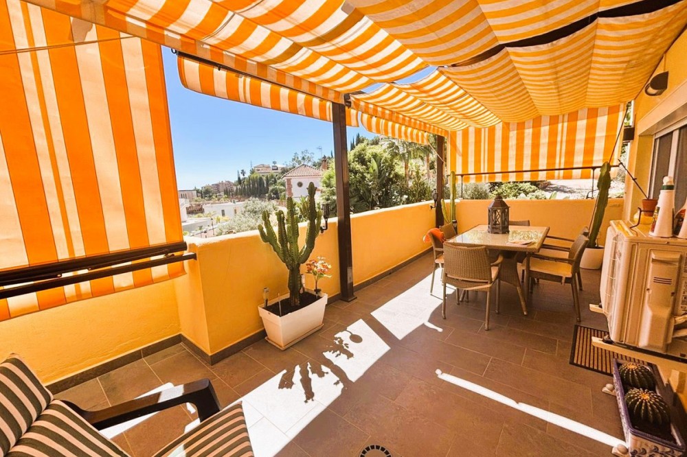 - Beautiful property for sale in perfect condition in the Elviria area, close to the golf course and less than a 5-minute drive to the beach! Quiet, very residential urbanisation, ideal for permanent residence. Duplex , is on the ground level but with hight , no lift or stairs, very comfortable!!! The property is on a corner, so it is very sunny and bright and has sun all day long! Very large terrace at the entrance of the house, with awnings and afternoon sun. Upon entering, we find a spacious living room with an open, fully equipped kitchen, from the living room access to the second terrace, which faces south and offers open views of the sea, with sun all day long! There are also new awnings! On the same floor there is a double bedroom with a built-in wardrobe and a full bathroom with shower. The kitchen and bathrooms have been recently renovated! On the second floor is the master bedroom with en-suite bathroom in perfect condition, as of been renovated not long ago , large built-in wardrobes and private terrace with recently installed awnings and beautiful unobstructed views. Equipped with Air conditioning and heating and very well-maintained and immaculate marble floors! Large garage space and storage room included in the price!!! VIEWINGS HIGHLY RECOMMENDED!!!