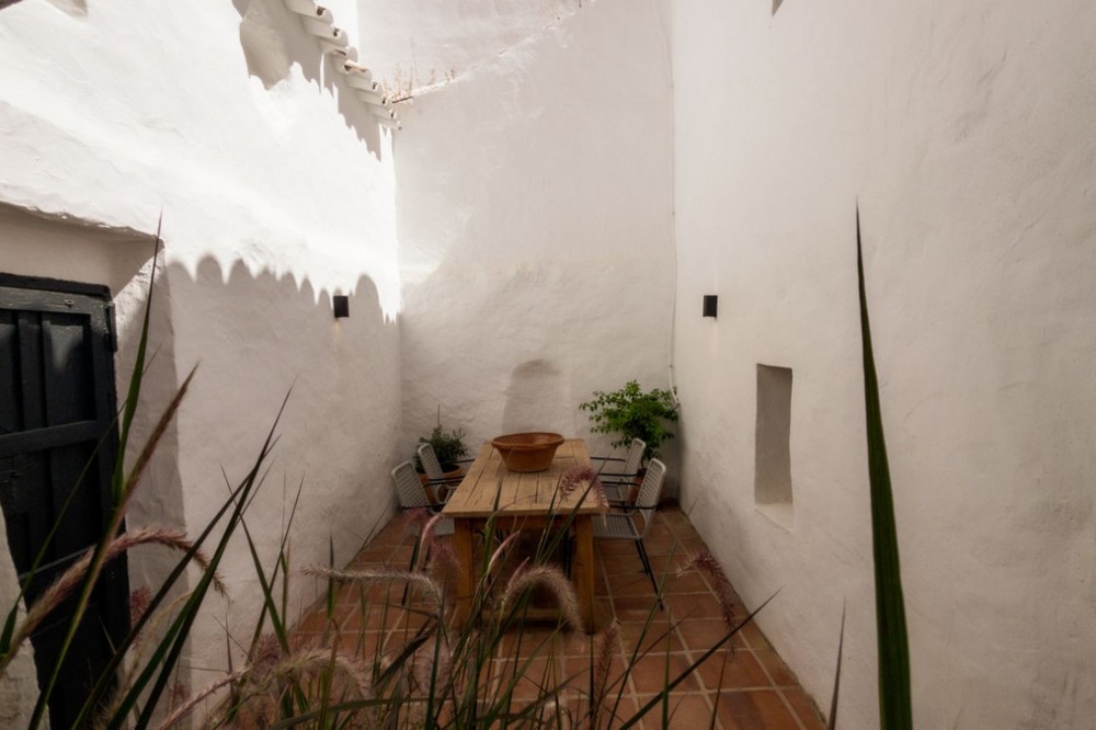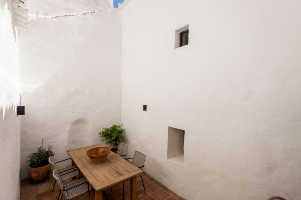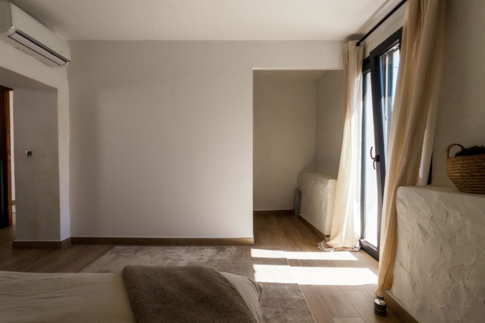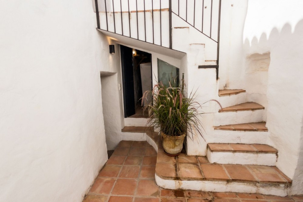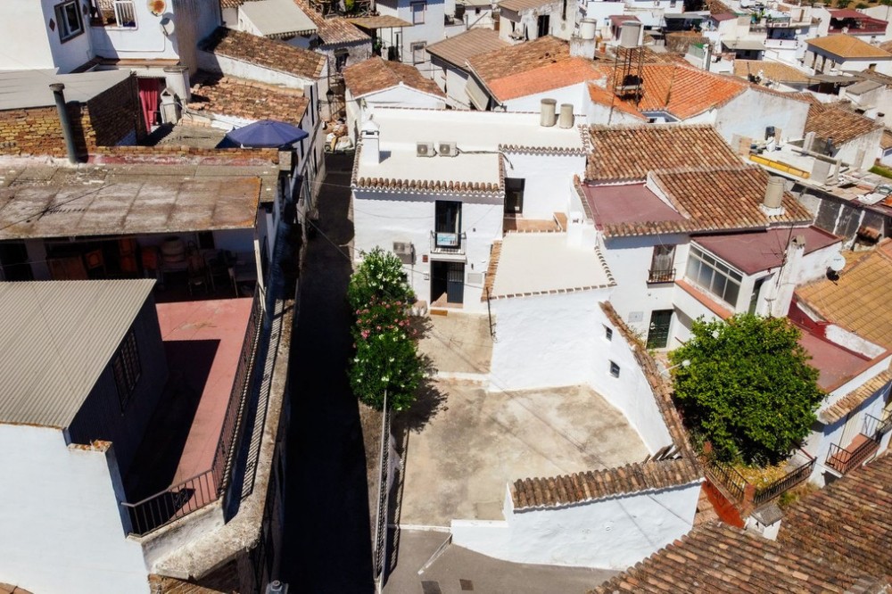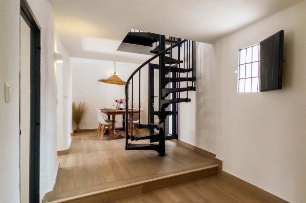 - Step into this lovingly furnished home, carefully designed to combine comfort and atmosphere. In front of the house lies a generous terrace, perfect for enjoying the sun or long summer evenings. The spacious yet cozy living room is the warm heart of the house, featuring a fireplace and a fully equipped open kitchen with bar. The bright, modern bathroom offers every luxury with a stylish double sink vanity, a spacious walk-in shower, a semi-separate toilet, and a washing machine. An open passage leads to the dining area under an impressive five-meter-high ceiling. From here there is access to the patio and a separate office, which can also serve as an additional bedroom. A striking spiral staircase takes you upstairs, where two spacious bedrooms await. The master bedroom includes a walk-in closet and a French balcony, while the second bedroom is light, airy, and has direct access to a large terrace with beautiful views. Altogether there are no less than five terraces, ensuring you can always find the perfect spot in the sun or shade. Trendy anthracite aluminum frames with double glazing, air conditioning in the living room and bedrooms, fiber-optic internet, and a security system complete the comfort of this home. The house is located in Guaro, one of the most charming villages in the province of Málaga, right in the middle of the stunning Sierra de las Nieves natural park, with its wide network of hiking trails, and only 18 km from Marbella. Wander through the historic streets with their typical Andalusian character and enjoy the nearby restaurants, terraces, and supermarket. In Guaro, all your senses come alive. Listen to the fountains and the Moorish music, admire the mountains and the whitewashed village, taste the almonds and olive oil, breathe in the fragrance of colorful flowers lining the streets, and above all, feel the magic of this unique place.