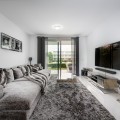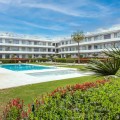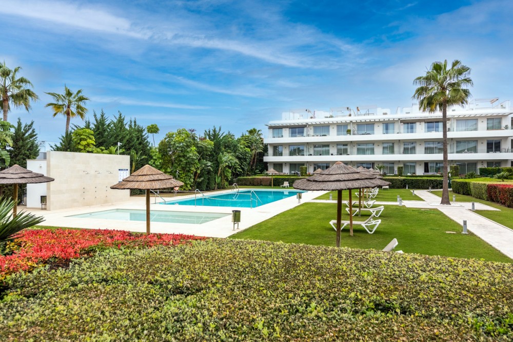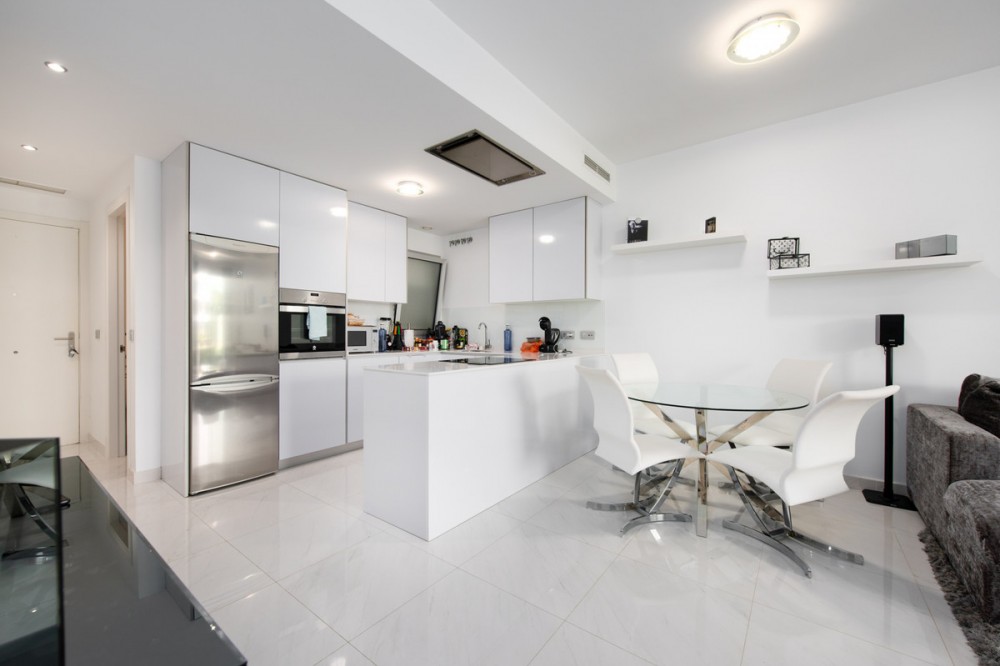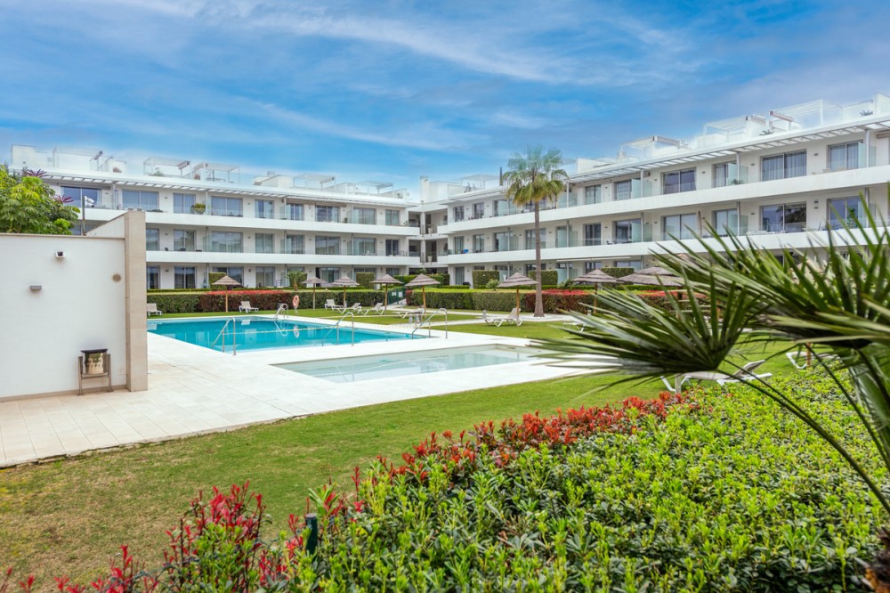 - Modern, two bedroom, ground floor, west facing apartment with afternoon sunshine and direct access to the community gardens and swimming pool. The property has two bedrooms, both with fitted wardrobes. The principal bedroom has an ensuite bathroom and direct access to the spacious private terrace. There is a spacious lounge and an open plan kitchen which is fully fitted with all appliances. The property is to be sold alongside an underground parking space and storage room.