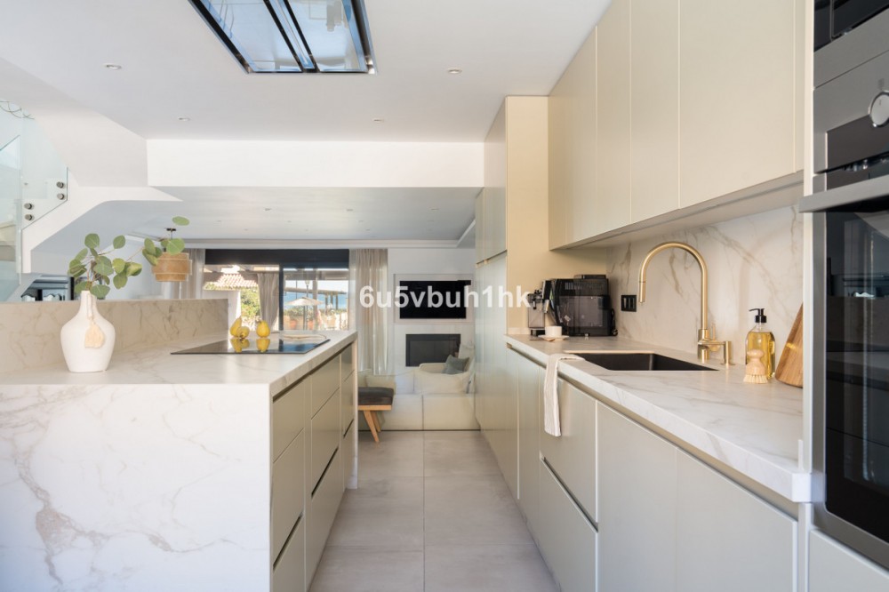 - Located in Marina de Casares, not far from Estepona Golf, within easy reach of shops, restaurants, schools, and leisure facilities. On the western edge of the Costa del Sol but still close to the vibrant cities of Marbella and Estepona. Only a short drive to the centre of Estepona and easily accessible to Malaga International Airport and Gibraltar. A well distributed bright south facing townhouse built over three floors, in a small beachfront community of houses, with direct access out to the beach through the community gate. The property has been fully reformed to a high standard with new carpentry, solar panels, security blinds, alarm and many personal touches and modern appliances. It has floor to ceiling windows, and good quality finishes throughout. The impressive front door leads into an open plan kitchen and living room area which flows out onto a private patio with direct views to the sea and a gate to the community area. The kitchen is fitted with modern appliances and is ample in size with plenty of storage space. A staircase with led lights and sensors leads up to the first floor with two ensuite bedrooms. The first bedroom is large with plenty of built in wardrobes and a terrace with stunning sea views. The ensuite bathroom is stylish and a perfect size. The second bedroom also has built in wardrobes and a modern bathroom. On the top floor is the master ensuite bedroom with built-in wardrobes and impressive sea views and a its own terrace where you can enjoy starring out to sea. This is a ready to move into home with every attention to detail and a home to be enjoyed, with unbeatable views. Just step out from your living room onto the beach! Unbeatable location!