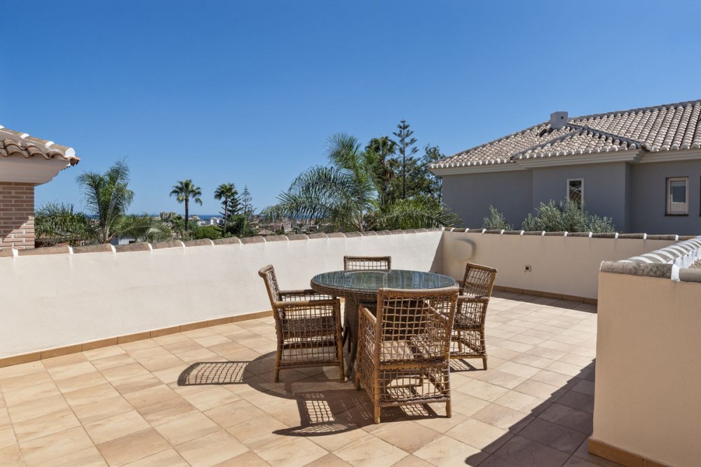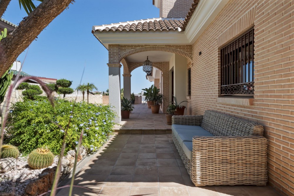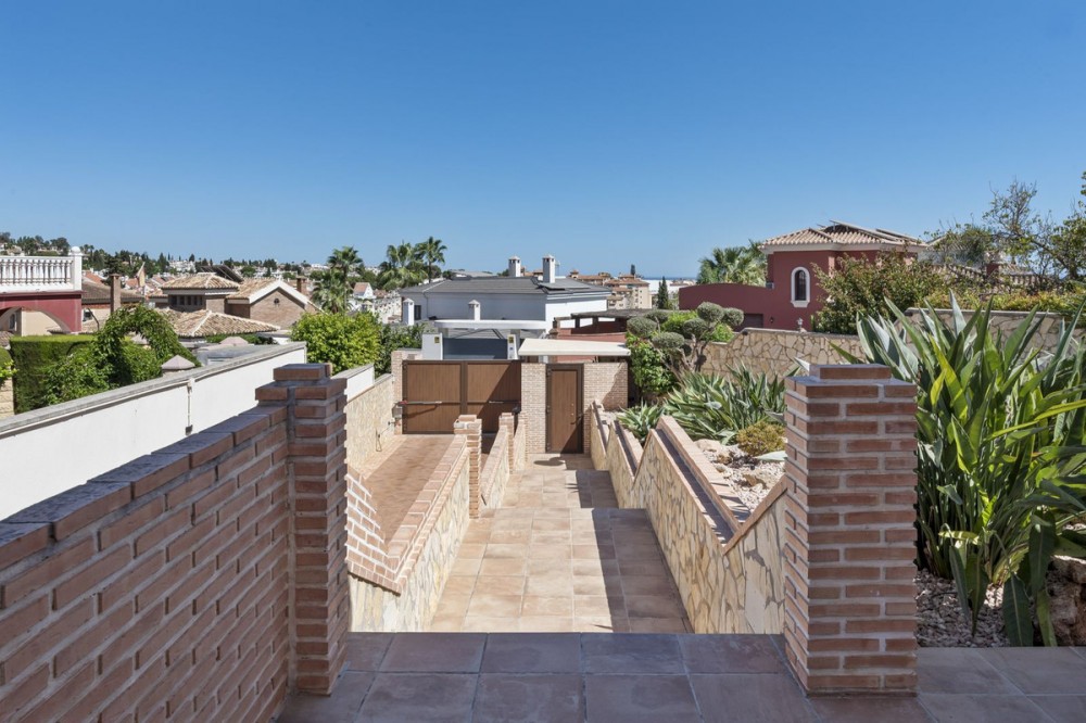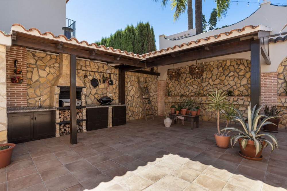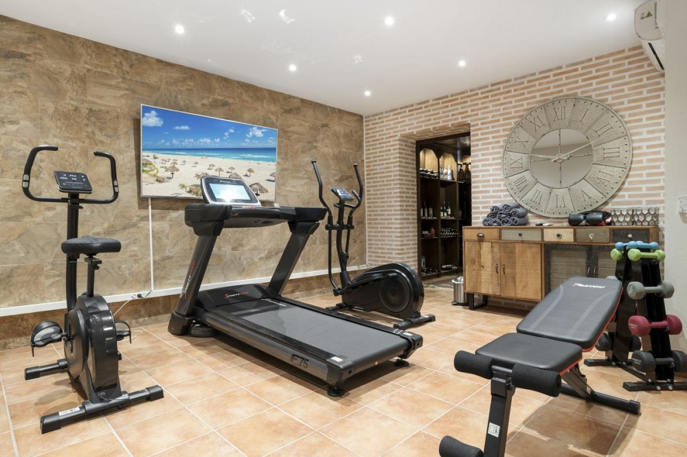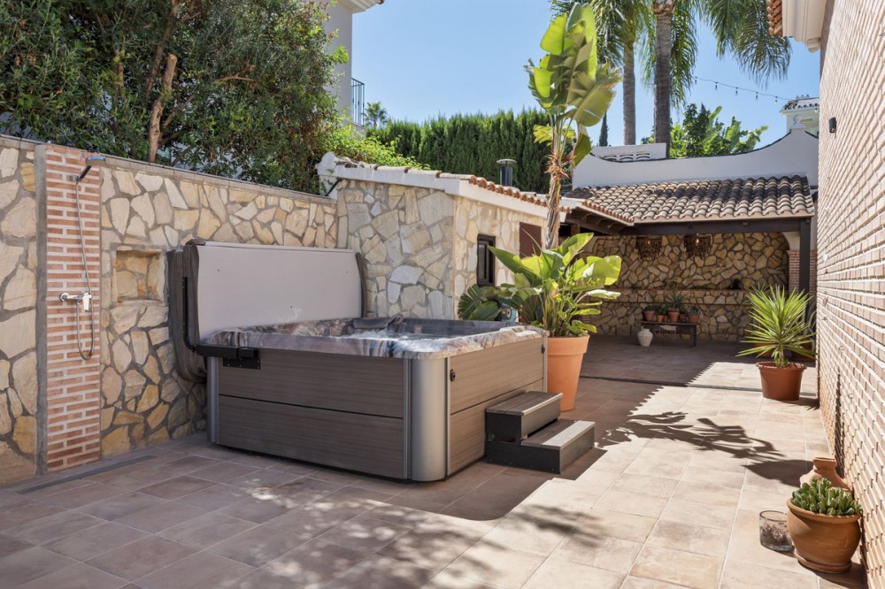 - Stunning Family Villa in Mijas Costa – Located in a Quiet Residential Area Highlights: – Terrace with sea views – Private swimming pool & pool bar – 5 bedrooms, 4 bathrooms, guest-toilet – Basement with games room, gym, wine cellar and XXL garage – Stylishly furnished – move-in ready This beautifully finished villa is in excellent condition and features multiple terraces. Layout: On the ground floor, the entrance hall welcomes you with elegant wooden doors and a guest toilet. The spacious 50 m² living room offers both a sitting area and dining area. A separate fully fitted kitchen with built-in NEFF appliances 2 x Fridge-freezer, Microwave, Oven, Dishwasher, Coffee machine, the kitchen opens onto a terrace. Also on this level are 3 bedrooms and 2 bathrooms. The villa is surrounded by terraces and landscaped gardens, with abundant greenery. The private pool is located on the main terrace, next to a perfect covered terrace directly connected to the living room. A fully equipped pool bar sets the ultimate summer mood. To the side, you will find a working jacuzzi, close to the BBQ area and outdoor kitchen, conveniently located near the main kitchen. The master bedroom is located on the first floor and features a spacious, well-finished walk-in closet. Its front-facing covered terrace is the ideal place to enjoy the sea views. A modern en-suite bathroom with luxury walk-in shower completes this suite. Also on this floor are 2 additional office/work rooms, which can easily serve alternative purposes. Another terrace is located to the rear/side. The villa benefits from a full basement. Here you will find a large games room, a fully equipped gym, and a cosy wine cellar. The 5th bedroom, perfect for guests, is also located here, along with a practical laundry room. Not to forget, an XXL garage with ample space for 4 cars plus scooters or other leisure equipment. A soundproofed music studio has also been created. Extras: Hot & cold air conditioning Wall-mounted heating panels for additional comfort, Bluetooth Ceiling fans UFH in bathrooms Jacuzzi Alarm & securiy cameras Tastefully decorated The villa is offered fully furnished, completely move-in ready, and equipped with every convenience. Location – La Sierrezuela La Sierrezuela is a residential area mainly consisting of detached villas. Within walking distance you’ll find a few restaurants and a small supermarket. Fuengirola is less than 2 km away and the beach just 3 km. Málaga Airport is reachable within 20 minutes by car. Details form title deed: Plot is 1.000m2 Total built for the villa 528m2 Built ground floor 178m2, First floor 56m2, Basement 286m2 Excl terrases.