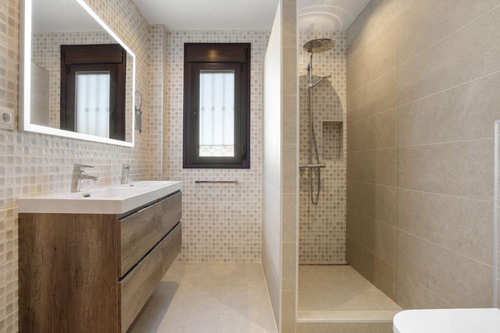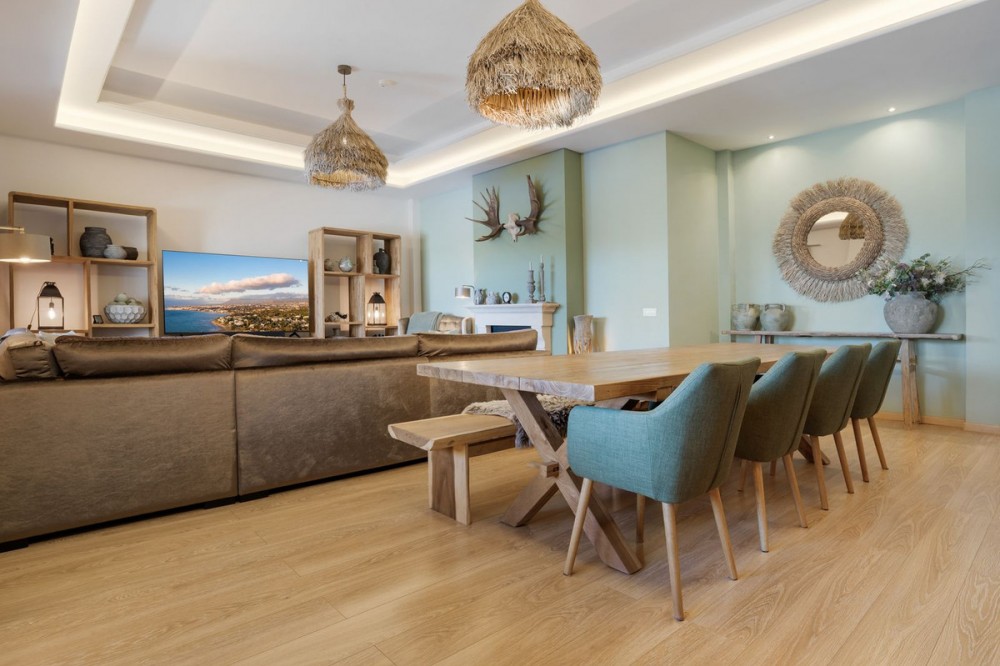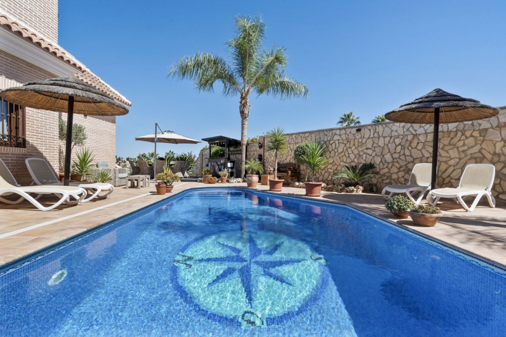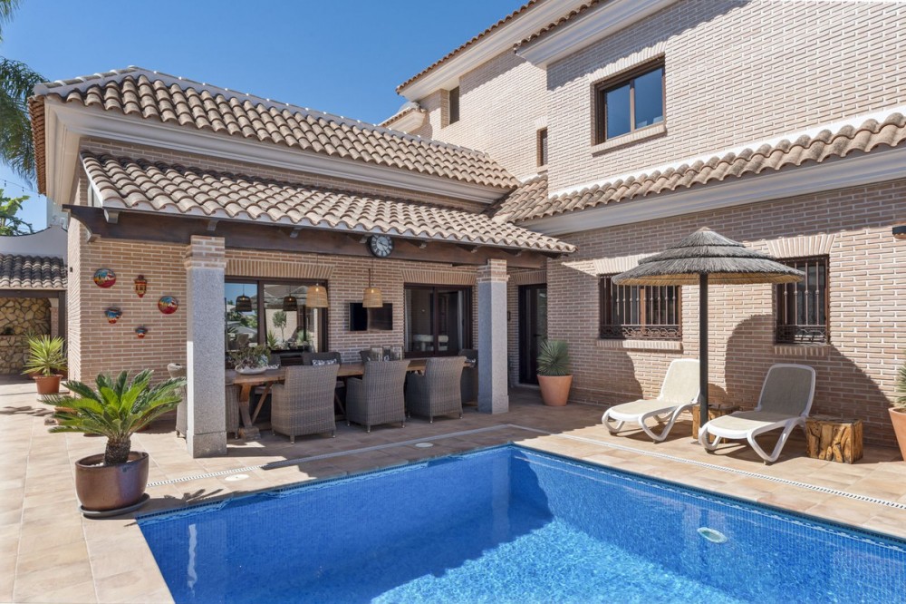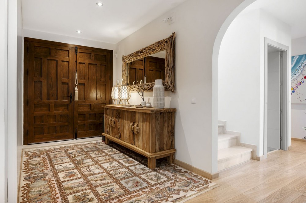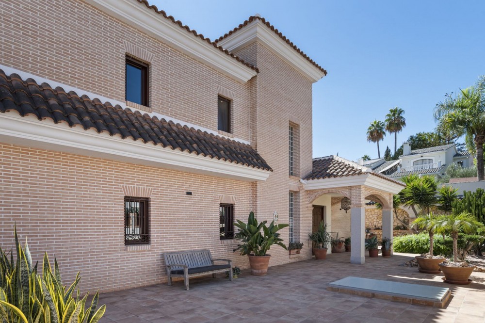 - Stunning Family Villa in Mijas Costa – Located in a Quiet Residential Area Highlights: – Terrace with sea views – Private swimming pool & pool bar – 5 bedrooms, 4 bathrooms, guest-toilet – Basement with games room, gym, wine cellar and XXL garage – Stylishly furnished – move-in ready This beautifully finished villa is in excellent condition and features multiple terraces. Layout: On the ground floor, the entrance hall welcomes you with elegant wooden doors and a guest toilet. The spacious 50 m² living room offers both a sitting area and dining area. A separate fully fitted kitchen with built-in NEFF appliances 2 x Fridge-freezer, Microwave, Oven, Dishwasher, Coffee machine, the kitchen opens onto a terrace. Also on this level are 3 bedrooms and 2 bathrooms. The villa is surrounded by terraces and landscaped gardens, with abundant greenery. The private pool is located on the main terrace, next to a perfect covered terrace directly connected to the living room. A fully equipped pool bar sets the ultimate summer mood. To the side, you will find a working jacuzzi, close to the BBQ area and outdoor kitchen, conveniently located near the main kitchen. The master bedroom is located on the first floor and features a spacious, well-finished walk-in closet. Its front-facing covered terrace is the ideal place to enjoy the sea views. A modern en-suite bathroom with luxury walk-in shower completes this suite. Also on this floor are 2 additional office/work rooms, which can easily serve alternative purposes. Another terrace is located to the rear/side. The villa benefits from a full basement. Here you will find a large games room, a fully equipped gym, and a cosy wine cellar. The 5th bedroom, perfect for guests, is also located here, along with a practical laundry room. Not to forget, an XXL garage with ample space for 4 cars plus scooters or other leisure equipment. A soundproofed music studio has also been created. Extras: Hot & cold air conditioning Wall-mounted heating panels for additional comfort, Bluetooth Ceiling fans UFH in bathrooms Jacuzzi Alarm & securiy cameras Tastefully decorated The villa is offered fully furnished, completely move-in ready, and equipped with every convenience. Location – La Sierrezuela La Sierrezuela is a residential area mainly consisting of detached villas. Within walking distance you’ll find a few restaurants and a small supermarket. Fuengirola is less than 2 km away and the beach just 3 km. Málaga Airport is reachable within 20 minutes by car. Details form title deed: Plot is 1.000m2 Total built for the villa 528m2 Built ground floor 178m2, First floor 56m2, Basement 286m2 Excl terrases.