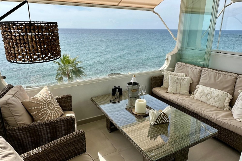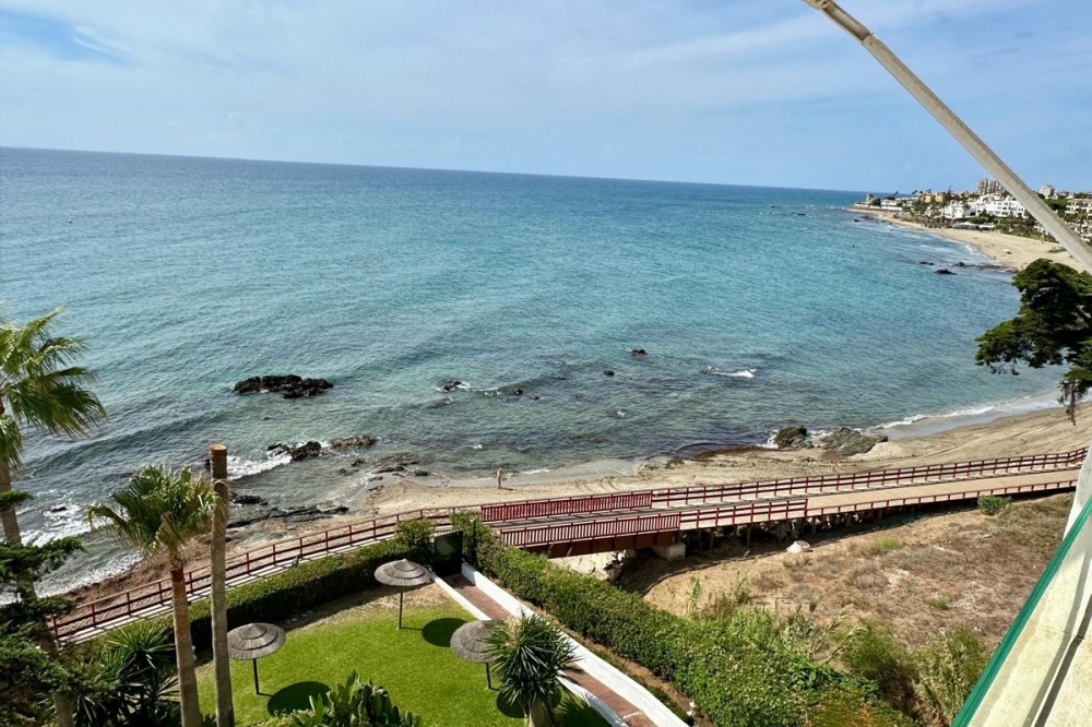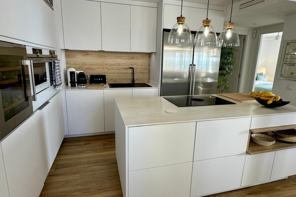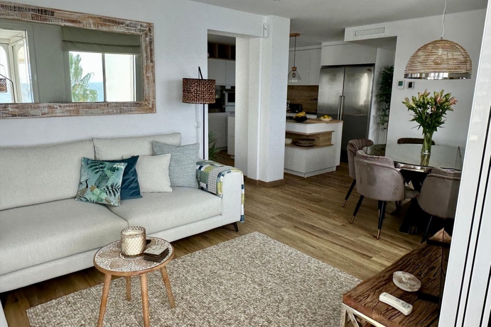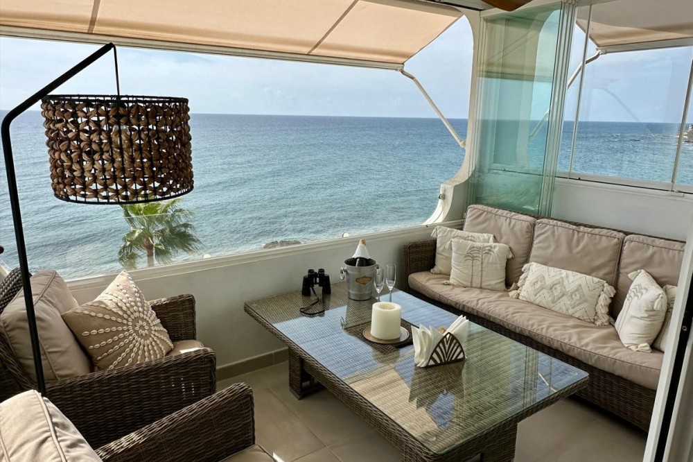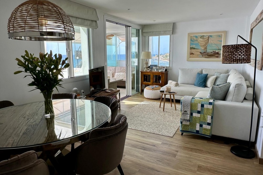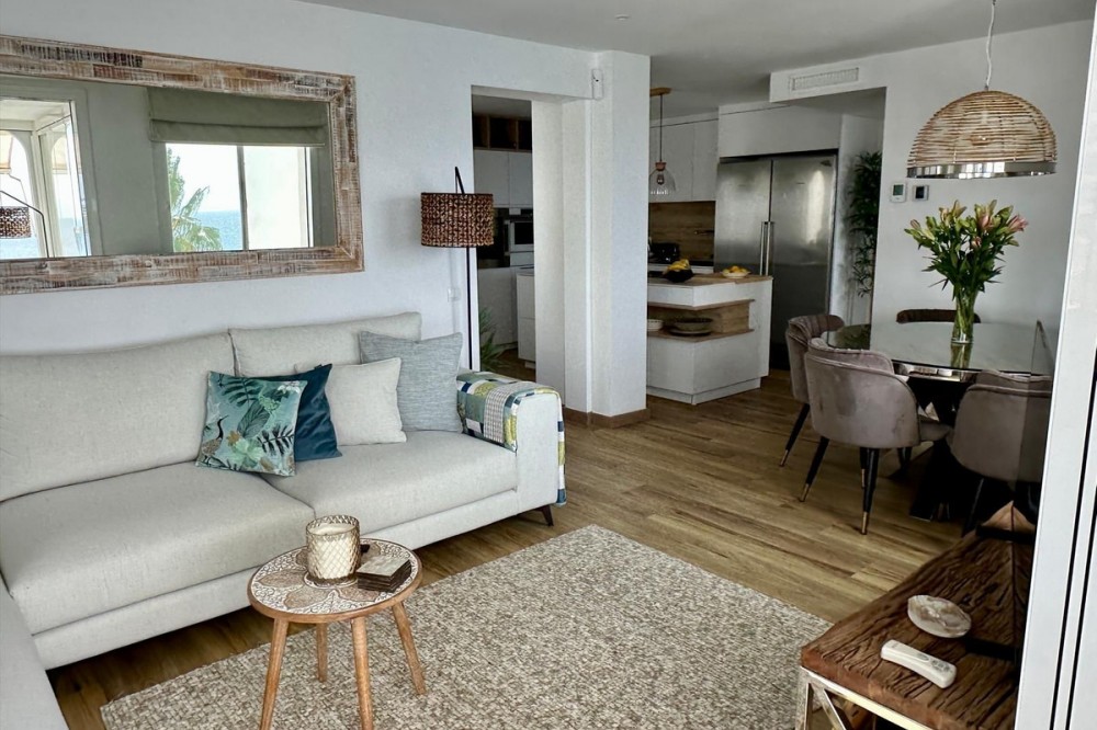 - FRONT LINE BEACH / ALOUD HOLIDAY RENTALS . Spectacular apartment on the beachfront between the Riviera del Sol and Miraflores developments in a residential area right on the coastal promenade and magnificent beach with a large garden area, a large swimming pool, and private communal parking. The apartment is unique, with two bedrooms and two bathrooms, completely renovated and refurbished, with a high-quality island kitchen, fully furnished, and a terrace that feels like you're on a balcony overlooking the sea. Additionally, with an extra, the community accepts holiday rentals, a magnificent plus to make this gem profitable.