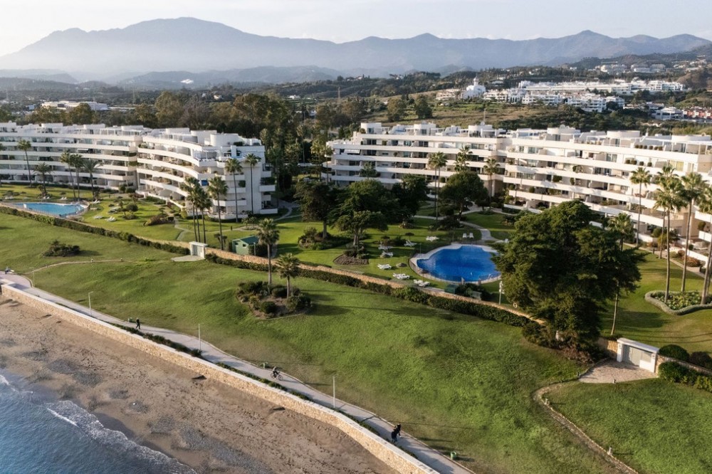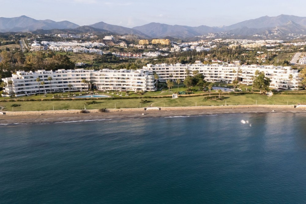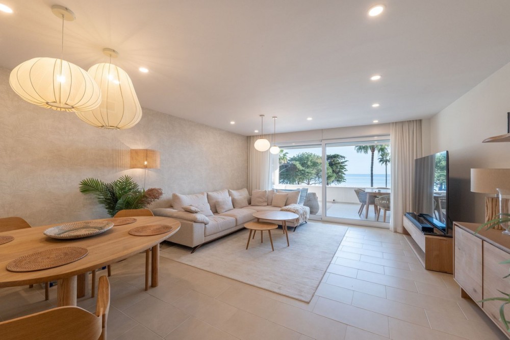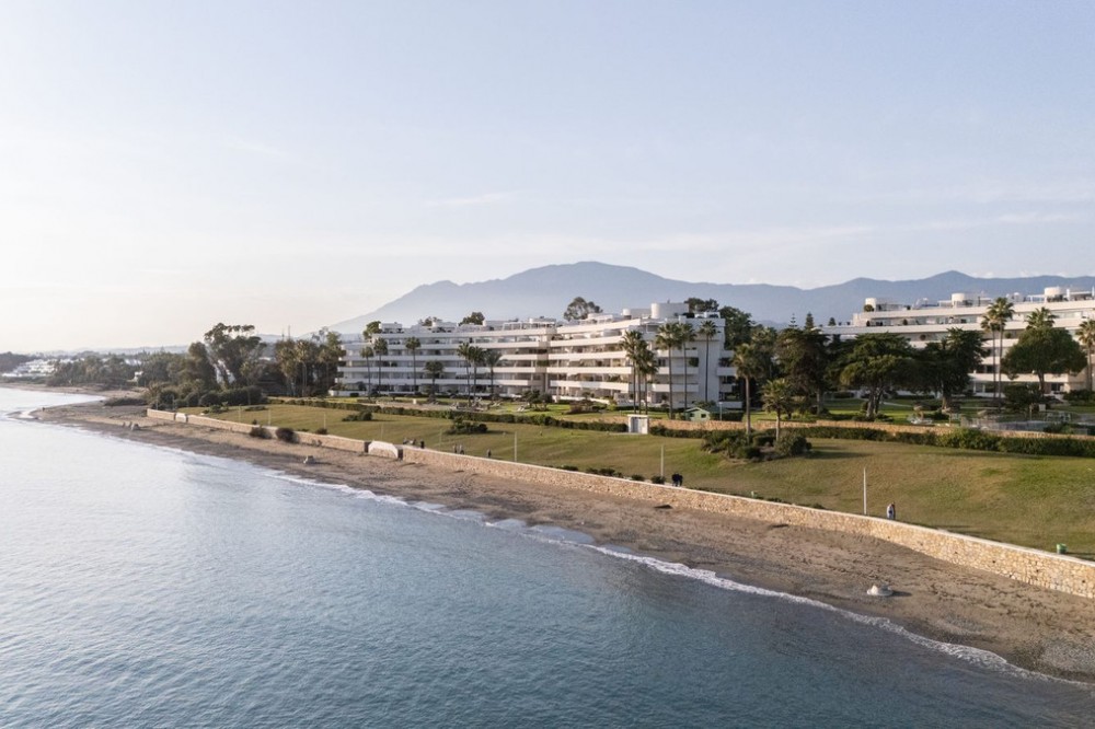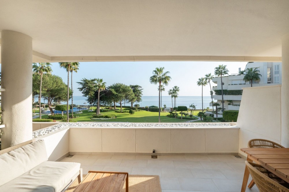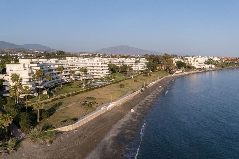 - Luxurious Apartment with Stunning Sea Views in New Golden Mile A spacious, bright, and fully renovated ground-floor apartment with a modern design and stunning direct views of the sea and the complex. This property features 2 bedrooms, 2 bathrooms, and a terrace, perfect for enjoying the breathtaking scenery. Located in the prestigious New Golden Mile, just steps away from some of the best and most beautiful beaches on the coast, this area is known for its natural beauty, convenience, and high standard of living. The interior is designed in a modern Scandinavian style with soft beige tones, creating a cozy and comfortable atmosphere. Large windows let in plenty of natural light, giving the apartment a bright and airy feel. This apartment features all new furniture from high-end brands, providing a luxurious and stylish living space. Each piece has been carefully selected to complement the modern design and offer both comfort and elegance. The complex is beautifully maintained, spacious, and situated on the front line beach. It offers residents a swimming pool, tennis courts, and lush gardens, all within a secure, gated community. The apartment is fully furnished and ready to move in. The kitchen is equipped with all necessary appliances and features a separate laundry room. Built-in wardrobes, air conditioning, and a ventilation system ensure maximum comfort. The price includes a parking space and a storage room, adding even more convenience to this fantastic property. The complex is located close to all essential amenities, including restaurants, shops, supermarkets, sports centers, and schools. Additionally, some of the best hotels on the coast and fine dining restaurants, perfect for breakfasts and dinners, are within walking distance. This fresh, stylish, and incredibly beautiful apartment is ideal for those seeking a cozy home in a quiet, prestigious area by the sea. The property is for sale.