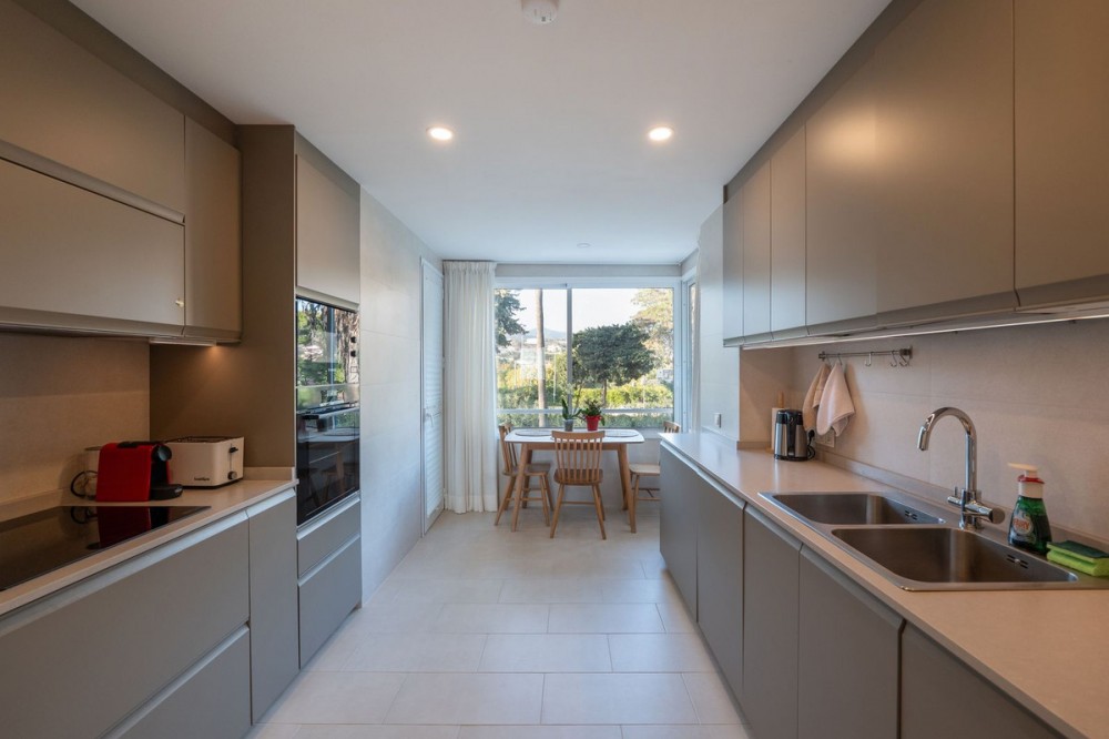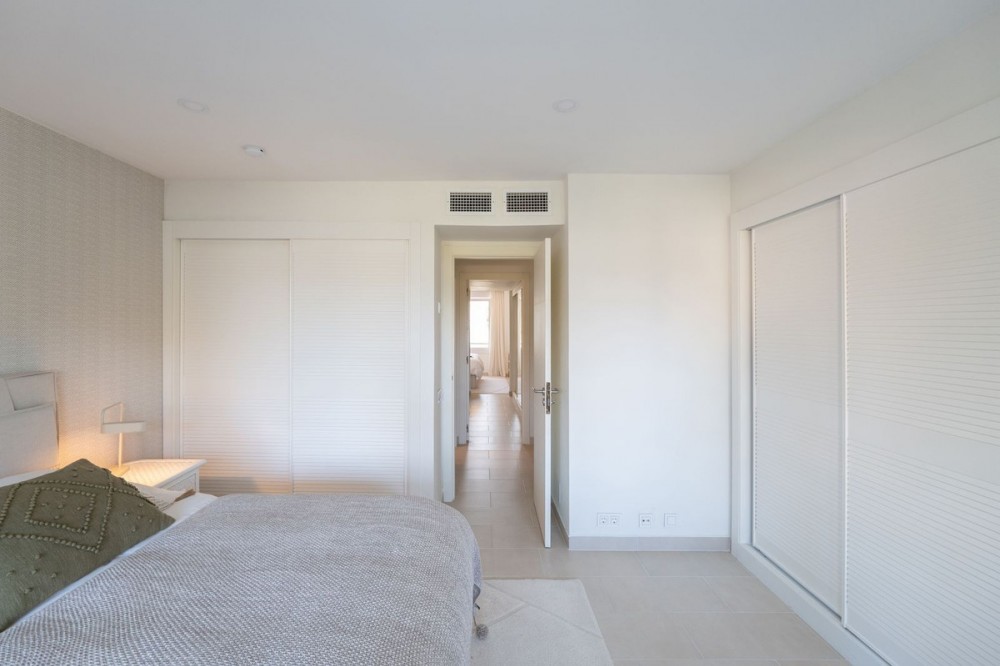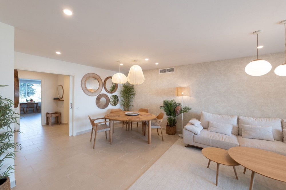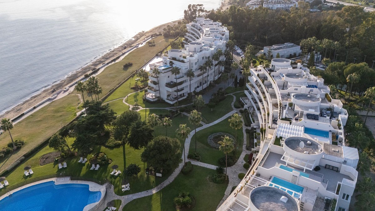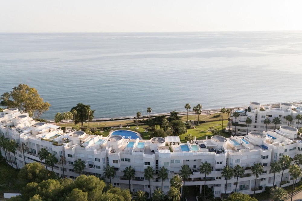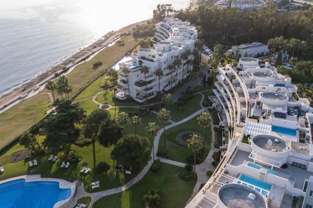 - Luxurious Apartment with Stunning Sea Views in New Golden Mile A spacious, bright, and fully renovated ground-floor apartment with a modern design and stunning direct views of the sea and the complex. This property features 2 bedrooms, 2 bathrooms, and a terrace, perfect for enjoying the breathtaking scenery. Located in the prestigious New Golden Mile, just steps away from some of the best and most beautiful beaches on the coast, this area is known for its natural beauty, convenience, and high standard of living. The interior is designed in a modern Scandinavian style with soft beige tones, creating a cozy and comfortable atmosphere. Large windows let in plenty of natural light, giving the apartment a bright and airy feel. This apartment features all new furniture from high-end brands, providing a luxurious and stylish living space. Each piece has been carefully selected to complement the modern design and offer both comfort and elegance. The complex is beautifully maintained, spacious, and situated on the front line beach. It offers residents a swimming pool, tennis courts, and lush gardens, all within a secure, gated community. The apartment is fully furnished and ready to move in. The kitchen is equipped with all necessary appliances and features a separate laundry room. Built-in wardrobes, air conditioning, and a ventilation system ensure maximum comfort. The price includes a parking space and a storage room, adding even more convenience to this fantastic property. The complex is located close to all essential amenities, including restaurants, shops, supermarkets, sports centers, and schools. Additionally, some of the best hotels on the coast and fine dining restaurants, perfect for breakfasts and dinners, are within walking distance. This fresh, stylish, and incredibly beautiful apartment is ideal for those seeking a cozy home in a quiet, prestigious area by the sea. The property is for sale.
