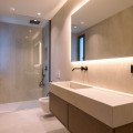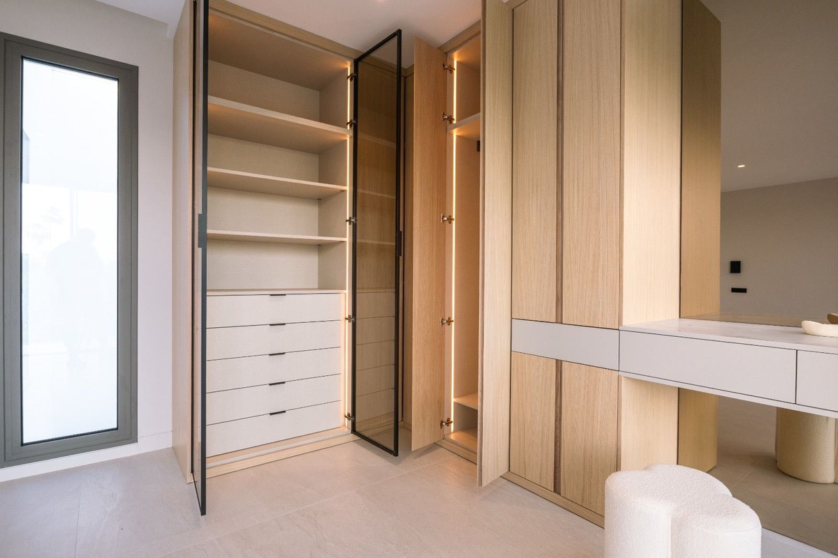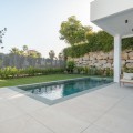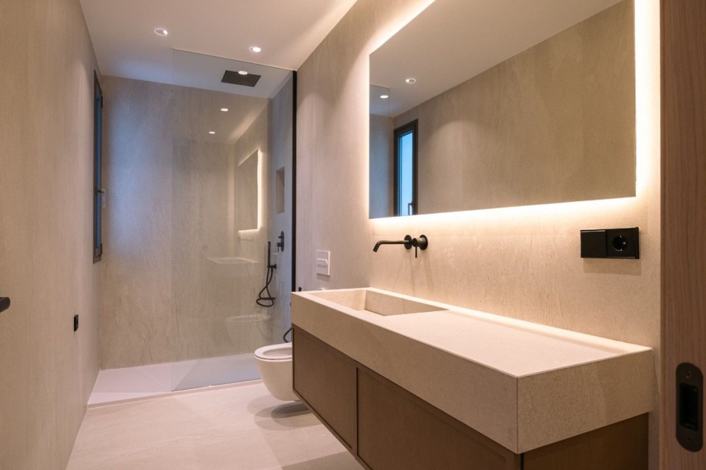 - This Brand new exclusive contemporary villa on Arena Beach offers a modern, light-filled living experience. The spacious layout includes four bedrooms, each featuring state-of-the-art en suite bathrooms and handmade wardrobes with integrated lighting. The fantastic living area boasts large windows and direct access to the pool and beautiful private garden, while the high-quality American kitchen is equipped with Siemens appliances. Practical luxury is ensured by separately adjustable underfloor heating and air conditioning throughout the house. Adding to its appeal, the basement presents versatile rooms perfect for a games room, spa, or home cinema. Only 5 minutes walk to the beach and only some minutes to the Estepona harbour.
