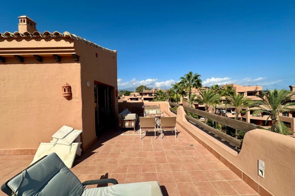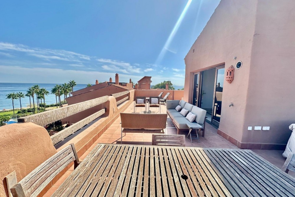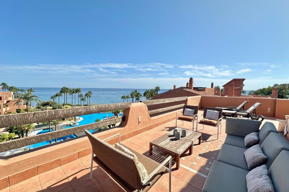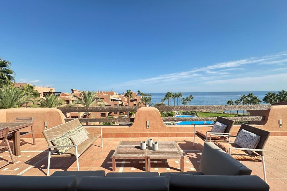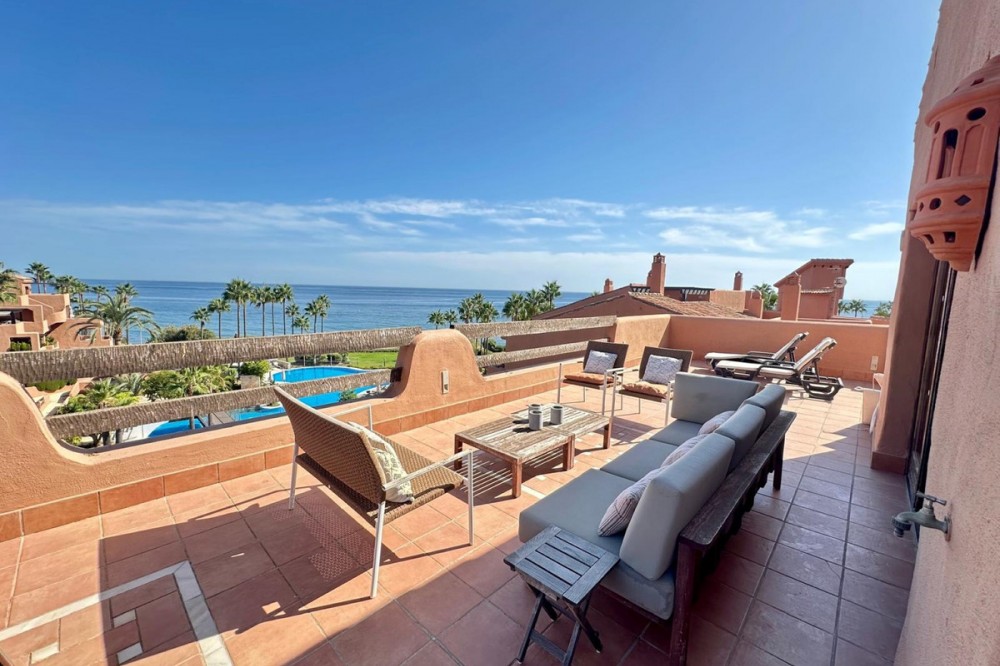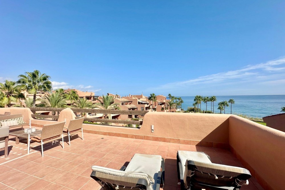 - Presenting a sophisticated penthouse situated in the exclusive Mar Azul development, East of Estepona town. This 1 bedroom, 1 bathroom property spans 80m² of meticulously maintained living space, complemented by an expansive 100m² private terrace with panoramic views to the sea and surroundings. Ideally positioned on the front line of the beach, the residence enjoys stunning panoramic, sea, garden, and pool views, offering a rare opportunity to embrace the quintessential Costa del Sol lifestyle. The penthouse is offered fully furnished and features a fully fitted and equipped kitchen, marble floors, and a spacious living and dining area that seamlessly connects to the terrace. Modern comforts include air conditioning, underfloor heating in the bathrooms, double glazing, and security shutters, ensuring a pleasant living environment year-round. There is a garage space and store room included. Residents of Mar Azul enjoy access to a wealth of communal facilities, including a heated indoor pool, gym, beautifully landscaped gardens, and a solarium. Security is paramount, with a gated community, 24-hour security service, surveillance cameras, video entrance, and a doorman. The building is equipped with a lift, and a private garage space is included, alongside ample visitor parking. The property is maintained in excellent condition, with a dedicated 24-hour service available for residents. The location is second to none, with amenities, transport links, shops, schools, restaurants, and leisure facilities all within easy reach. Golf courses, playgrounds, and the vibrant hubs of Puerto Banús, Marbella Centre, and Estepona Centre are nearby, making this penthouse an exceptional choice for those seeking a refined beachfront residence with unparalleled convenience and comfort.
