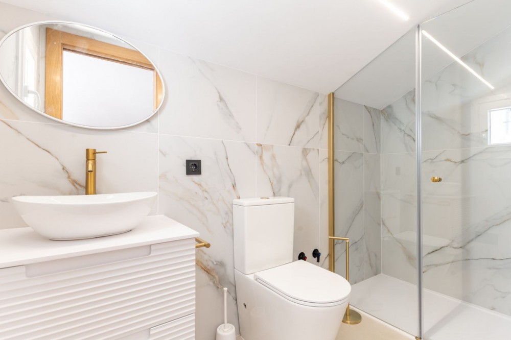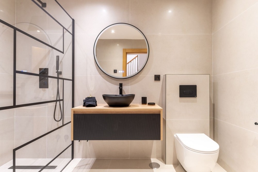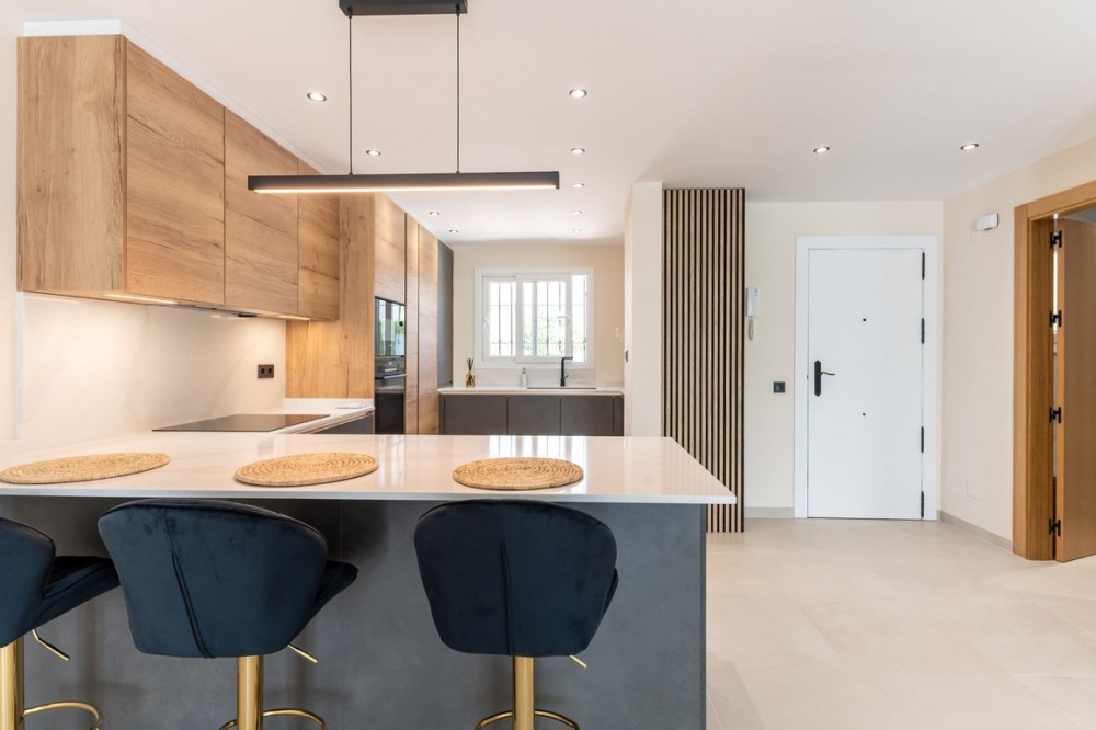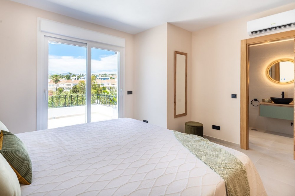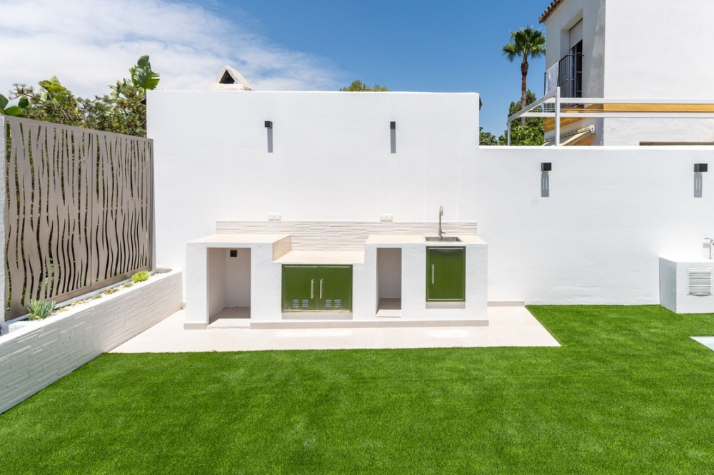 - Contemporary 4-Bedroom Home in a Secure Gated Community | New Golden Mile Perfectly located between Marbella, Puerto Banús, and Estepona, this stylish four-bedroom, four-bathroom home has been recently renovated to combine modern design, comfort, and practicality. Set within a secure gated community, it offers versatile living spaces and excellent on-site amenities. The open-plan living and dining area flows into a sleek, fully fitted kitchen with integrated appliances and a wine cooler. A contemporary fireplace creates a warm focal point, making the space ideal for both everyday living and entertaining. Each bedroom is equipped with fitted wardrobes and en-suite bathrooms. The master suite enjoys its own terrace and generous bathroom, while the top-floor suite features a private terrace and storage – perfect for guests, a home office, or a retreat. Outdoor living is a highlight, with a private back terrace, low-maintenance garden, built-in BBQ, and water feature. A spacious basement provides endless possibilities, from a cinema or gym to a games room, complemented by a separate utility area and private parking. Residents enjoy landscaped gardens, a large swimming pool, paddle court, and shared BBQ facilities, all within a secure setting with surveillance. Combining location, quality, and lifestyle, this property is an exceptional choice for families, a holiday home, or a smart investment on the Costa del Sol.