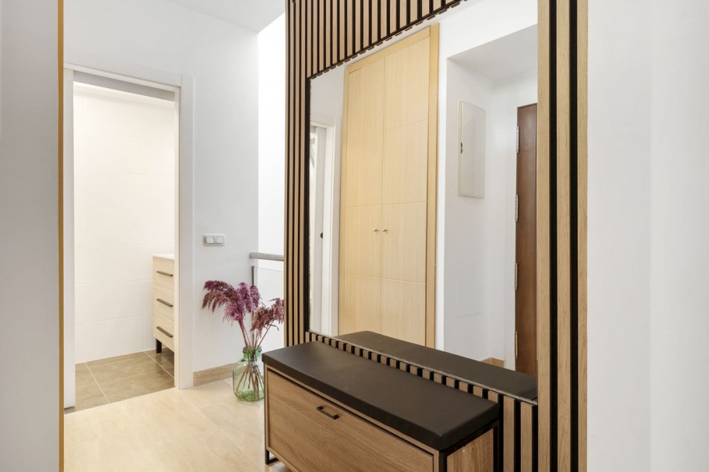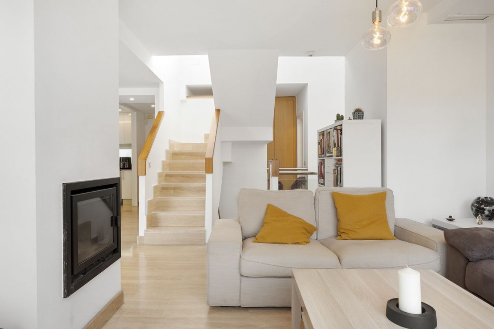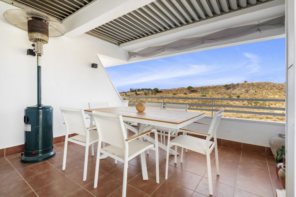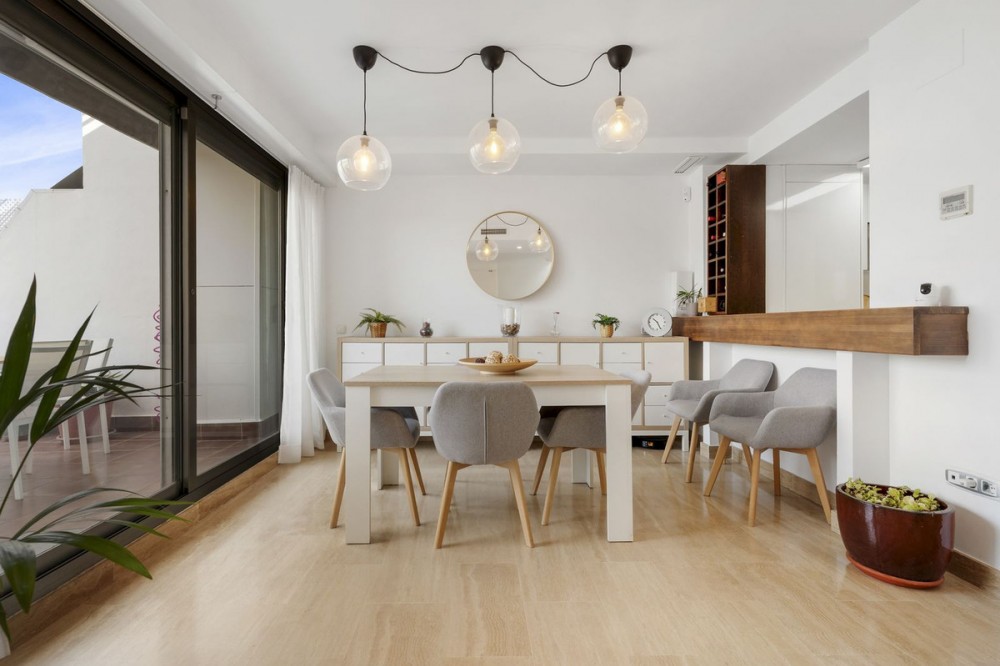 - Magnificently Presented Triplex Penthouse in La Cala de Mijas. Just a five-minute drive from the charming coastal town of La Cala de Mijas, this beautifully updated triplex penthouse apartment combines modern style, generous space, and eco-friendly living. The property is spread over three levels, beginning with a bright and inviting open-plan living and dining area with a contemporary kitchen and guest toilet. From here, doors open onto a west-facing terrace that enjoys warm afternoon sun, creating the perfect spot for relaxation. On the lower floor, you will find three larger-than-average bedrooms, all finished with new flooring. Two bedrooms are en-suite which have been modernised, and the third has a separate bathroom, which has also been updated. There is even space on this floor for an area currently used as an office. The top floor is home to a spacious rooftop terrace, also west-facing, where you can bask in the sun, entertain friends, or take in the sunsets. This floor also features a solar panel system that generates enough electricity not only to cover all consumption but also to sell excess power back to the grid, resulting in zero monthly electricity bills. Two underground parking spaces and a private storage room are included in the price, while the gated community itself offers extensive landscaped gardens with water features, three swimming pools—one of which has been recently renovated—a concierge service, and 24-hour monitored CCTV across all entrances and garages. This is a rare opportunity to secure a stylish, sustainable, and secure home in one of the Costa del Sol’s most desirable locations.