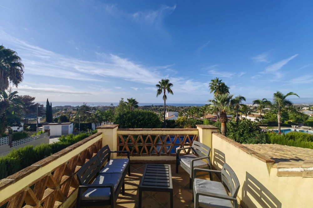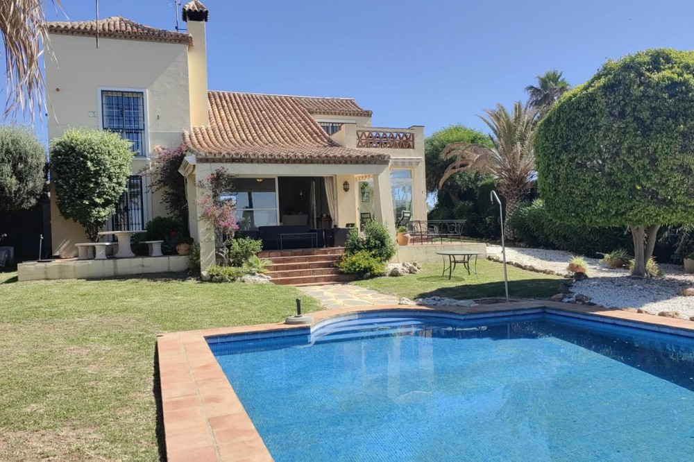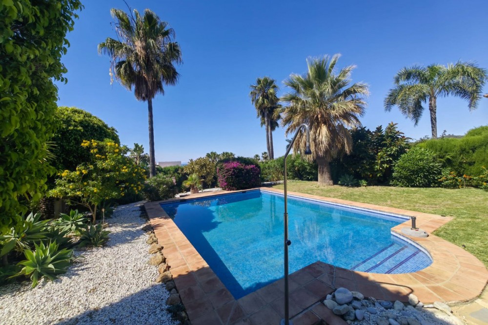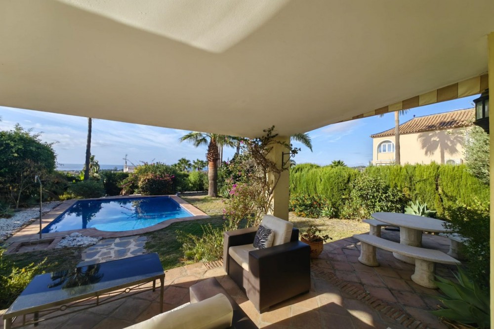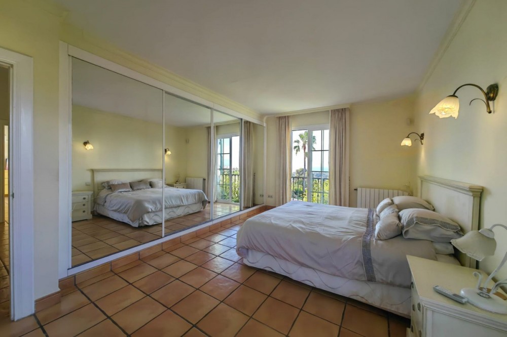 - Stunning Andalusian Villa with Panoramic Sea Views – Puerto Romano, Estepona Perched at the very top of Puerto Romano, this beautiful Andalusian-style family villa offers some of the most breathtaking panoramic views on the Costa del Sol. From sunrise to sunset, enjoy sweeping vistas that stretch from La Concha mountain to the east, across the Mediterranean Sea, Gibraltar, and the Atlas Mountains of Morocco to the west. The villa sits on a generous plot of almost 1,000 m², surrounded by landscaped gardens that ensure privacy, tranquility, and a true sense of escape. A large private swimming pool takes center stage, while an automated gate opens to the driveway with both open and covered parking. The villa comprises 3 spacious bedrooms, each with its own ensuite bathroom, plus a guest toilet. The ground floor features a large lounge with fireplace and dining area, a separate fully fitted kitchen, and a charming glassed-in west-facing dining patio perfect for enjoying sunsets all year round. From the lounge and covered terrace, the elevated position allows uninterrupted views over the pool and gardens. Upstairs, a cozy open lounge area overlooks the main living room. To the left, a bedroom suite with built-in wardrobes and ensuite bathroom opens to a large south-facing terrace with commanding sea views. To the right, another generous ensuite bedroom enjoys the same spectacular outlook. Additional features include outdoor storage cabins, fibre optic internet, alarm system, burglar bars, central heating, air-conditioning, marble floors, and a gas stove. Located just 10 minutes’ drive from Estepona town and its beaches, this villa combines traditional Andalusian charm with modern comforts in a peaceful residential community. An exceptional family home or holiday retreat to enjoy the very best of the Costa del Sol lifestyle
