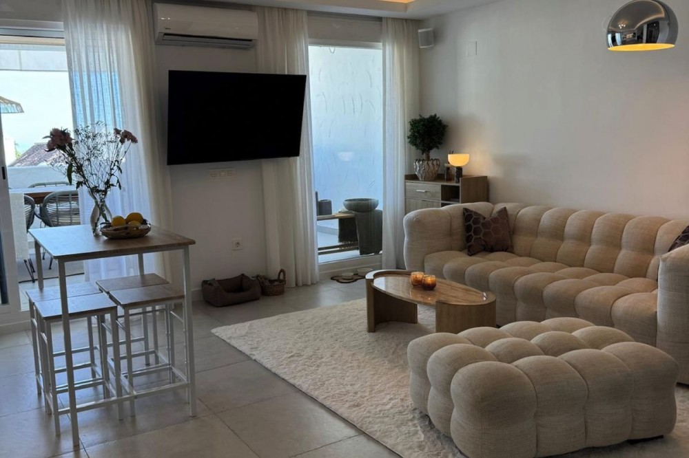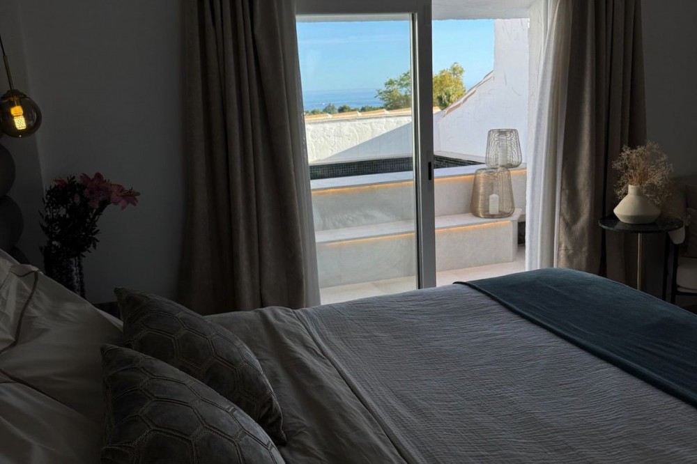 - Luxurious Duplex Penthouse in Exclusive El Dorado, Nueva Andalucía – Stunning Sea Views, Private Plunge Pool, and Prime Location! Elevate your lifestyle in this exquisite duplex penthouse, nestled in the highly sought-after El Dorado urbanization in Nueva Andalucía – a true epitome of modern Scandinavian elegance and comfort. Spanning 135 m² across two floors on the 3rd level, this fully furnished property boasts 3 bedrooms and 3 bathrooms, designed for seamless luxury living with a proven rental track record, including a valid First Occupation License (LPO) and active tourist license. The main floor features a bright open-concept kitchen equipped with top-of-the-line appliances, flowing effortlessly into a spacious living area that opens onto a south-facing terrace. This outdoor haven includes a dining table, high bar, and barbecue zone, all overlooking the expansive communal pool. The upper floor is equally captivating, with two en-suite bedrooms: the master suite complete with a walk-in closet and access to a private terrace featuring a heated plunge pool and breathtaking panoramic sea views. The second bedroom offers a west-facing terrace with serene mountain vistas, perfect for afternoon unwinding. Key Features: Outdoor Excellence: Three terraces (two south-facing and one west-facing) for sun-soaked relaxation, plus lush communal gardens and a large swimming pool. Secure and Convenient: Gated community with security, two underground parking spaces, and low community fees. Contemporary Furnishings: Fully equipped in a sleek modern style, ready for immediate occupancy or high-yield rentals. Unbeatable Location: Steps from Centro Plaza's restaurants, supermarkets, and shops; close to the beach and glamorous Puerto Banús, blending convenience with exclusivity. This duplex penthouse isn't just a home – it's a savvy investment in luxury, functionality, and profitability on the Costa del Sol. Contact us today to arrange a viewing and secure this exceptional opportunity!