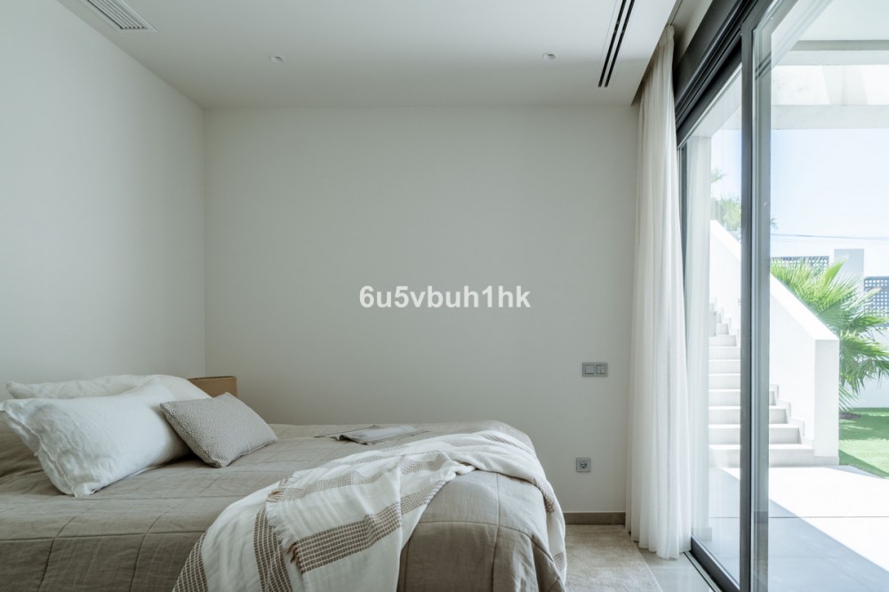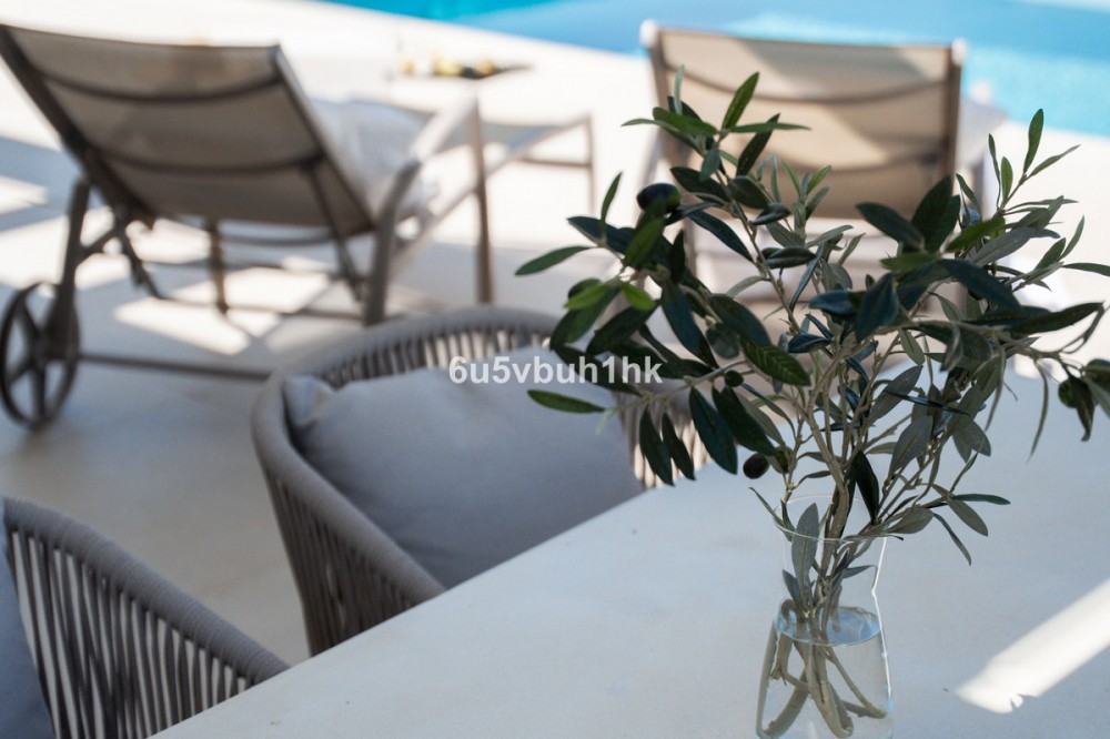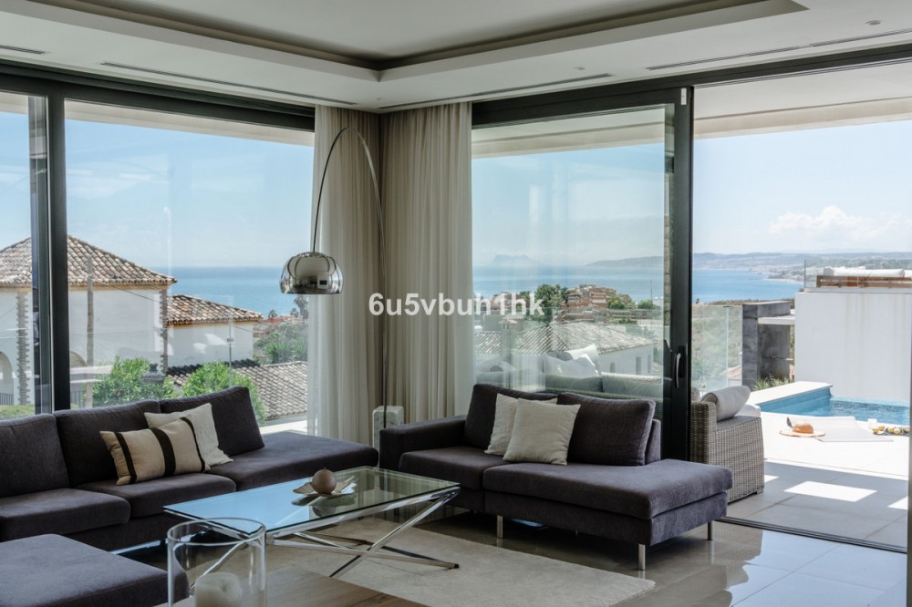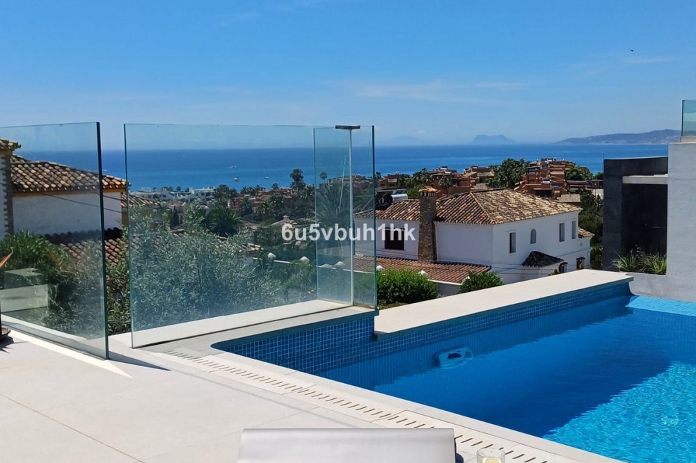 - Huge price drop! We present you to our new exclusive listing: a modern luxury villa located in the privilged area of Seghers in Estepona. This stunning property, built with top-quality materials, is the ideal retreat for those seeking a sophisticated coastal lifestyle. Enjoy panoramic views of the Mediterranean Sea, the African coastline, and Gibraltar from every corner of this spectacular villa. With five bedrooms and four full bathrooms, plus a guest toilet, the home offers generous and elegant living space. Two of the bedrooms are en-suite and include private dressing rooms, creating an oasis of comfort and privacy. All rooms open onto the terrace, filling the interiors with natural light and offering breathtaking views of the garden, sea, and mountains. The bedrooms are equipped with electric blinds and bathrooms with underfloor heating. The villa is distributed over two floors plus a solarium, connected in a functional and harmonious layout. It can be accessed from both the ground and first floors for greater convenience. The ground floor hosts four cozy bedrooms, three full bathrooms, a TV room, laundry room, and a practical storage area. One of the bedrooms is en-suite and features a spacious walk-in wardrobe. The first floor includes a spacious and bright living-dining area that flows into an open-plan kitchen designed by Decodan Studios and equipped with Miele appliances. This space is perfect for both daily life and entertaining guests, with access to the terrace and chill-out area. Outside, enjoy a heated infinity pool with a counter-current swimming system—ideal for exercise and relaxation under the sun. Also on this floor there is another en-suite bedroom with dressing area and additional guest toilet. The solarium, accessible via an external staircase, offers a private sanctuary with unmatched views—ideal for unwinding or watching unforgettable sunsets. Its layout allows for installing a jacuzzi or an outdoor kitchen, enhancing your outdoor living experience. The villa is surrounded by a low-maintenance garden with an automatic irrigation system, creating a peaceful, green environment. From the garden to the pool and rooftop terrace, every corner invites you to enjoy outdoor living. Additional features include private parking with an automatic gate and extra storage rooms for bicycles and equipments. Located in a quiet, secure residential area, the villa is just five minutes’ walk from the beach and the promenade. Estepona's marina and the old town is also within walking distance. With nearby schools, restaurants, supermarkets, gym, padel-, tenis- and golfcourses, the area is ideal for permanent or holiday living. Don’t miss this opportunity—schedule your visit today and let this unique Mediterranean gem become your new home.