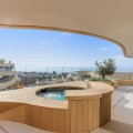 - Discover a unique 3-bedroom middle floor at the corner of the building, where no one lives above you—offering privacy, light, and a peaceful ambiance rarely matched. The living room flows directly into the main bedroom through a sliding glass wall, allowing you to open up the space fully when you choose or close it for intimacy. With an extended living area that stretches to a side terrace framed in full-height glass, you’ll enjoy sweeping Mediterranean views from multiple perspectives. Throughout, rich wooden floors are complemented by real wood accents along the walls and ceilings, adding warmth, texture and natural character to every room. Step outside and sink into your private jacuzzi under the stars in your own outdoor sanctuary. This home combines architectural elegance with resort-level living, all wrapped in a layout that feels expansive, airy, and absolutely exceptional.