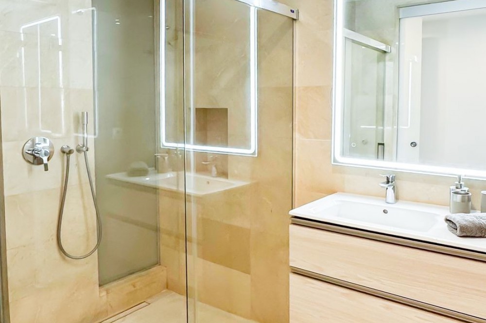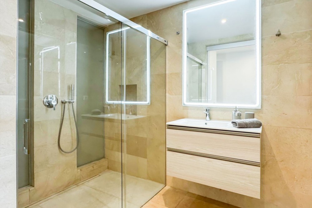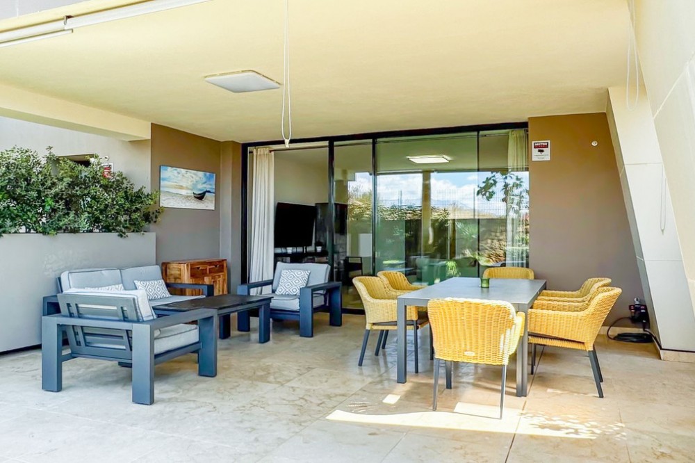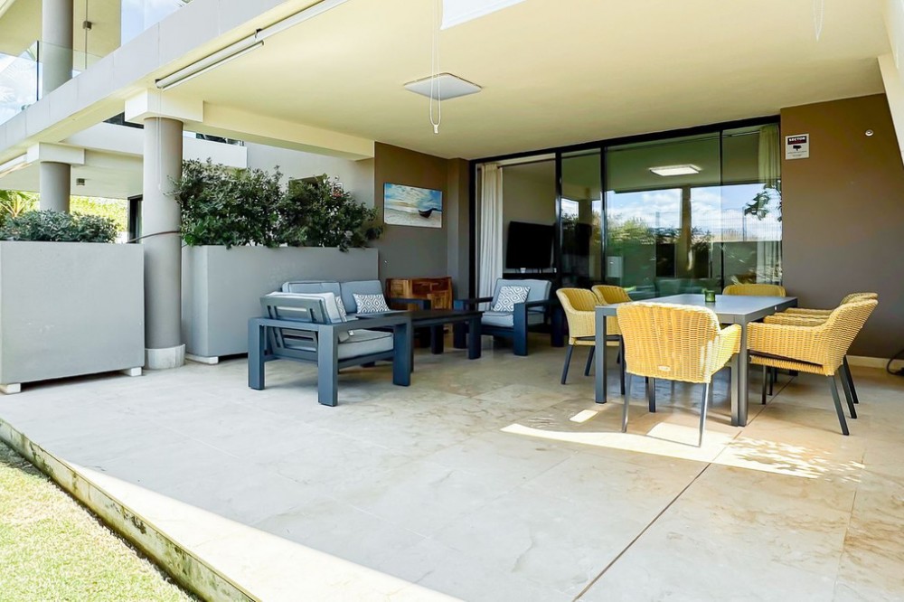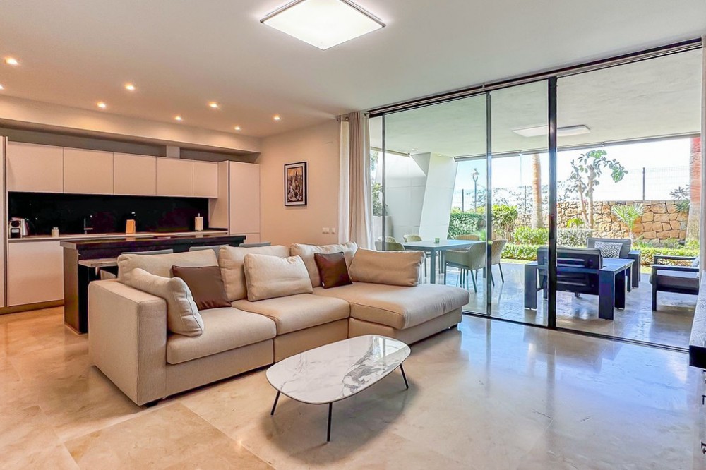 - Ground Floor · La Montesa de Marbella (Cabopino) A bright and elegant garden apartment in La Montesa de Marbella, where modern architecture meets the laid-back lifestyle of Cabopino. The open-plan living and dining room opens completely through floor-to-ceiling glass doors, creating a seamless connection with the spacious terrace, covered porch and private garden. The design gives you the feeling of living in a villa while enjoying all the convenience of a luxury apartment. Inside, both bathrooms are finished to a high standard with underfloor heating, while the kitchen comes fully fitted with top-quality appliances. The apartment is full of thoughtful details: electric blinds, premium wood and stone finishes, and carefully chosen wall materials that enhance both comfort and acoustics. A separate utility room adds extra practicality. Features • 2 bedrooms · 2 bathrooms • Private garden, terrace and covered porch • Floor-to-ceiling sliding windows opening fully to the outdoor space • High-end kitchen appliances and luxury finishes • Underfloor heating in both bathrooms • Utility/laundry room · Electric blinds • Underground parking space and private storage room • Secure gated community with 24-hour security, alarm system and CCTV • Beautiful landscaped gardens and a large communal pool • Excellent location within walking distance of Cabopino marina, beaches and golf