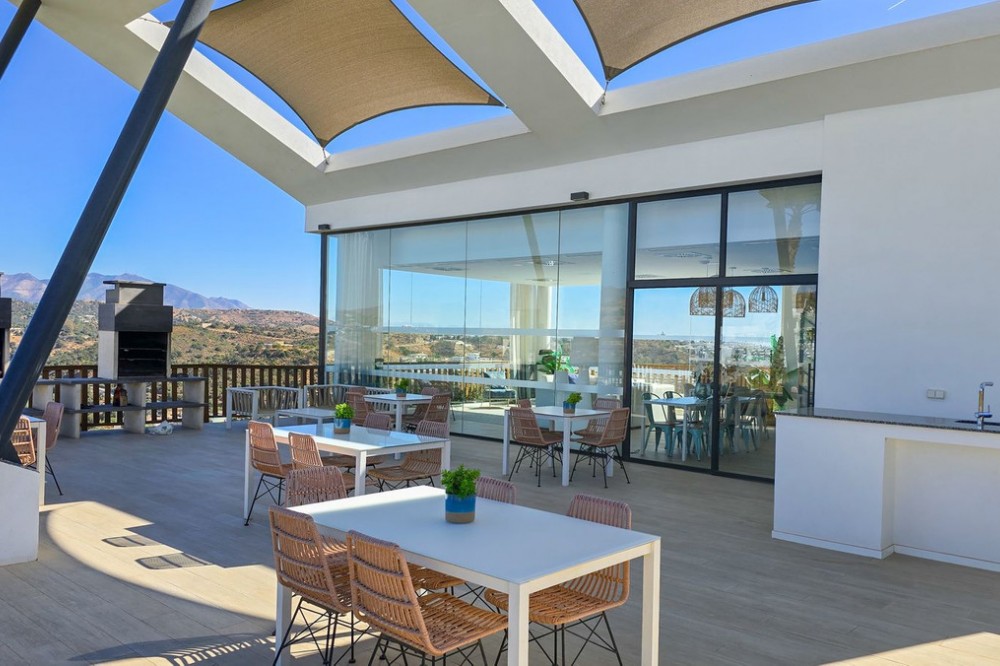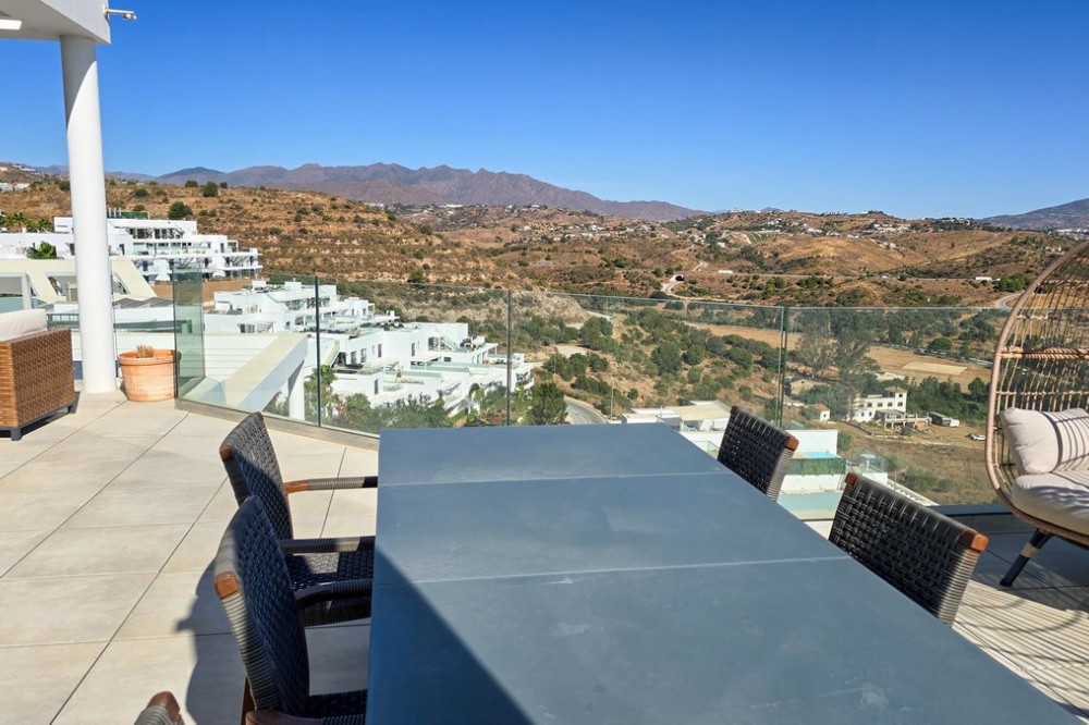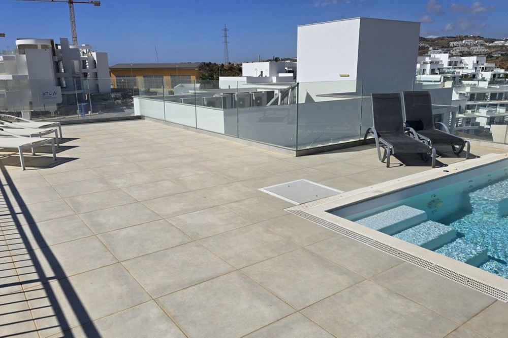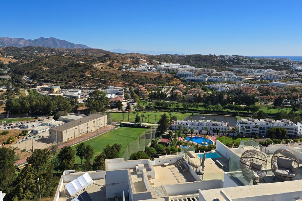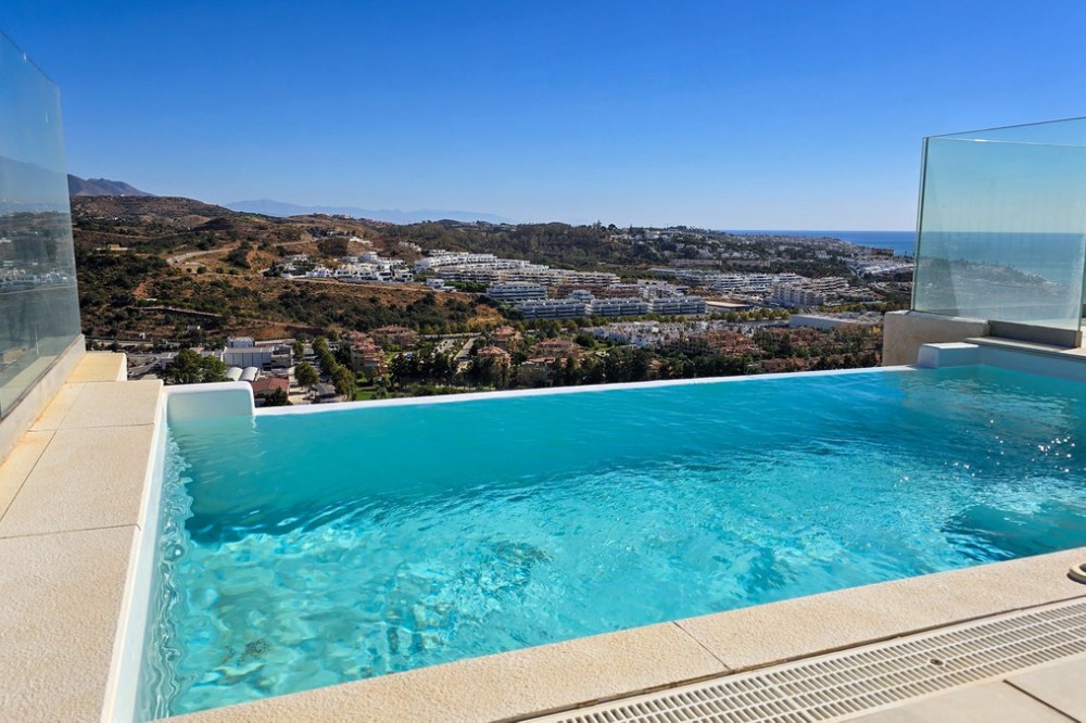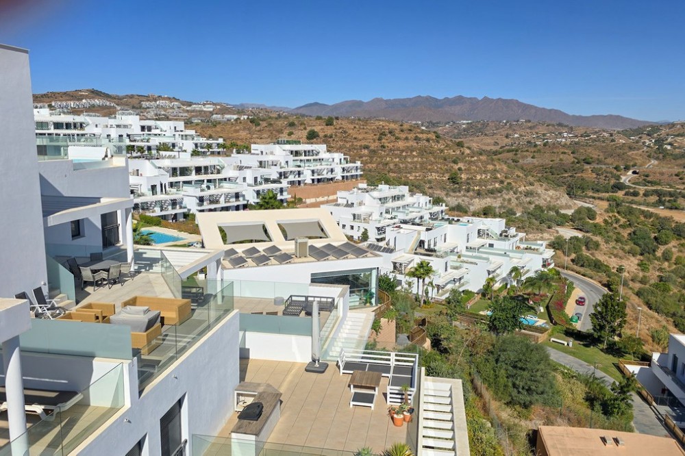 - This penthouse in La Cala de Mijas offers 4 bedrooms, 3 bathrooms, 124m² of interior space and nearly 200m² of terraces with a private pool, set within the Casa Banderas complex completed in 2019. Located in an elevated position above La Cala de Mijas, this penthouse offers sweeping views over the town, surrounding landscapes, and the Mediterranean. The interior layout is designed with open-plan living, generous windows that flood the rooms with natural light, and seamless access to the large terraces. The spacious kitchen and dining area connect effortlessly with the lounge, creating an ideal space for both everyday life and entertaining. The highlight of this home is the spectacular terrace of almost 100m², featuring a private pool, chill-out corners, and areas for outdoor dining, sunbathing, or evening gatherings. With four comfortable bedrooms, including a master suite with its own terrace access, this property ensures both privacy and convenience. Two underground parking spaces and a storage room are included in the price of €1,150,000. Casa Banderas is a highly regarded development, offering resort-style amenities such as landscaped gardens, multiple swimming pools, a fully equipped gym, spa, sauna, padel court, and social-gourmet spaces. Families will appreciate the children’s play areas, while wellness and sports lovers can enjoy yoga decks and relaxation zones. Security and concierge services complete the sense of exclusivity. La Cala de Mijas is renowned for its charming atmosphere, sandy beaches, and vibrant local scene with restaurants, shops, and golf courses within easy reach. The penthouse is just minutes from La Noria Golf and a short drive from Marbella, Málaga airport, and other Costa del Sol hotspots. This unique resale penthouse in Casa Banderas combines contemporary design, prime location, and exceptional amenities. A rare opportunity to own a property of this standard in La Cala de Mijas.