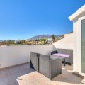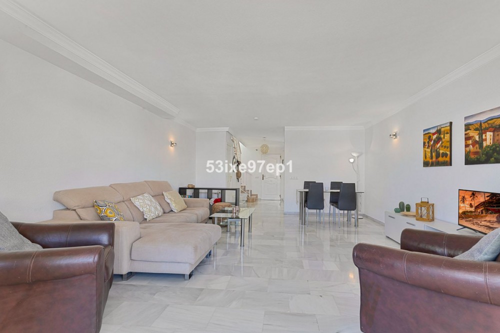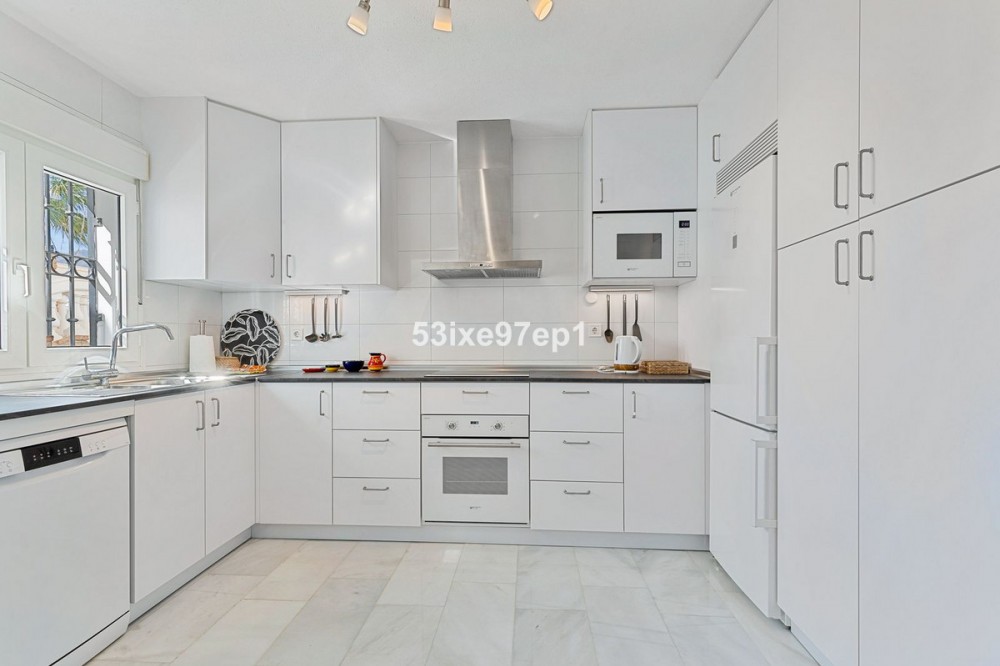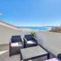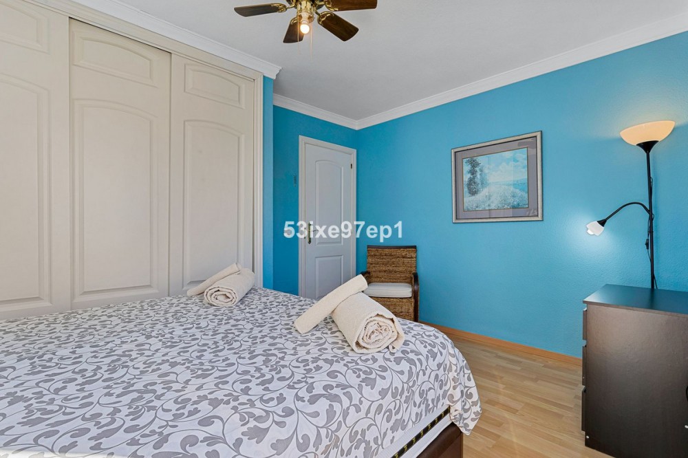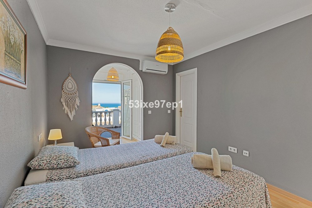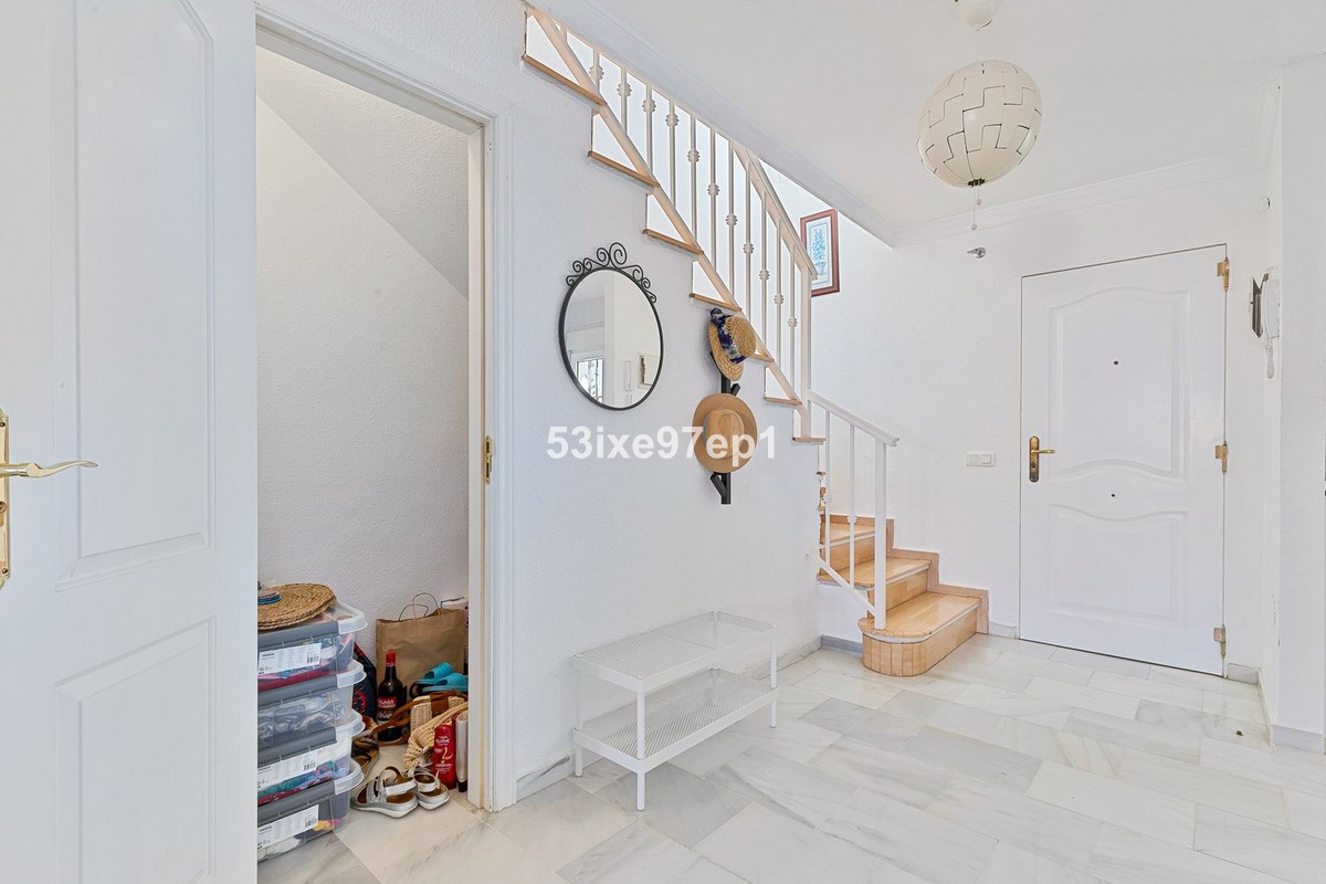 - Welcome to this lovely townhouse in a quiet area with fantastic sea views of the entire beach and the port of Fuengirola from the roof terrace! On the entrance floor we find directly to the left the renovated, fully equipped and open kitchen with views of the mountains. Straight ahead we come to a spacious living room with plenty of space for both a dining area and a sofa group. From here we come out to a spacious terrace facing east, which is why it can be used with advantage even during the hottest summer months. On this floor we also find a lockable storage room. Upstairs are the two bedrooms, of which the master bedroom has its own bathroom en suite where the washing machine is and its own terrace, also facing east, with beautiful views down to the sea. Another flight of stairs leads to the roof terrace facing west with a magical view down to the entire coastline of Carvajal/Torreblanca/Los Boliches and Fuengirola and towards the mountains to the northwest. There is also a spacious storage room here for cushions etc. and which could be converted into an outdoor kitchen. The community offers a very nice green area and a community pool. The townhouse also comes with a parking space in the garage. The house is located above the wonderful and wide beach in Carvajal where the beach restaurants La Cubana and Kalifato offer fantastic food and drinks to the bathers. It is a five-minute walk down to the beach. The train station in Carvajal is about 15 minutes away and the bus stop is 10 minutes away. Nearby we also find a gas station and a small supermarket.
