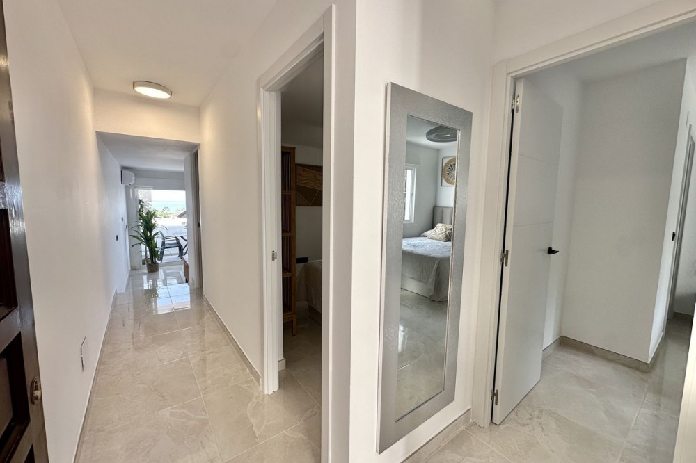 - NEWLY RENOVATED SEAVIEWS 2-BEDROOM 2 BATHROOMS APARTMENT JUST 500M FROM THE BEACH LA CALA This stylish, brand-new 2-bedroom apartment is located on the first floor of the charming Pueblo Andaluz complex in Torrenueva — just 500 metres from the beach and a short, pleasant walk into La Cala de Mijas. Please note: FIRST FLOOR NO LIFT Recently renovated to a high standard and never lived in, the apartment offers a fresh, modern interior with a bright and well-planned living space. Large windows and patio doors open onto a private terrace with beautiful sea views, filling the home with natural light. Residents can enjoy access to a beautiful communal pool area, which includes a large swimming pool, a separate children’s pool, and lush tropical gardens — a true oasis just steps from your front door. Located within walking distance to El Bombo beach, local shops and supermarkets, and the buzzing Jardin Botánico area with its great selection of bars and restaurants, this apartment is perfectly positioned for both holidaymakers and permanent residents alike. Short-term holiday rentals are permitted, making this not only a perfect personal getaway but also a smart investment opportunity with excellent rental potential. A hassle-free investment in a prime location with strong national and international demand. Don’t miss this unique opportunity to own a modern home, ready to enjoy or rent out from day one. Additionally, there’s a Lidl supermarket just a few minutes’ walk away, and the A7 motorway is less than 1-minute drive, giving you quick and easy access to the entire Costa del Sol. Despite its proximity to the road, the apartment enjoys a peaceful setting. HOLIDAY RENTALS PERMITTED with an increase of 20% of the community fees for the properties with the tourist license Ideal for a couple, a couple with a child as a permanent or holiday home. 200M - are restaurants, bars - Jardin Botanico strip 600M - Lidl supermarket 500m - El Bombo beach 800m - Avenida de Rota more restaurants and a supermarket The complex will undergo rehabilitation and painting in May and this will give a new face lift to the entire complex. Add on fees have been collected by every resident since September until May Middle Floor Apartment, La Cala de Mijas, Costa del Sol. 2 Bedrooms, 2 Bathrooms, Built 75 m², Terrace 7 m². Setting : Close To Golf, Close To Shops, Close To Sea, Close To Schools, Urbanisation. Orientation : East, South East, South West. Condition : Excellent, Recently Renovated. Pool : Communal. Climate Control : Air Conditioning, Hot A/C, Cold A/C. Views : Sea, Panoramic, Garden, Urban, Street. Features : Covered Terrace, Near Transport, Private Terrace, Ensuite Bathroom, Double Glazing. Furniture : Optional. Kitchen : Fully Fitted. Garden : Communal. Parking : Open, Street, More Than One. Utilities : Electricity. Category : Holiday Homes, Resale.