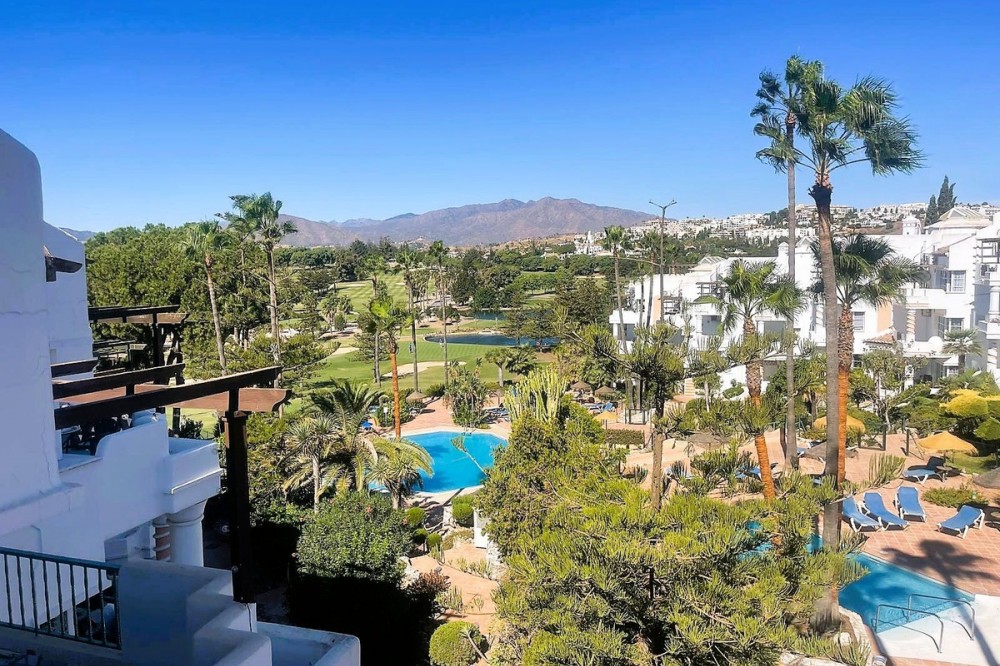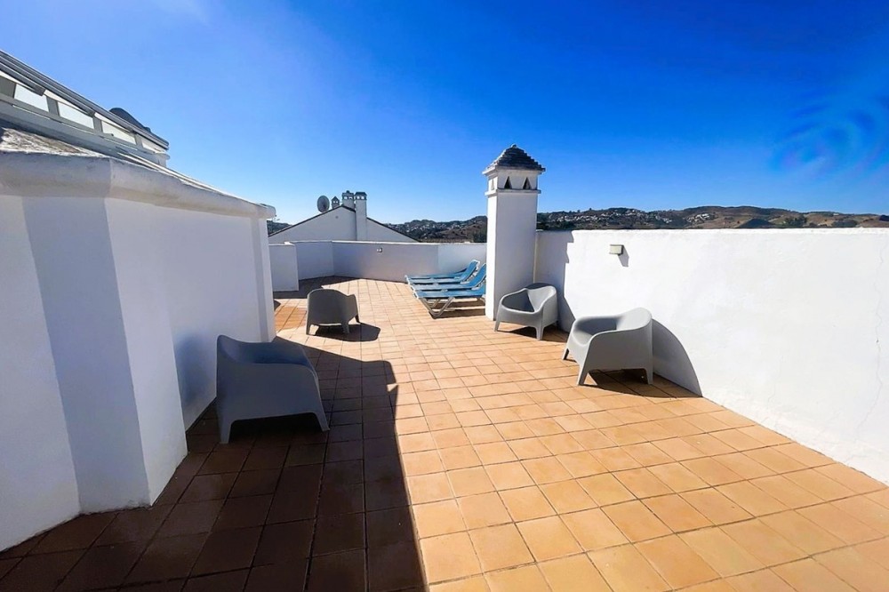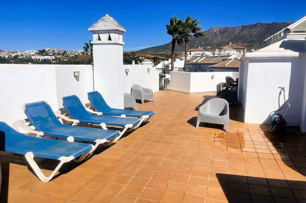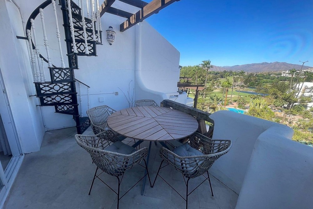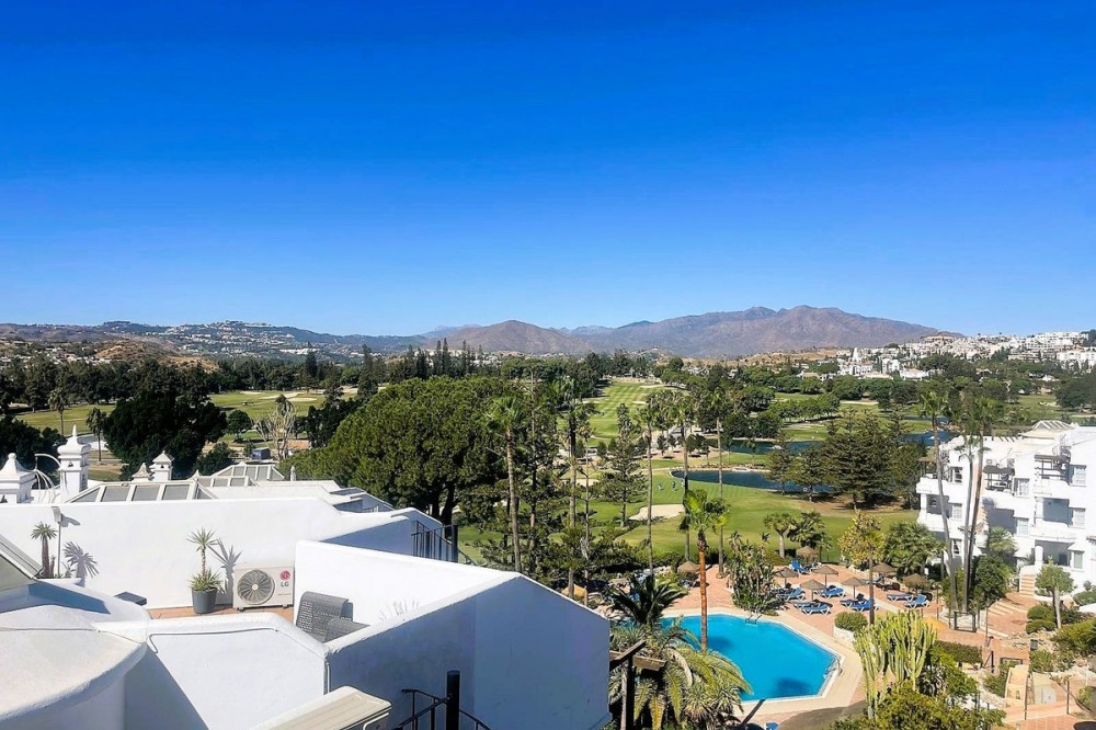 - Beautiful frontline golf penthouse with solarium and holiday rental license – Mijas Golf Located in an exclusive resort-style development, this charming penthouse offers the perfect balance of comfort, style, and natural surroundings. The community features two swimming pools and beautifully maintained gardens. The property offers 2 bedrooms, 2 bathrooms, a bright living-dining room with direct access to the terrace and a private solarium, ideal for enjoying the sun and the views. The kitchen is separate and fully equipped. It is sold furnished and ready to move in. Recently renovated, the penthouse is in very good condition, offering a fresh and modern atmosphere. Its location next to the golf course makes it ideal both as a permanent residence and as a holiday rental investment. Don’t miss this opportunity to live or invest in one of the most peaceful and attractive areas of the Costa del Sol.