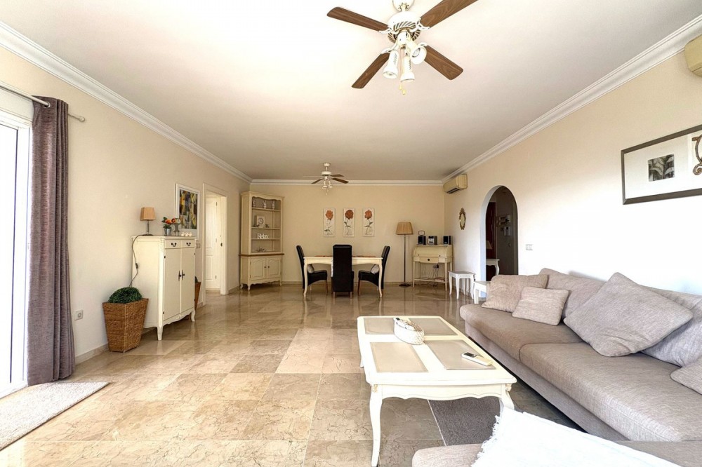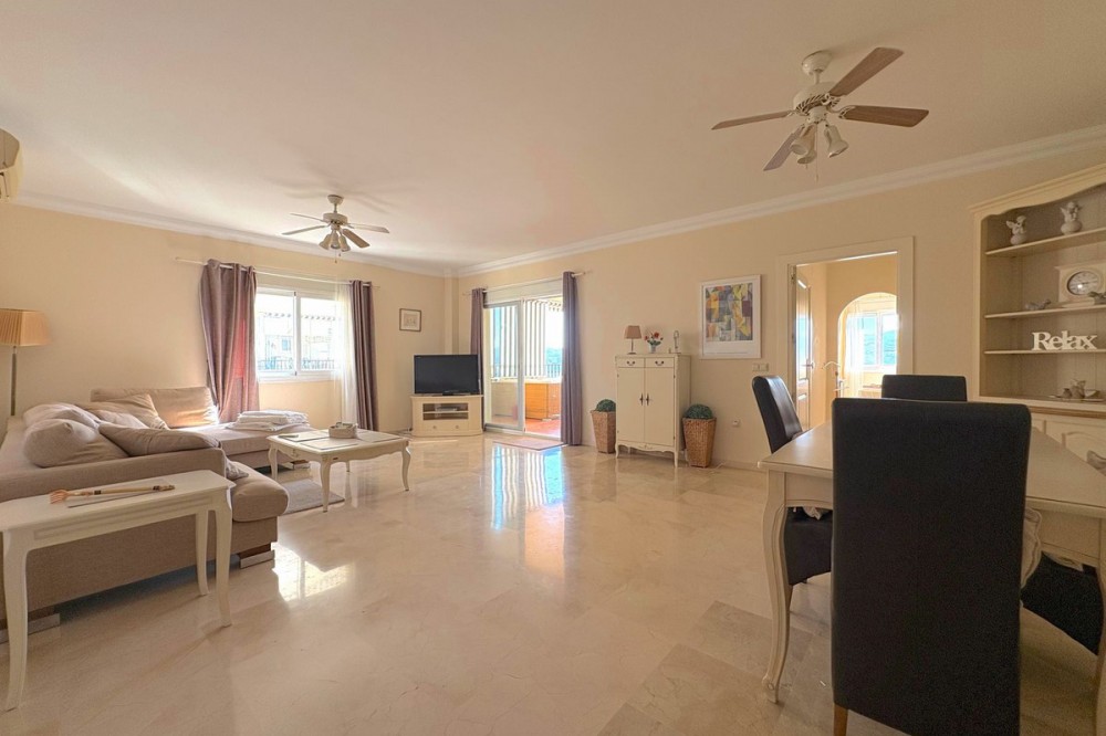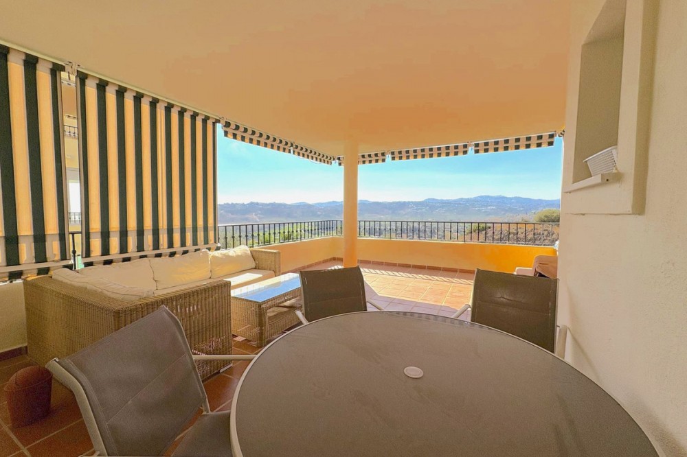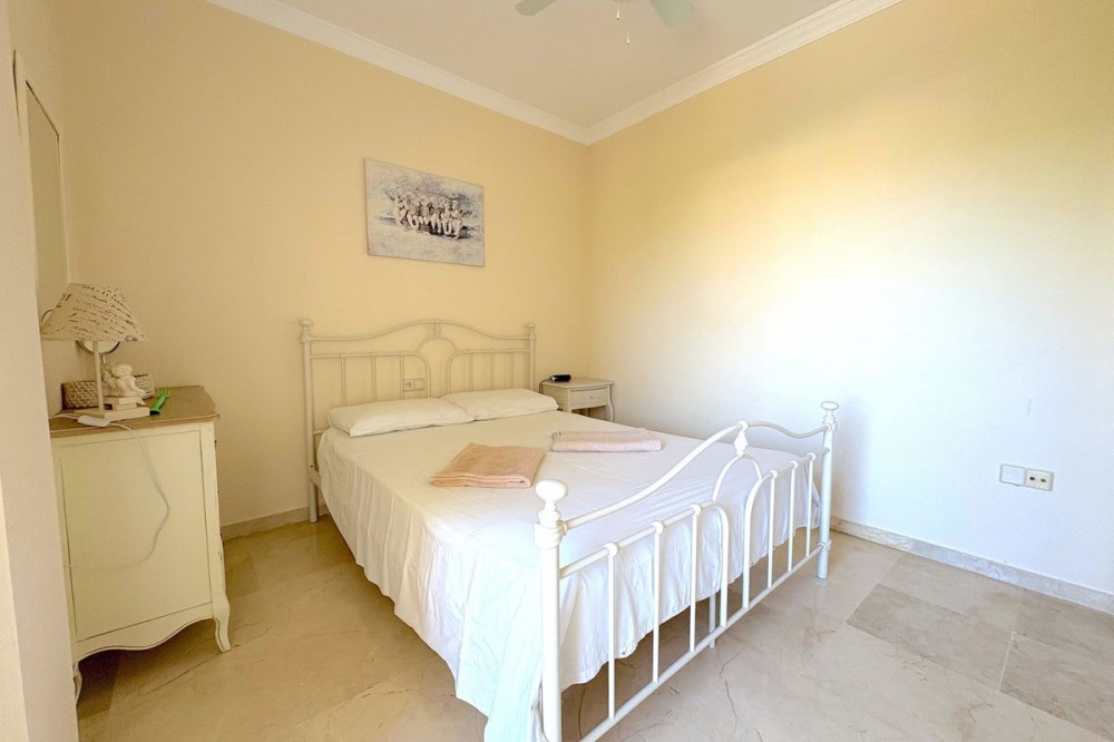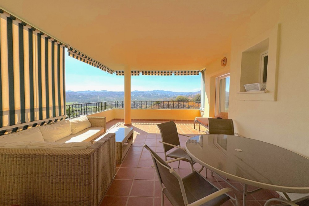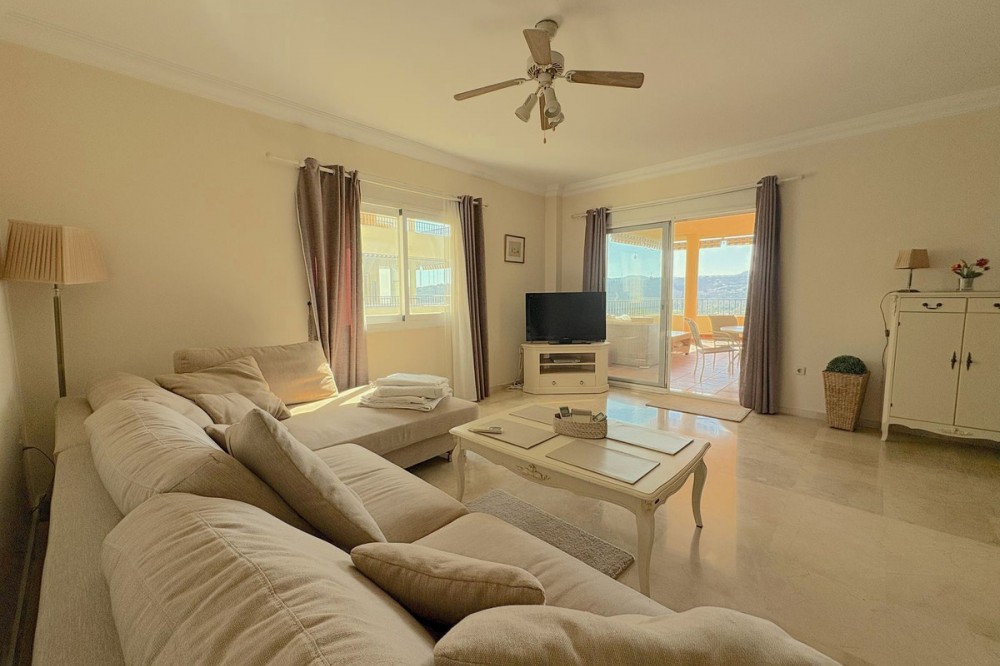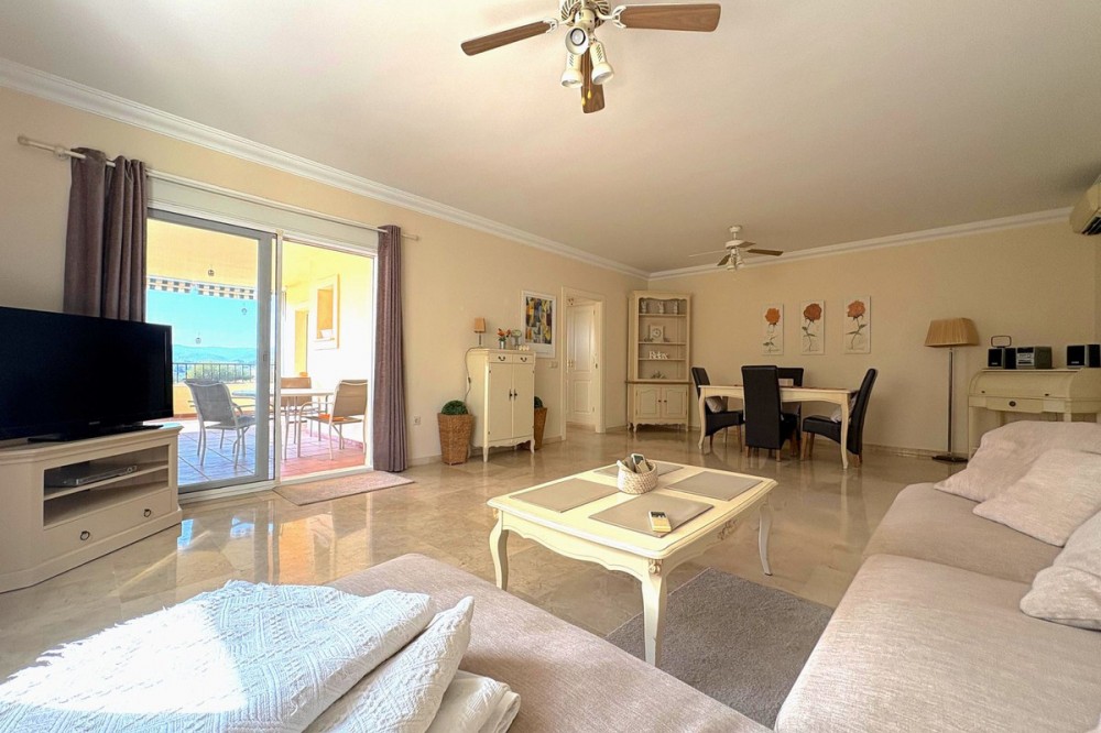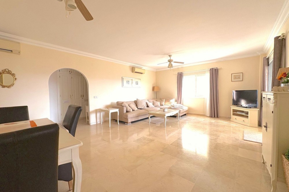- Expansive and tastefully decorated, this three-bedroom, two-bathroom apartment spans 116 m2 and features a spacious 42m2 lounge. The larger of the two terraces, measuring 33m2, faces East, providing breathtaking panoramic views of the picturesque landscape stretching towards Santana Golf. Meanwhile, the smaller terrace overlooks the pristine main pool and meticulously landscaped garden. Each room is equipped with individual air conditioning units for personalized comfort. The interior boasts high gloss marble floors throughout, and the kitchen is fully fitted with modern appliances. Additional amenities include underground parking, storage, a safe, video-entrance, and more. The apartment is offered unfurnished, with room for negotiation.