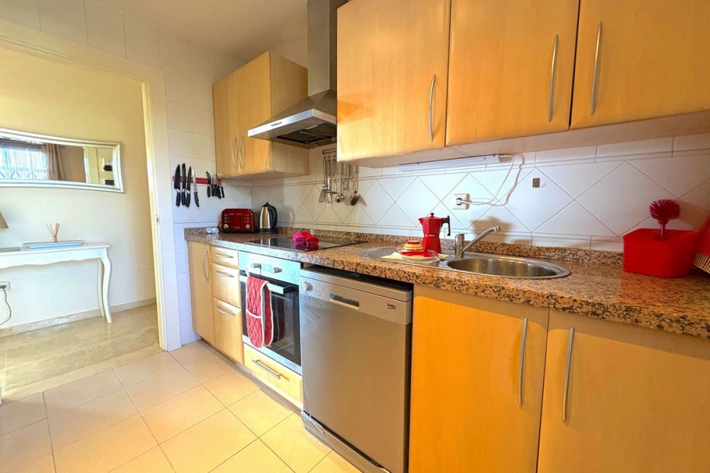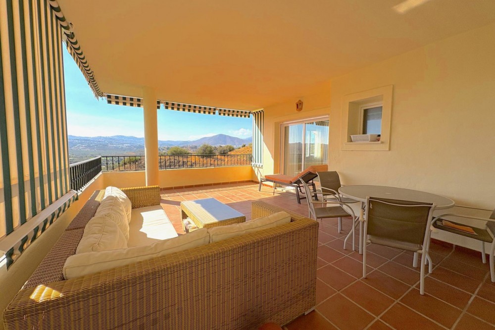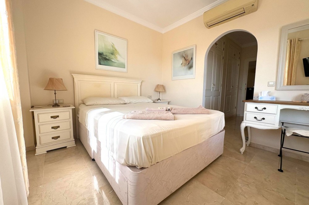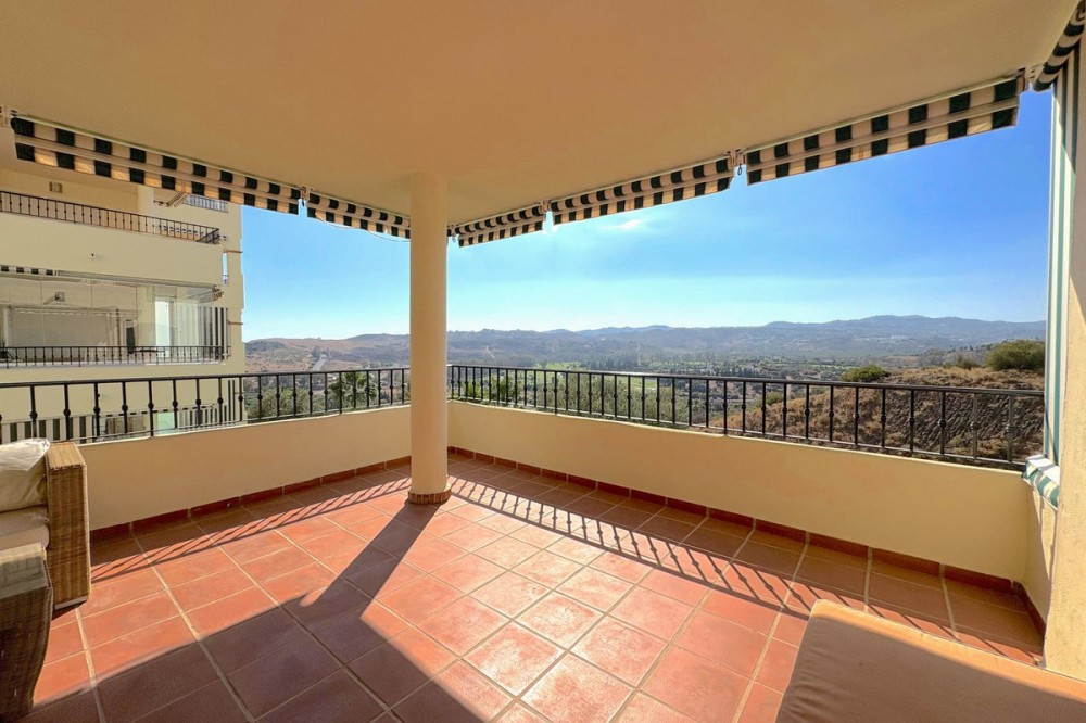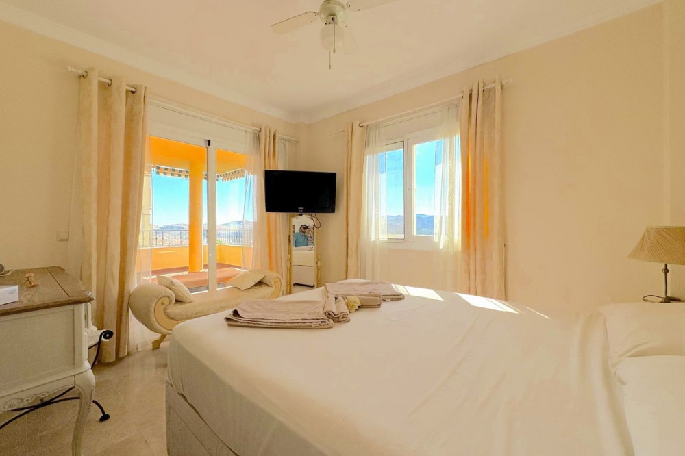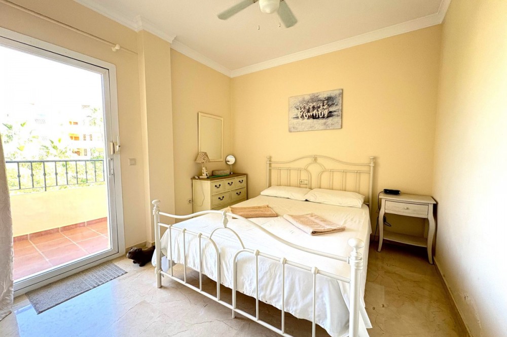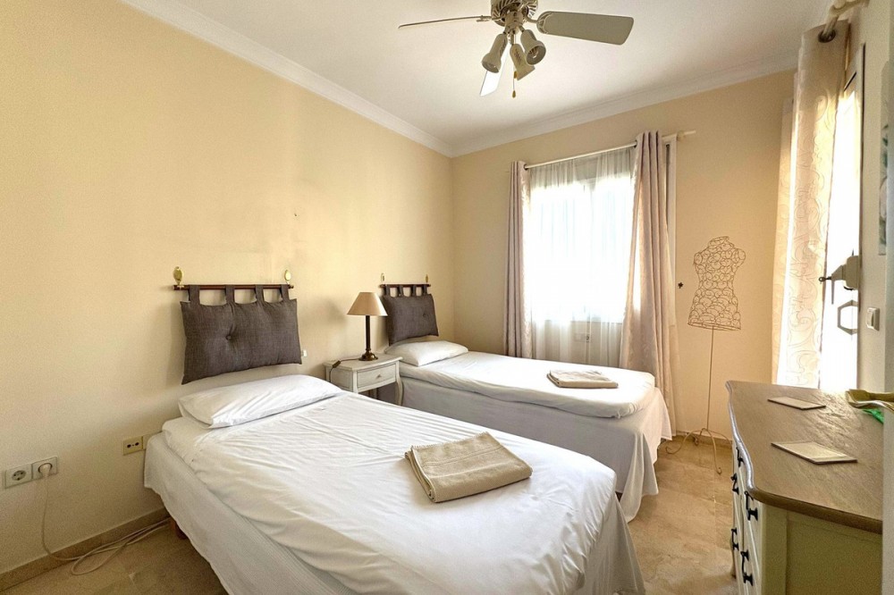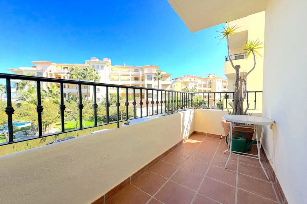 - Expansive and tastefully decorated, this three-bedroom, two-bathroom apartment spans 116 m2 and features a spacious 42m2 lounge. The larger of the two terraces, measuring 33m2, faces East, providing breathtaking panoramic views of the picturesque landscape stretching towards Santana Golf. Meanwhile, the smaller terrace overlooks the pristine main pool and meticulously landscaped garden. Each room is equipped with individual air conditioning units for personalized comfort. The interior boasts high gloss marble floors throughout, and the kitchen is fully fitted with modern appliances. Additional amenities include underground parking, storage, a safe, video-entrance, and more. The apartment is offered unfurnished, with room for negotiation.