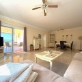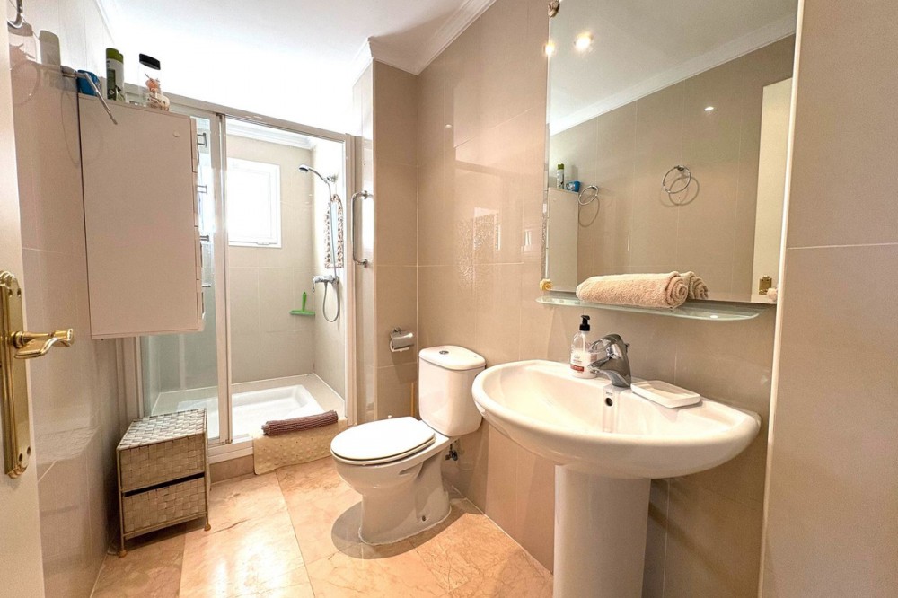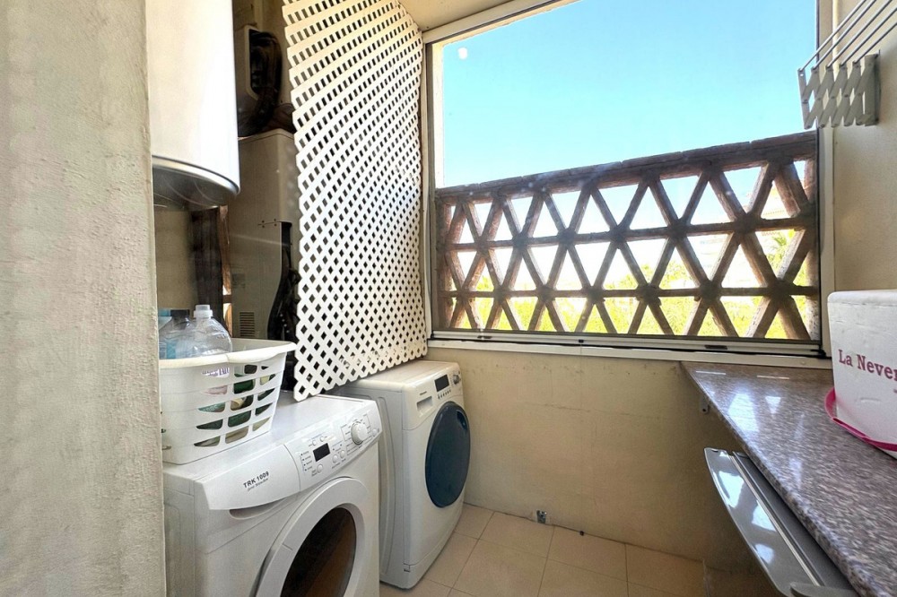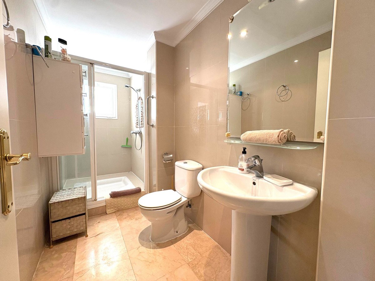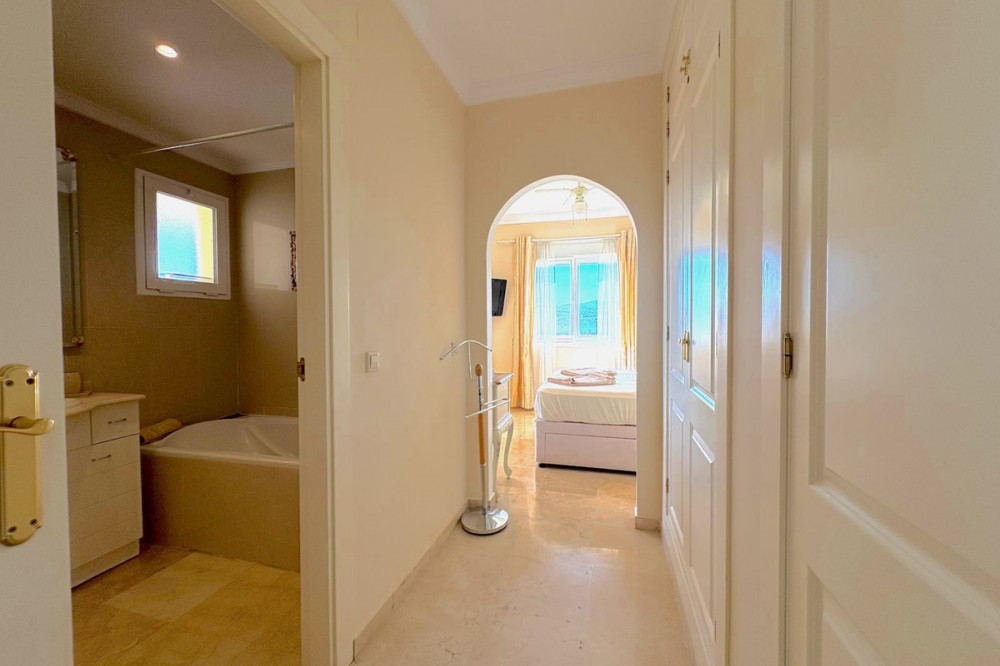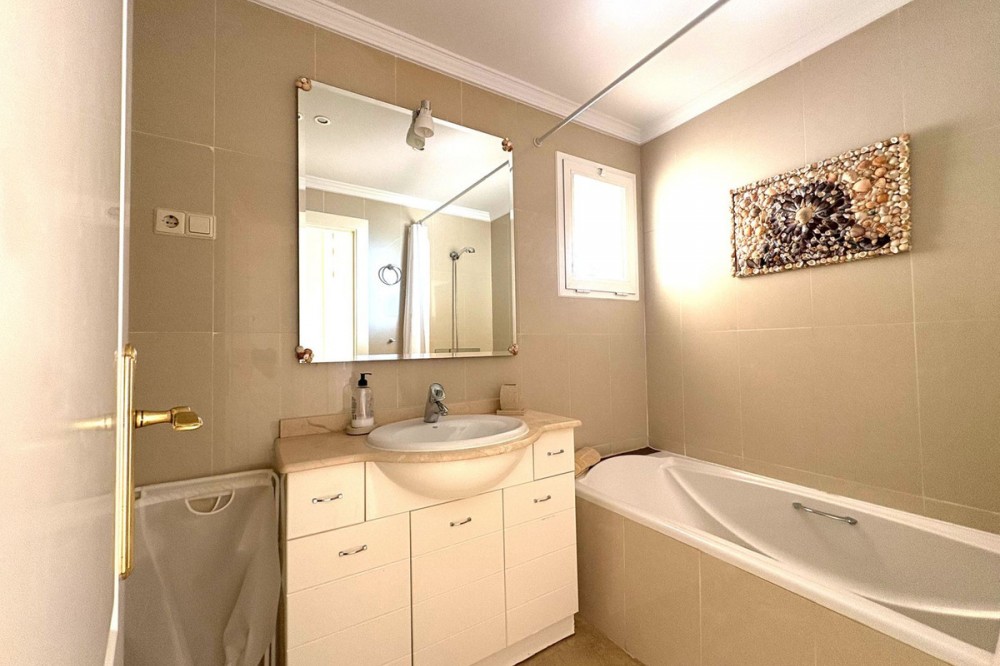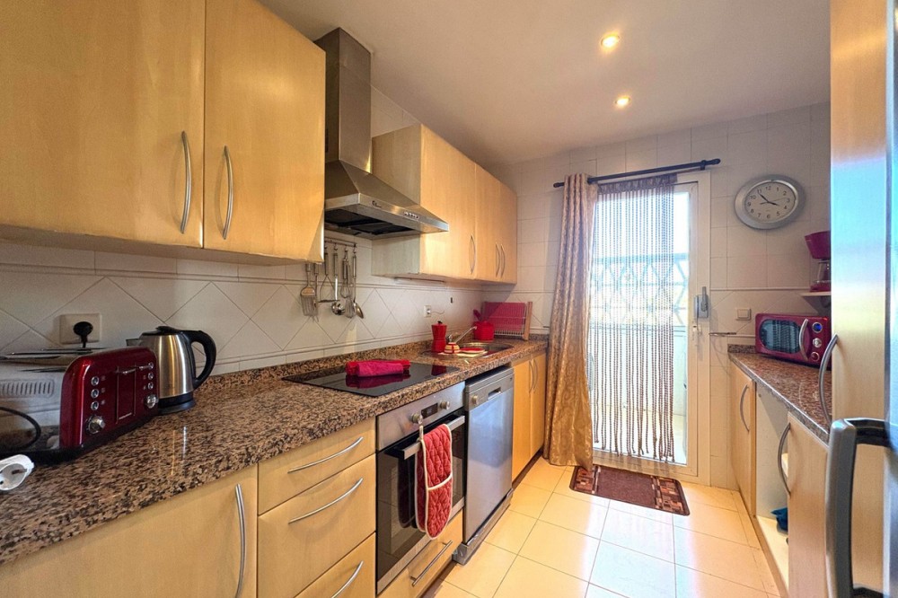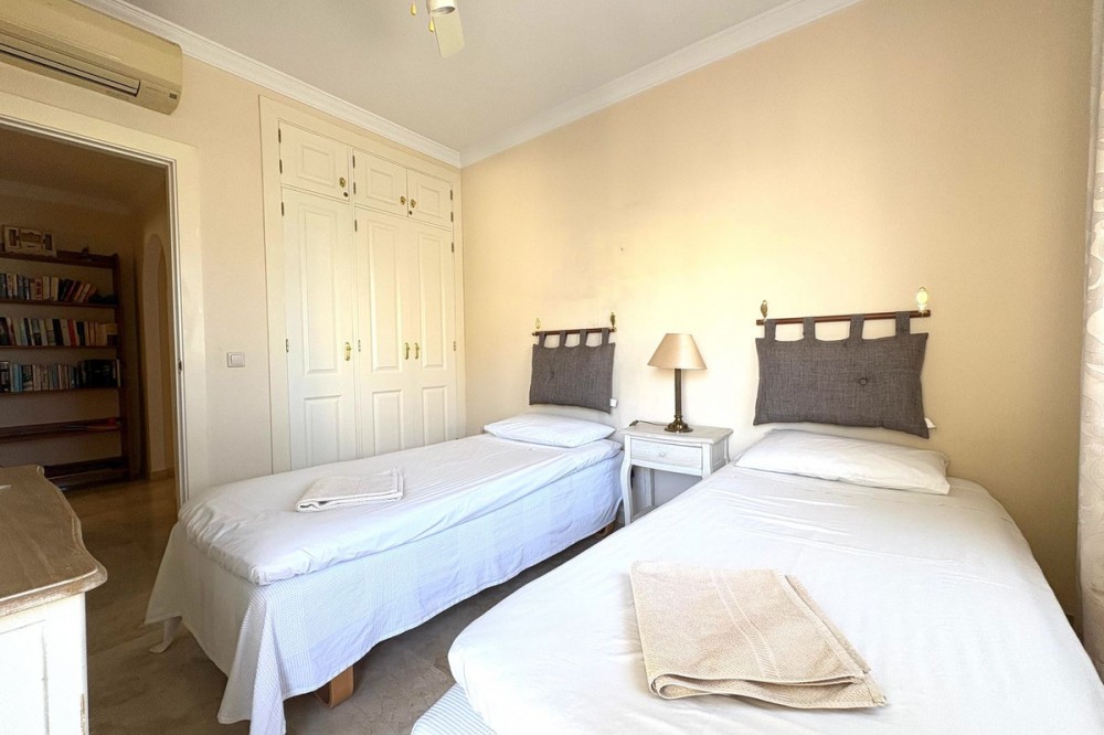 - Expansive and tastefully decorated, this three-bedroom, two-bathroom apartment spans 116 m2 and features a spacious 42m2 lounge. The larger of the two terraces, measuring 33m2, faces East, providing breathtaking panoramic views of the picturesque landscape stretching towards Santana Golf. Meanwhile, the smaller terrace overlooks the pristine main pool and meticulously landscaped garden. Each room is equipped with individual air conditioning units for personalized comfort. The interior boasts high gloss marble floors throughout, and the kitchen is fully fitted with modern appliances. Additional amenities include underground parking, storage, a safe, video-entrance, and more. The apartment is offered unfurnished, with room for negotiation.