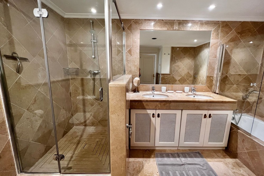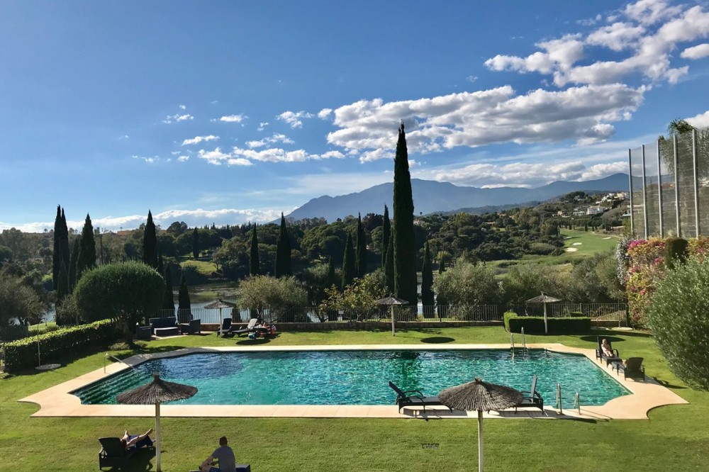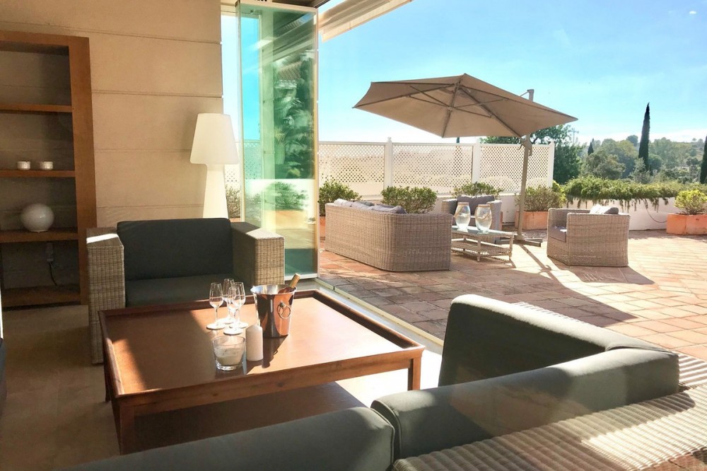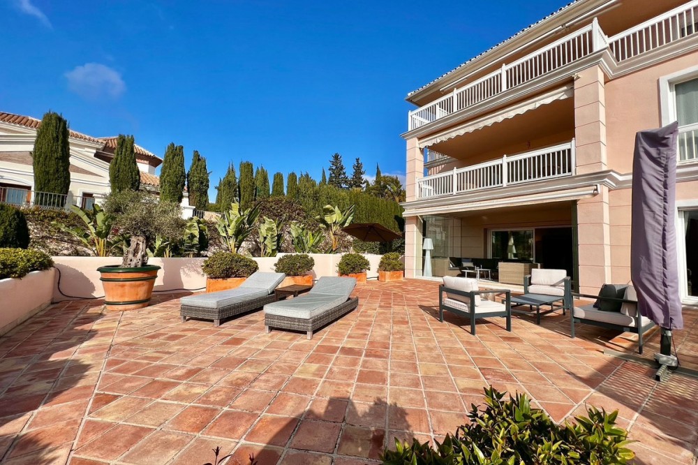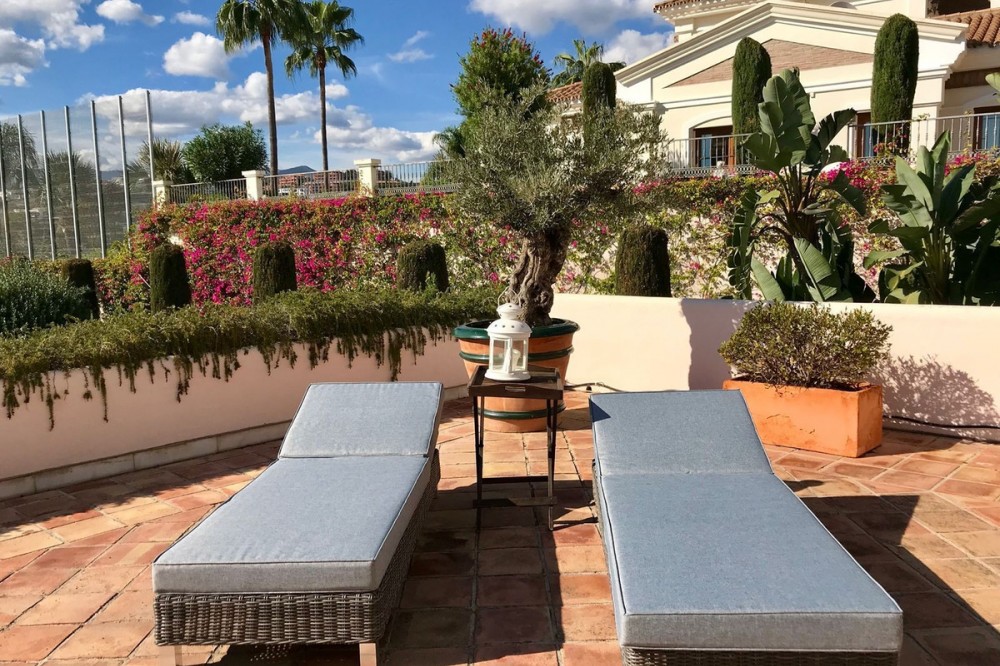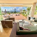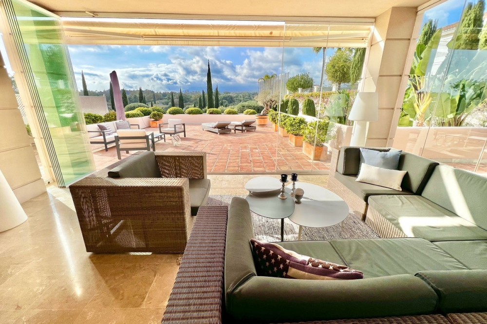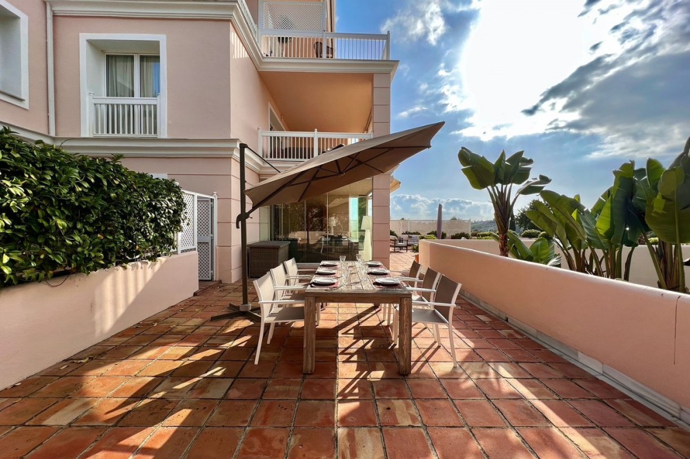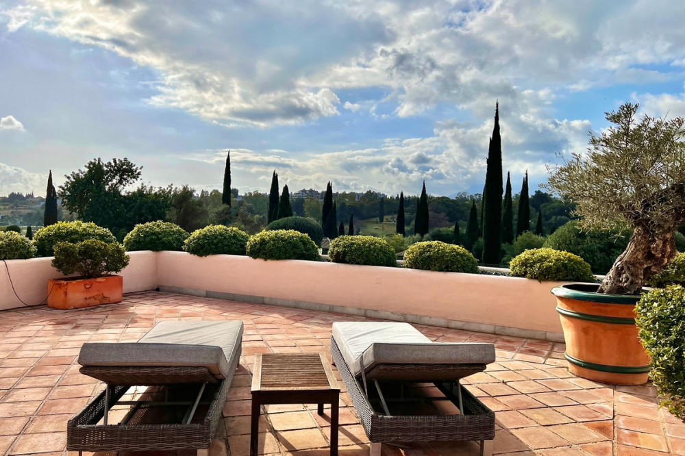- Stunning Luxury Apartment with Panoramic Countryside Views – Frontline Golf at Los Flamingos Located in the heart of the prestigious Los Flamingos Golf Resort, this elegant 3-bedroom, 3-bathroom apartment stands out for its spacious interior, refined finishes, and spectacular open views across the countryside. A true haven of peace, nestled in a secure and beautifully landscaped setting, offering tranquillity, comfort, and exclusivity. From the moment you enter, the sense of space and natural light is immediately striking. The apartment features high ceilings, integrated air conditioning, and underfloor heating in all bathrooms, ensuring comfort throughout the year. The fully equipped kitchen includes a breakfast table and opens directly onto a charming side terrace, perfect for morning coffee or casual dining. It also connects to a separate laundry room, discreetly integrated into the layout. Additional storage space is located in the hallway for maximum practicality. Each of the three bedrooms is en-suite and has direct access to a terrace, creating a seamless indoor-outdoor flow. The master bedroom opens onto the main terrace, allowing you to enjoy the views and sunshine from the moment you wake up. One of the property’s most impressive features is the 140 m² terrace, sun-drenched all day and divided into three distinct zones: a relaxation area, an outdoor dining space, and a lounge corner for entertaining or quiet evenings under the stars. All windows are fitted with electric shutters for added security and convenience. The apartment is situated in an exclusive low-density complex, surrounded by manicured Tuscan-inspired gardens and offering access to a large turquoise communal swimming pool. With only a few units in the development, peace and discretion are guaranteed. The property is sold fully furnished, featuring high-quality materials and tasteful, timeless décor. A private spacious parking space and storage room are included in the price.