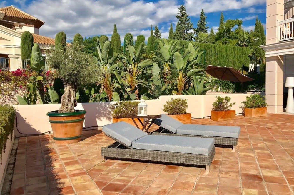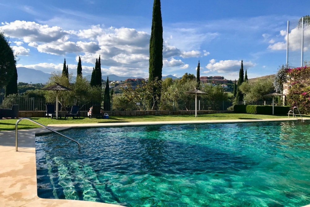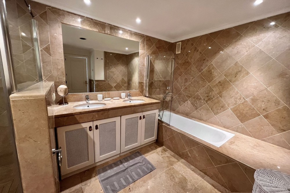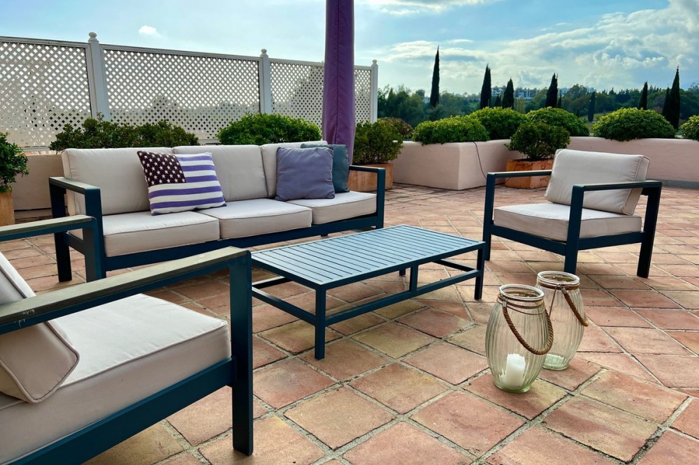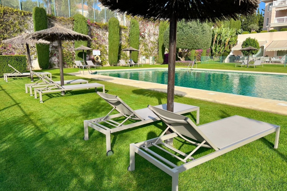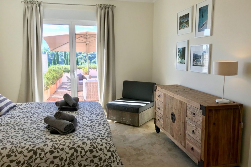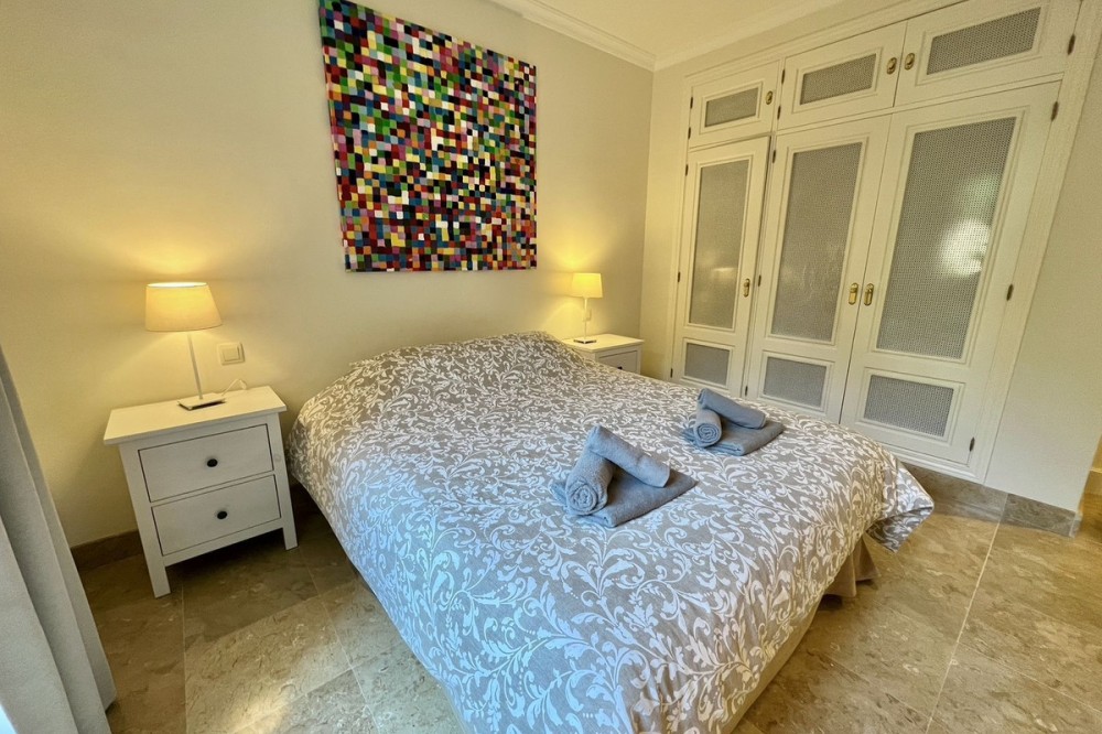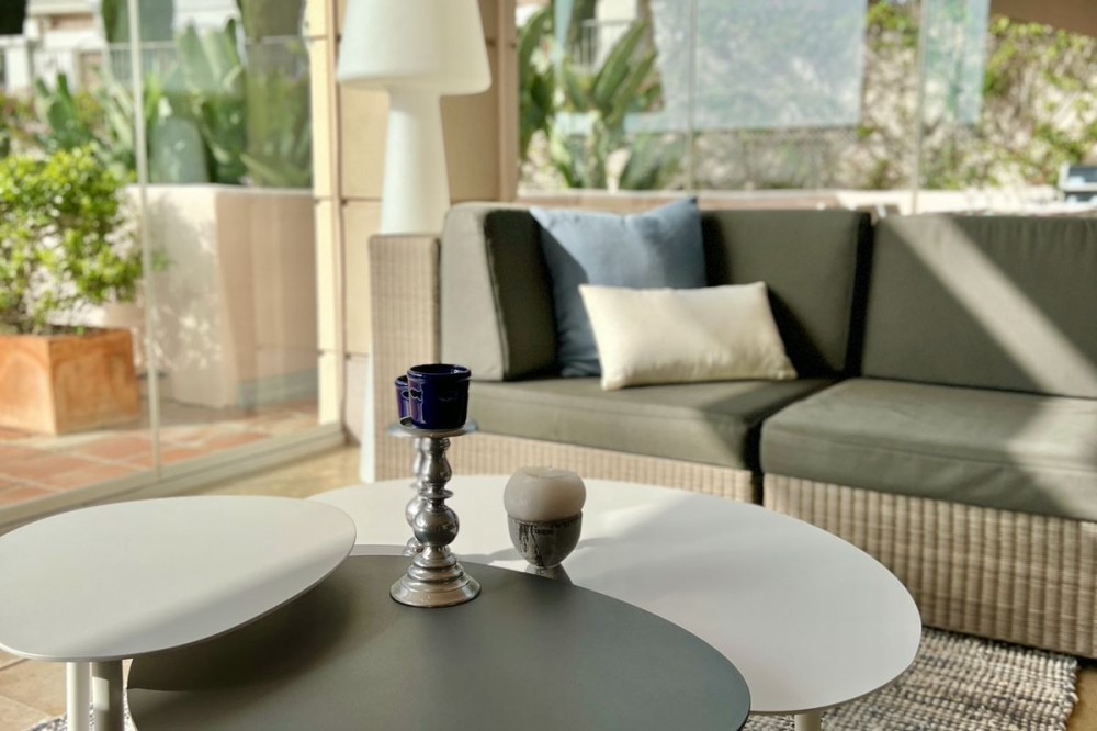 - Stunning Luxury Apartment with Panoramic Countryside Views – Frontline Golf at Los Flamingos Located in the heart of the prestigious Los Flamingos Golf Resort, this elegant 3-bedroom, 3-bathroom apartment stands out for its spacious interior, refined finishes, and spectacular open views across the countryside. A true haven of peace, nestled in a secure and beautifully landscaped setting, offering tranquillity, comfort, and exclusivity. From the moment you enter, the sense of space and natural light is immediately striking. The apartment features high ceilings, integrated air conditioning, and underfloor heating in all bathrooms, ensuring comfort throughout the year. The fully equipped kitchen includes a breakfast table and opens directly onto a charming side terrace, perfect for morning coffee or casual dining. It also connects to a separate laundry room, discreetly integrated into the layout. Additional storage space is located in the hallway for maximum practicality. Each of the three bedrooms is en-suite and has direct access to a terrace, creating a seamless indoor-outdoor flow. The master bedroom opens onto the main terrace, allowing you to enjoy the views and sunshine from the moment you wake up. One of the property’s most impressive features is the 140 m² terrace, sun-drenched all day and divided into three distinct zones: a relaxation area, an outdoor dining space, and a lounge corner for entertaining or quiet evenings under the stars. All windows are fitted with electric shutters for added security and convenience. The apartment is situated in an exclusive low-density complex, surrounded by manicured Tuscan-inspired gardens and offering access to a large turquoise communal swimming pool. With only a few units in the development, peace and discretion are guaranteed. The property is sold fully furnished, featuring high-quality materials and tasteful, timeless décor. A private spacious parking space and storage room are included in the price.