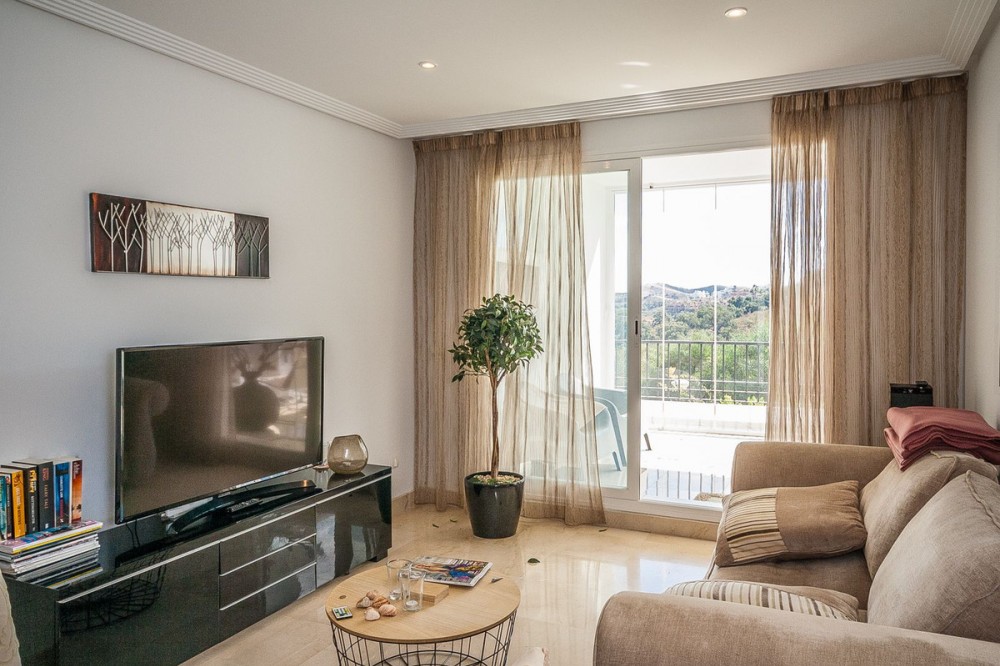 - Nestled in the tranquil hills of La Mairena, this beautiful apartment offers a perfect blend of peace, comfort, and convenience. Just a 10-minute drive from the coast, it’s ideally situated for those seeking both mountain serenity and easy access to amenities.The apartment features two spacious bedrooms and two bathrooms, including a master suite with an en-suite bathroom. The fully fitted kitchen comes with a practical utility area, while the bright and airy living spaces open onto a large terrace enclosed with glass curtains, where you can relax and take in extraordinary panoramic views of the surrounding landscape. Residents enjoy beautifully maintained communal gardens with a swimming pool, as well as a private off-road parking space. The area is quiet and rural, yet conveniently close to schools, tennis courts, and the renowned El Soto Golf Course. Whether as a peaceful permanent home or a lovely holiday retreat, this apartment offers the best of Andalusian living — mountain charm with a touch of coastal luxury.