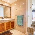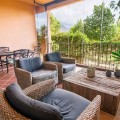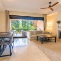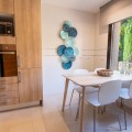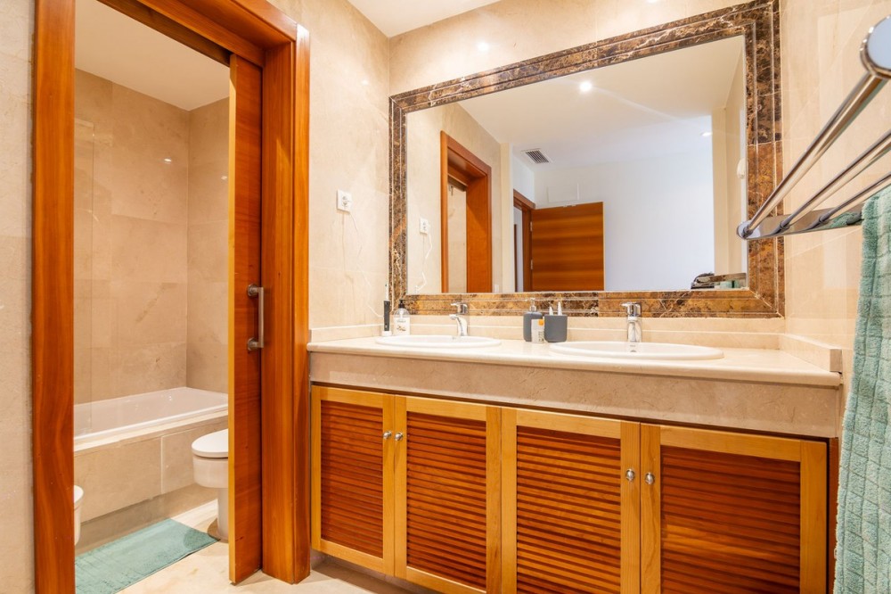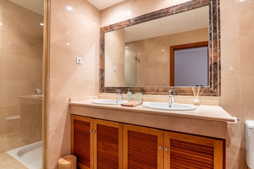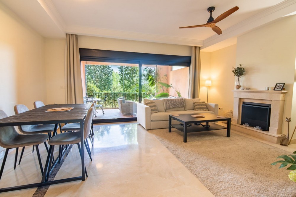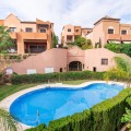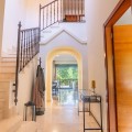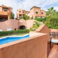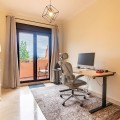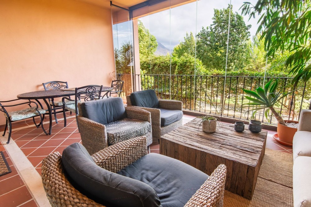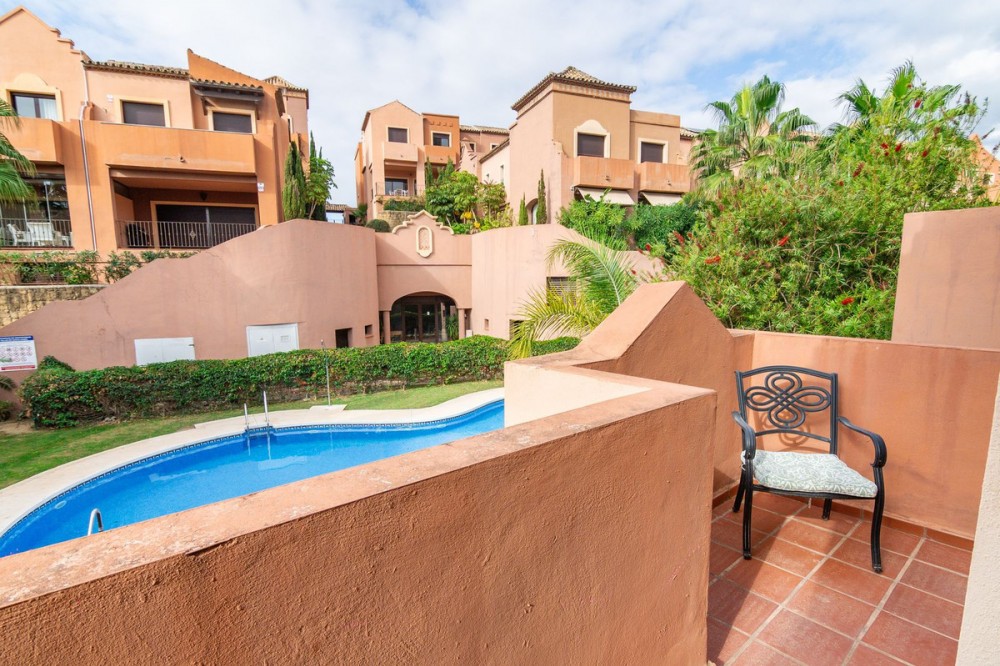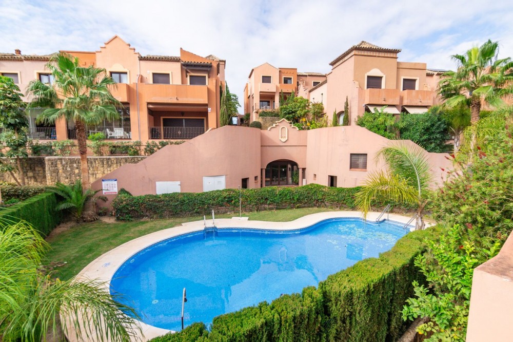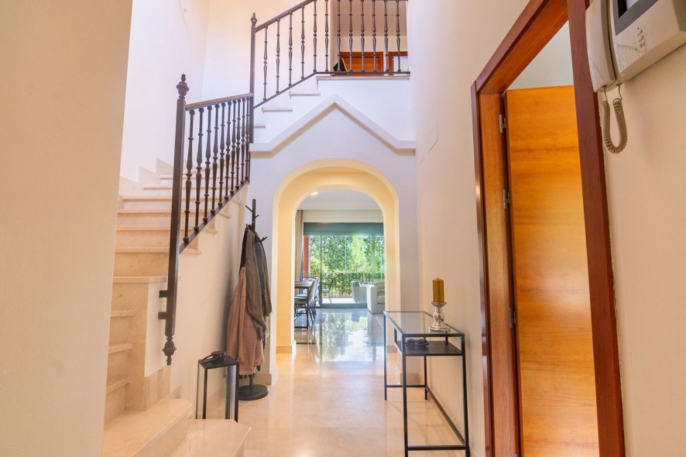 - Located within the peaceful surroundings of Azata Golf, Santa Maria villas is an exclusive gated community offering privacy, comfort, and timeless style. The urbanization combines the tranquility of a residential setting with the convenience of nearby amenities — just a 10-minute drive from the centre of Estepona and 5 minutes from supermarkets, restaurants, schools, and pharmacies. This beautifully maintained townhouse blends Andalusian charm with modern elegance, featuring marble floors, a graceful staircase, and refined decorative finishes throughout. The property opens to a bright entrance hall leading to a fully fitted kitchen and dining area overlooking the landscaped gardens. A guest bathroom and direct access to the private garage and basement storage provide extra comfort and practicality. The spacious living room features a fireplace and large patio doors opening onto a sun-drenched terrace with sea and golf views. The terrace is enclosed with glass curtains, creating an additional year-round living area — ideal for relaxing or entertaining. Upstairs are three generous bedrooms, all with fitted wardrobes. The master suite includes an en-suite bathroom and a private balcony, while the other two bedrooms share a modern family bathroom and each enjoy a Juliette balcony. Residents can enjoy two large swimming pools, surrounded by beautifully landscaped gardens. This property also includes a private garage and extra storage, making it an excellent choice as a permanent residence, holiday home, or rental investment.