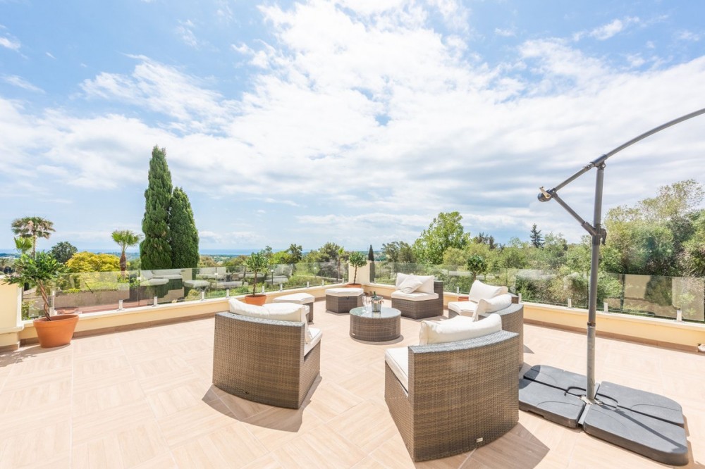 - Elegant Family Villa in a Private Sotogrande Setting Nestled on a generous 4,420 m² plot, this exquisite villa offers the perfect blend of privacy, comfort, and sophisticated design. Featuring 5 spacious bedrooms, plus an additional guest bedroom with separate access and a self-contained guest apartment, it’s ideal for hosting family and friends while ensuring everyone enjoys their own space. Thoughtfully Designed Living Spaces Step inside to a grand entrance hall that opens onto a bright, inviting living room and a modern, well-appointed kitchen with a handy laundry area. Two ground-floor bedrooms with en-suite bathrooms open directly onto the lush garden, seamlessly connecting indoor and outdoor living. Upstairs, the master suite boasts a walk-in wardrobe and a private terrace, accompanied by two further bedrooms, each with its own en-suite bathroom. The additional bedroom and guest apartment at the far end of the garden ensure ultimate privacy for visitors. Bright, Modern, and Open Designed to capture natural light, the villa’s open-plan layout creates a sense of space and freedom. The kitchen flows effortlessly to the covered porch and outdoor dining area, perfect for entertaining or enjoying tranquil evenings under the Sotogrande sky. Exclusive Location Set in a quiet and private corner of Sotogrande, the villa is just a short drive from the International School of Sotogrande, renowned golf courses including Valderrama, La Reserva, and Real Club Sotogrande, and the SO Sotogrande Hotel and Almenara Golf Course. Experience the perfect balance of luxury, leisure, and family living in one of Spain’s most prestigious communities.