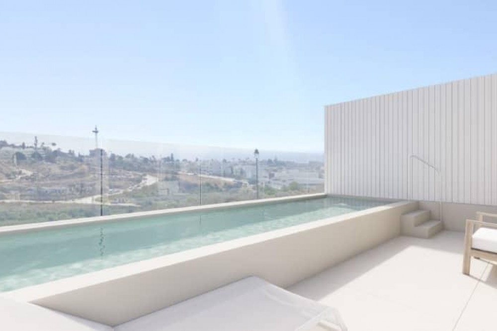 - For this new and exclusive development of 10 semi-detached villas in Estepona from 730.000 euros (excl. VAT) incl. 2 parking spaces Ready for occupation 2027 The developer chose a plot with beautiful views of the sea, golf course, and mountains and consists of only 10 semi-detached villas with 4 bedrooms, 3 or 4 bathrooms, 1 or 2 toilets, and an office that can be used as a laundry room. The corner villas have their own gardens and private saltwater pools. The central villas have a rooftop pool. The open, functional spaces are undoubtedly the focal points of the homes, connecting us to the terraces and their beautiful views of the sea, golf course, and mountains. The villas are well-equipped to the highest standards, providing every comfort, including an aerothermal air conditioning system. High quality porcelain floors. Fully equipped kitchen with Siemens or similar appliances. Hot and cold air conditioning with aerothermal system. Private garden with pool or roof terrace with private pool. Master bathroom en suite. Built-in wardrobes in all bedrooms. Large windows. Private parking.