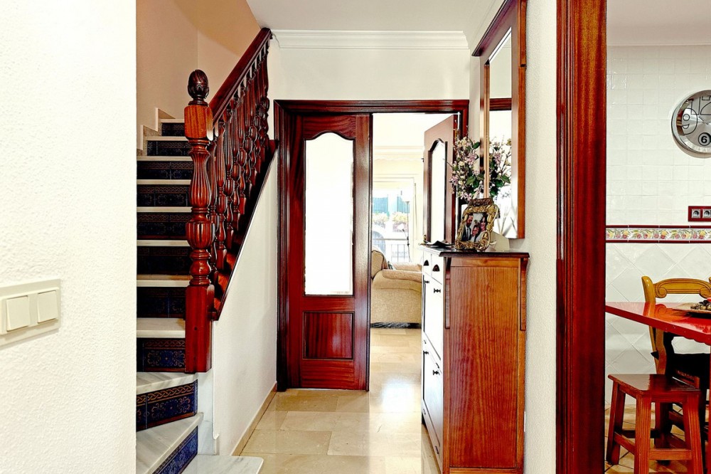 - Located in the western part of Estepona, near Estepona Stadium and the Felipe VI Theater, this bright and spacious townhouse represents a unique opportunity for those seeking comfort, spaciousness, and proximity to all amenities. With an excellent orientation and located in one of the most dynamic areas of the city, the home stands out for its functionality and privileged location, ideal for both families and those looking to enjoy the vibrant urban lifestyle in a residential area. The property comprises three spacious bedrooms, two full bathrooms (one en suite), and a guest toilet. The cozy and bright living room features a fireplace and direct access to a porch perfect for family gatherings. Its spectacular 40 m² open terrace is ideal for enjoying the Mediterranean climate and hosting outdoor barbecues. The separate dining room, fully equipped kitchen, and practical porch complete the main living spaces. It also has a 55 m² private garage, a highly valued feature in the area. Its outstanding features include marble floors, built-in wardrobes, a security door, individual air conditioning in the master bedroom and living area. With fiber optic internet access. The home comes partially furnished and enjoys mountain, city, and street views. Pets are allowed, making it a perfect choice for the whole family. It is in excellent condition and is ready to move into. The surrounding area offers a wide range of services and amenities just minutes away: shops, supermarkets, secondary schools, schools, a theater, a stadium, a sports center, bars, restaurants, and public transportation. Furthermore, the proximity to the port, the beach, and golf courses allows you to enjoy an active and healthy lifestyle in one of the best locations on the Costa del Sol. Don't miss this unique opportunity. For more information or to arrange a viewing, please don't hesitate to get in touch. This townhouse could be the home you've always dreamed of in Estepona!
