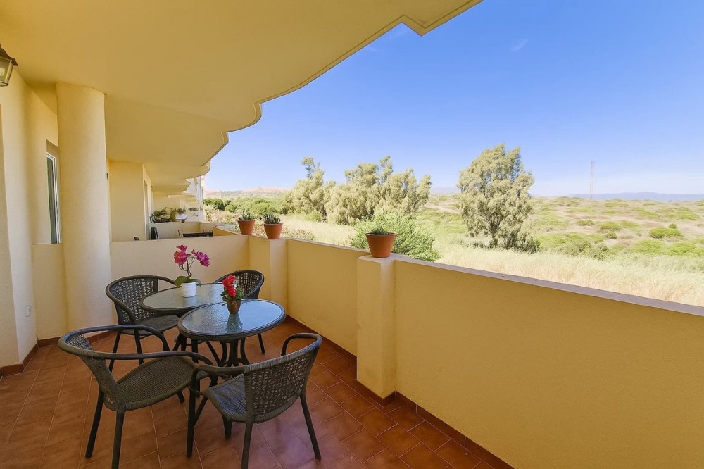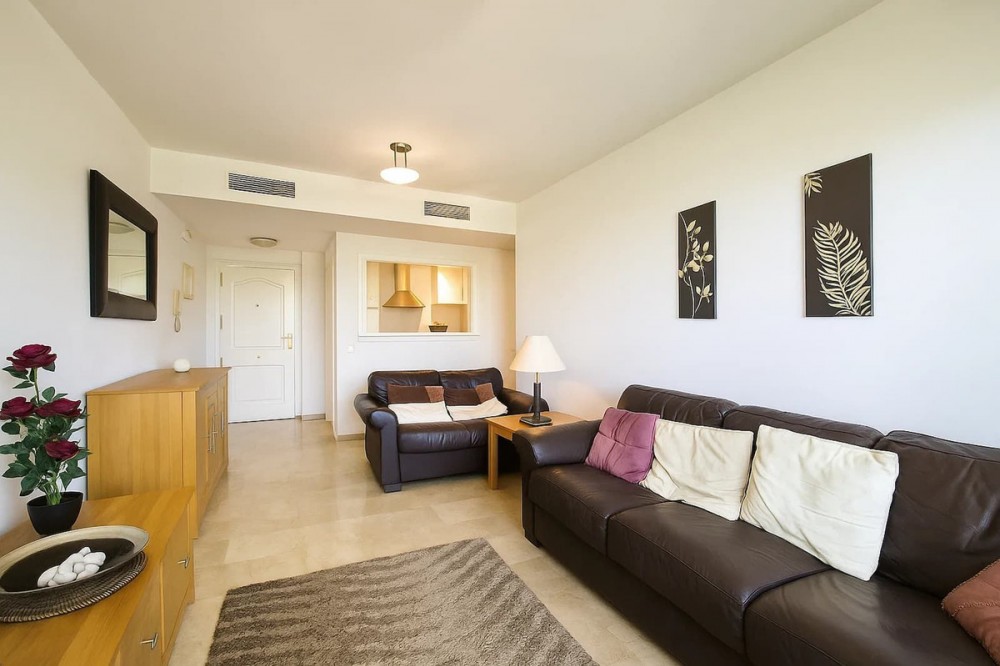 - This charming two-bedroom apartment offers a bright and spacious living environment in a peaceful residential complex just a short walk from Aldea Beach. Set within a secure development with landscaped gardens and communal swimming pools, this location combines tranquility with convenience, being close to local shops, beach bars, the marina at La Duquesa, and several golf courses, making it an excellent choice for both permanent living and holiday stays on the Costa del Sol. The property features an open-plan living and dining area with access to a private terrace, ideal for enjoying the Mediterranean climate. The master bedroom includes an en-suite bathroom, while the second bedroom and additional bathroom provide comfortable accommodation for family or guests. The apartment is equipped with air conditioning, a fitted kitchen, and high-quality finishes throughout. The apartment offers a spacious private terrace with views towards the countryside and surrounding hills, perfect for outdoor dining or relaxing in the sun. Set within a gated complex, the property benefits from beautifully landscaped gardens and access to communal swimming pools, creating a peaceful environment just a short walk from the beach.