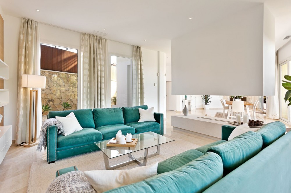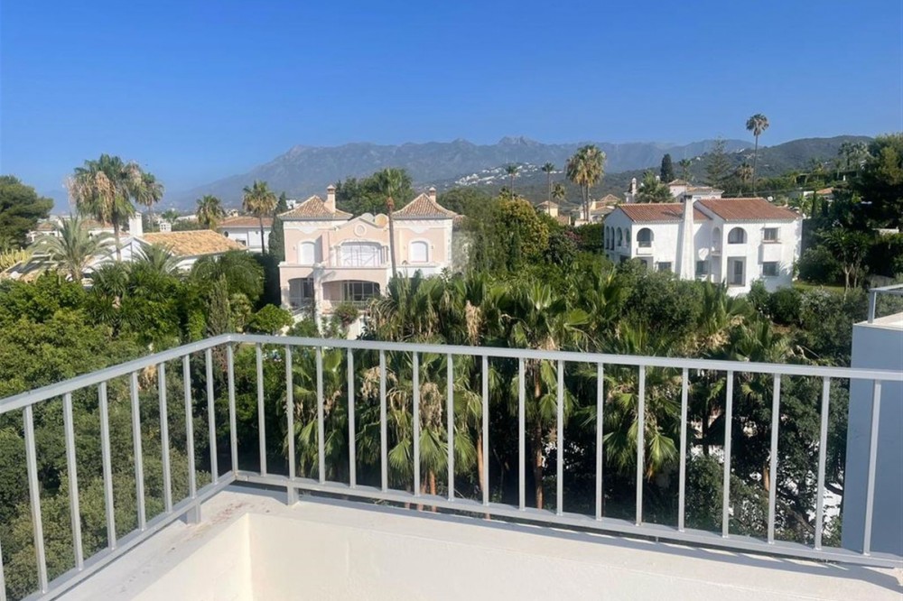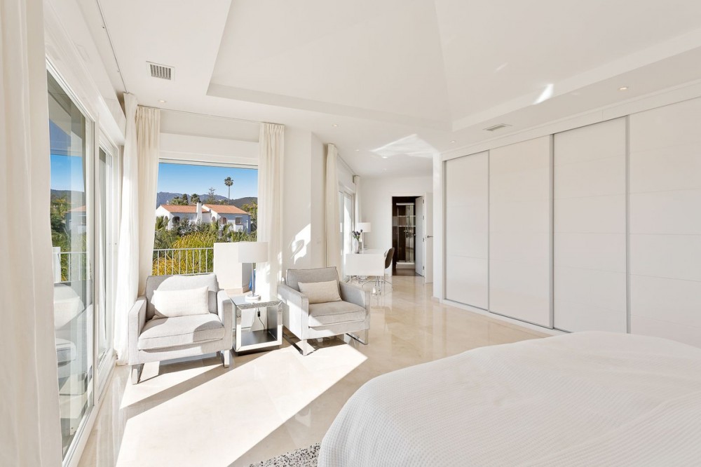 - Stunning contemporary-style villa located within a short distance to one of the best beaches in Marbella. Situated at the end of a cul-de-sac in a very peaceful and family-friendly area of other large villas, just 6 km from the centre of Marbella. Marbella Golf & Country Club and Santa Clara Golf are just a short drive away. This beautiful South-west facing property has been constructed with high-end quality materials. The property is built on 3 floors on a plot of 1438 m2 and is in very good condition. On the ground floor are 2 spacious lounge areas (one with biofuel burner fireplace), large central dining area with high ceiling, modern open-plan fully-equipped kitchen with built-in coffee machine and American fridge/freezer. Alongside the kitchen is a laundry room with washing machine and tumble dryer. There is also a guest toilet. On this level there is direct access through large sliding doors to a 70 m2 covered terrace with lounge area, dining area for 8 people and a large gas BBQ, all overlooking a lawned garden area with sea views. From this garden area there are 10 steps down to the large heated swimming pool which is very private. On the first floor of the property there is a bright seating/gaming area with floor to ceiling windows and 4 very spacious bedrooms, all with en-suite bathrooms and fitted wardrobes. The impressive master suite has spectacular views of the surroundings and the sea from its large private terrace. The second and third bedrooms also have superb sea views from a large, shared terrace. From the first floor are stairs up to the top level of the villa where you will find an impressive 90 m2 roof terrace with a covered dining area equipped with a gas barbecue and refrigerator along with a chill-out area from where you can enjoy majestic panoramic views of the Mediterranean sea and Marbella with its dramatic La Concha mountain range. The property has 2 gated driveway areas with parking for at least 6 vehicles. It is being sold fully furnished and also benefits from cream marble flooring, double glazing, hot & cold integrated air conditioning, electric persianas in the bedrooms, underfloor heating in bathrooms, alarm system and wireless Sonos home audio. The urbanisation is very quiet and safe with 24h security patrol. In the direct area you can find a selection of restaurants, supermarket, bakery, paddle/tennis court, gym/fitness centre and a children’s playground. Along the lovely sandy beach in both directions, there are a variety of restaurants, Spanish chiringuitos and beach clubs.