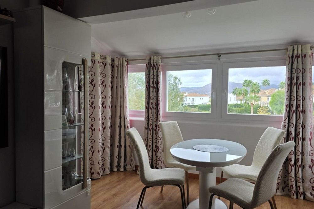 - Discover this beautifully renovated 3-bedroom duplex, offering the perfect blend of modern comfort and stylish living. The home features double-glazed windows throughout, ensuring peace and energy efficiency. The spectacular dining area boasts stunning views, creating an inviting space for entertaining or family meals. Enjoy year-round comfort with air conditioning and relax on the large private terrace, complete with a built-in BBQ — ideal for outdoor dining while taking in the breathtaking views. This residence is part of a well-maintained community with a sparkling swimming pool, perfect for leisurely afternoons. Located close to several top golf courses, it offers a serene lifestyle with easy access to recreation and local amenities. A move-in ready home that combines modern finishes, spacious living, and an unbeatable location — a true gem for those seeking comfort and elegance.