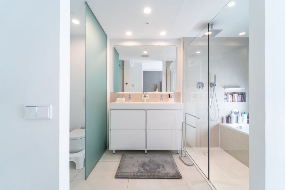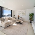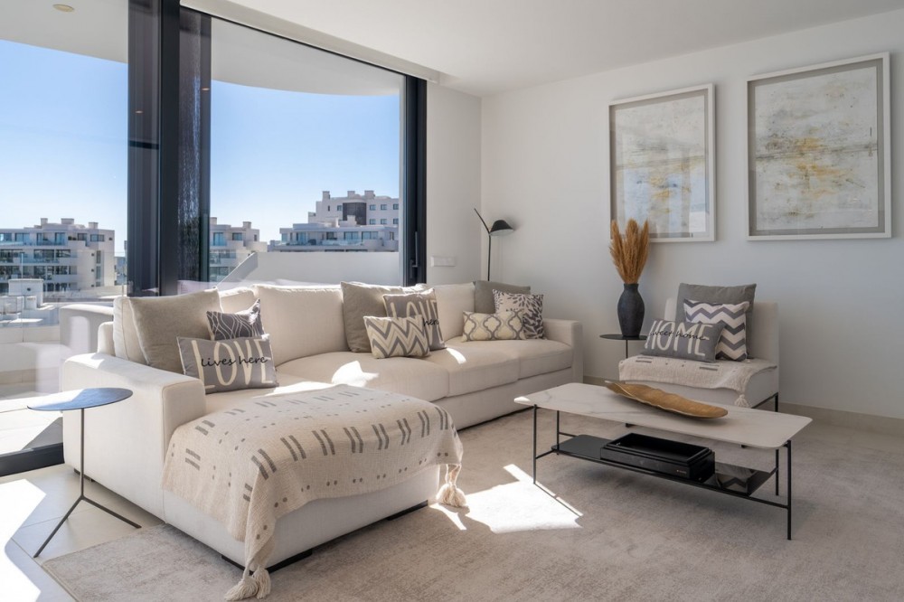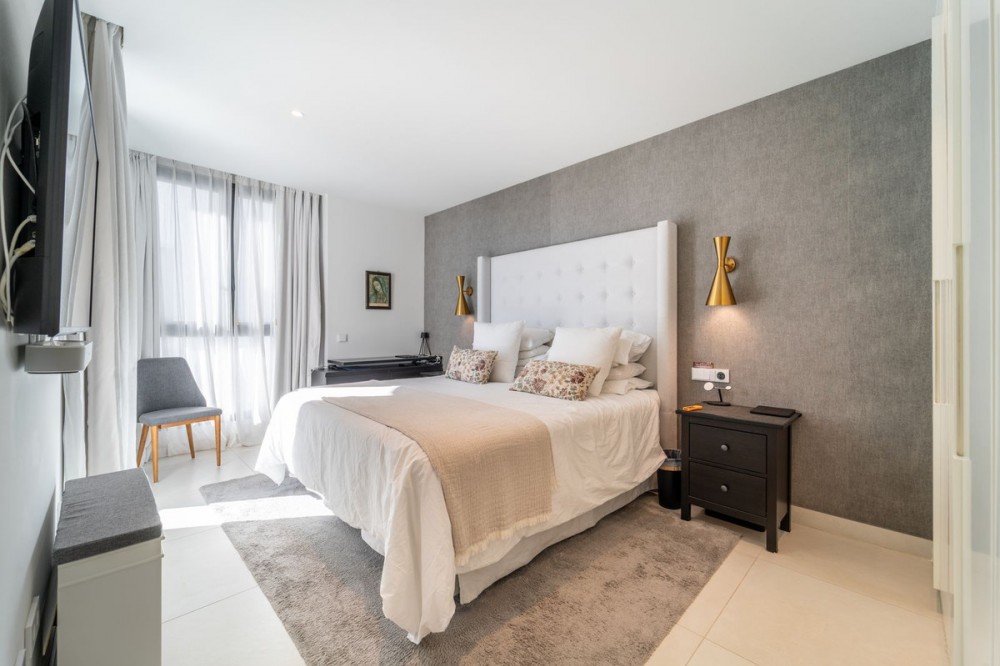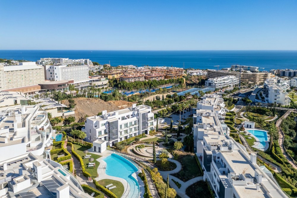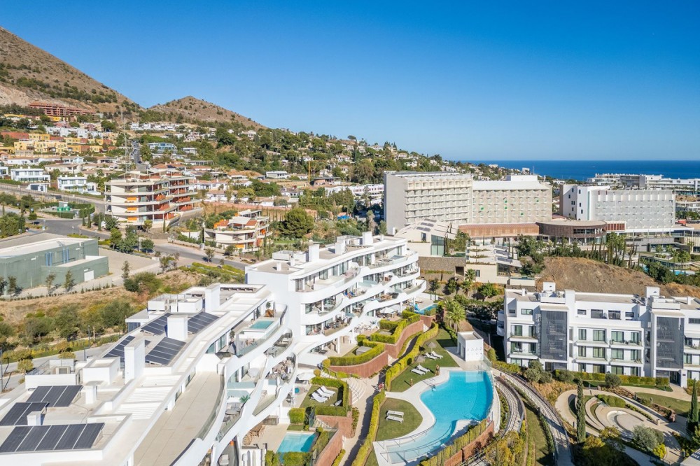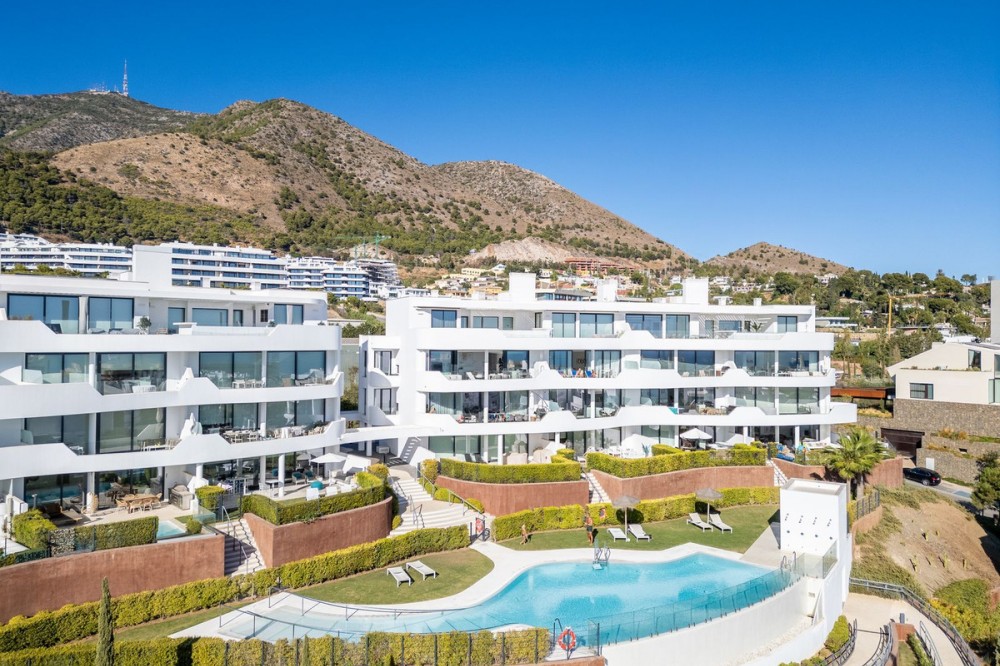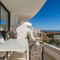 - Elegant south facing apartment, in the exclusive urbanization of Higuerón West, with 3 bedrooms, 2 bathrooms, spacious living-dining room, open plan kitchen fully furnished and equipped with electrical appliances from BOSCH, laundry area with washing machine/dryer, large terrace of 26m2 with amazing panoramic sea views. Master bedroom with closet, open plan ensuite bathroom and access to a small terrace. Air conditioning hot and cold, video intercom, domotic system, built-in wardrobes in all bedrooms and hall, pre-installation alarm system, under floor heating in bathrooms. Includes two parking spaces and one storage room.