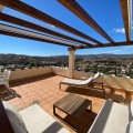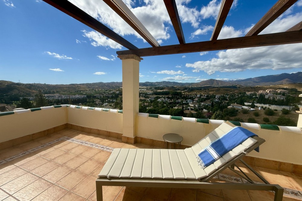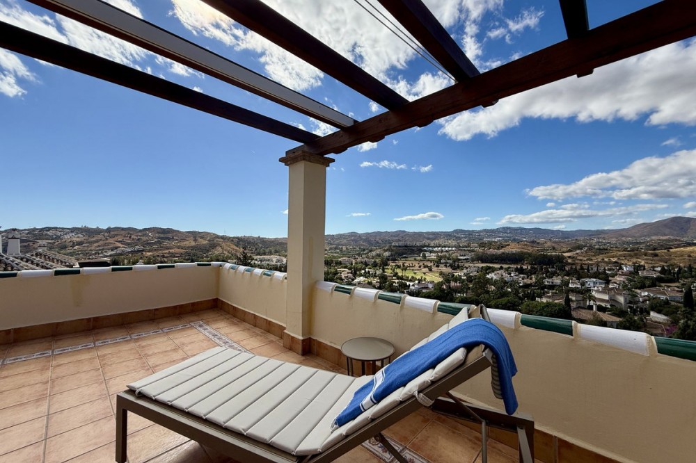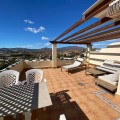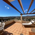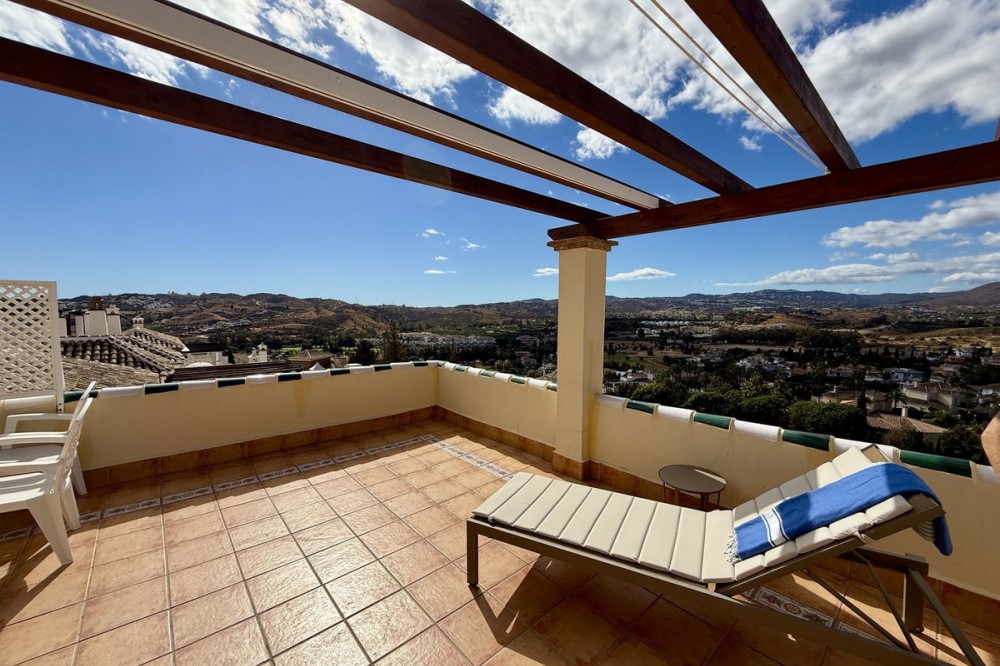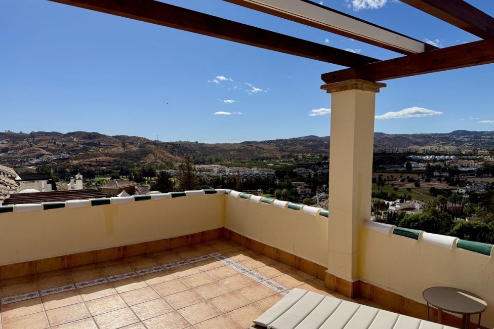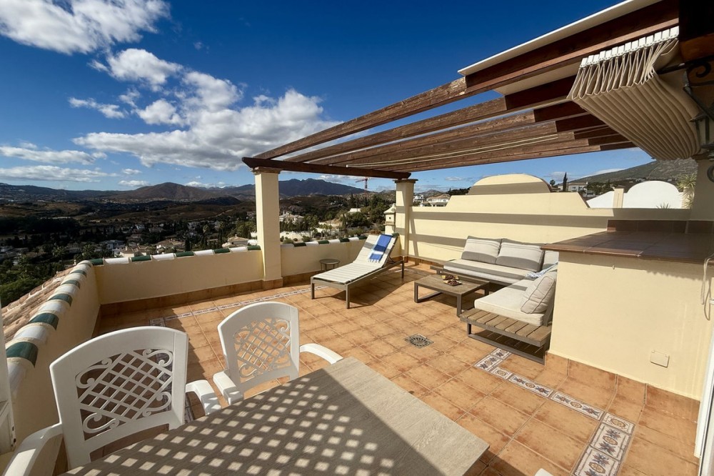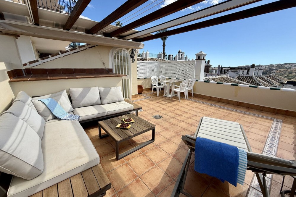 - Townhouse with amazing panoramic views in Puebla Aida, Mijas Golf Welcome to this beautifully presented 2-bedroom townhouse, located in the sought-after Andalusian-style community of Puebla Aida, right in the heart of Mijas Golf. As you enter, you’re greeted by a bright and inviting open-plan living and dining area, featuring a modern, high-quality kitchen. From here there is direct access to a spacious south-southwest-facing terrace — perfect for dining al fresco, relaxing with a glass of wine, and soaking up the breathtaking views. On this level, there’s also a guest toilet and a practical storage space. Upstairs, you’ll find two generous bedrooms with fitted wardrobes and a stylish bathroom. The highlight of this home is without doubt the private rooftop terrace, offering panoramic views of the golf course, mountains, and sunsets. The solarium features a dining area, lounge sofas, and sun loungers under a pergola with adjustable awning — the ideal spot for outdoor living, entertaining, or simply enjoying the tranquil surroundings. Puebla Aida is renowned for its beautiful Andalusian architecture, immaculately kept communal areas, and four swimming pools open year-round. The community also offers a petanque court, charming squares, and peaceful corners that give it a truly unique atmosphere. The location is excellent — surrounded by nature yet close to everything you need. Within walking distance, you’ll find restaurants, a mini-market, golf courses, and the luxurious 5-star Hotel La Zambra with restaurants and bars. Bus connections make it easy to reach Fuengirola’s beaches, shopping, and entertainment, and by car you’re only a short drive from La Cala, Marbella, and Málaga Airport. The townhouse features air conditioning (hot/cold), a fireplace, drinkable tap water, and is sold part furnished. Ready to move in. Optional: An extra-large private garage is available for purchase separately, located directly below the property. Don’t miss this opportunity to own a piece of authentic Andalusian charm on the Costa del Sol.