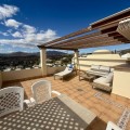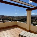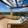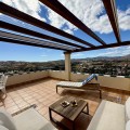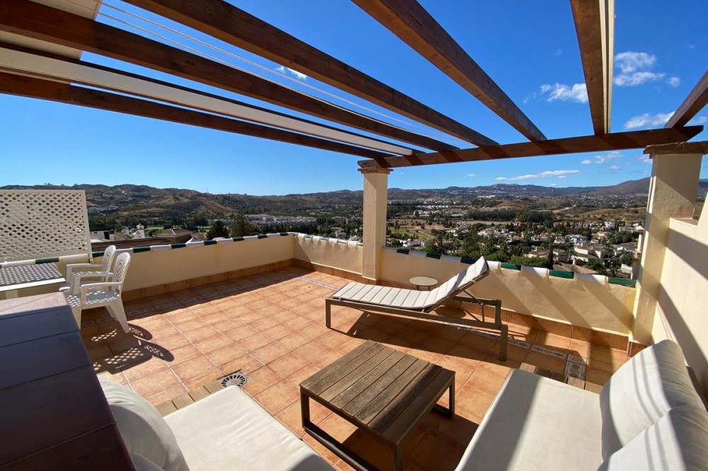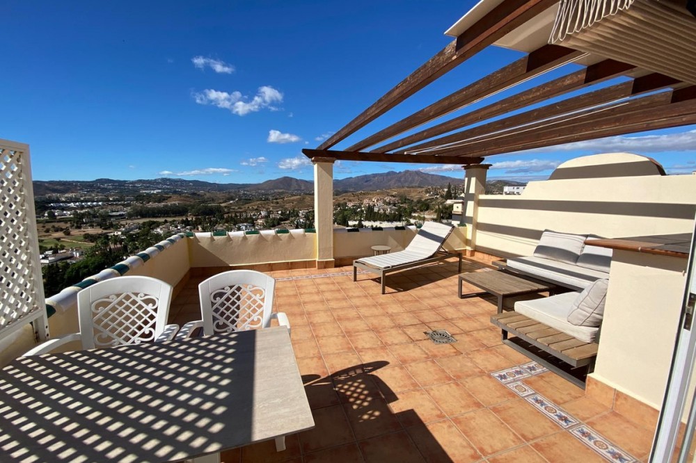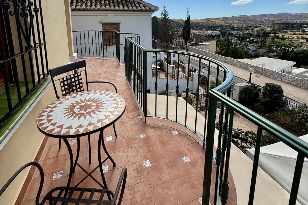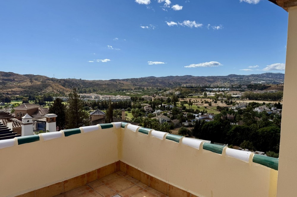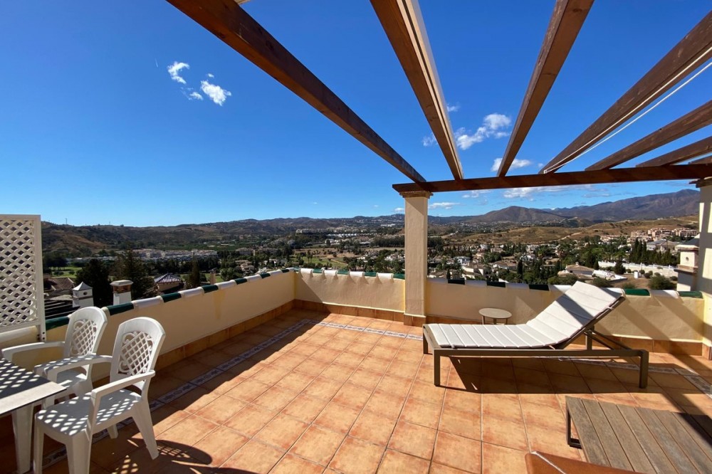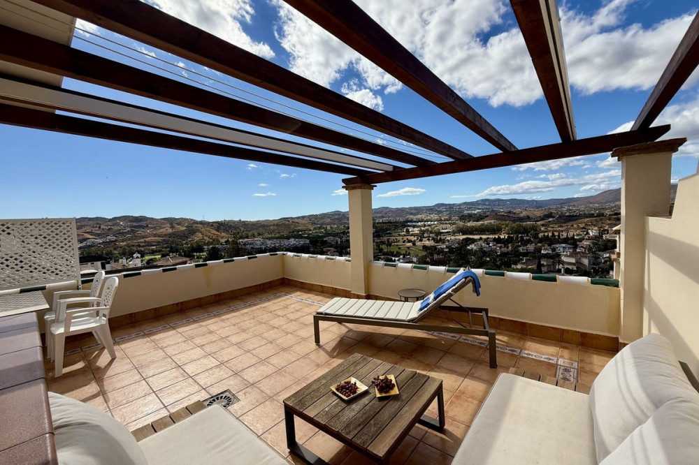 - Townhouse with amazing panoramic views in Puebla Aida, Mijas Golf Welcome to this beautifully presented 2-bedroom townhouse, located in the sought-after Andalusian-style community of Puebla Aida, right in the heart of Mijas Golf. As you enter, you’re greeted by a bright and inviting open-plan living and dining area, featuring a modern, high-quality kitchen. From here there is direct access to a spacious south-southwest-facing terrace — perfect for dining al fresco, relaxing with a glass of wine, and soaking up the breathtaking views. On this level, there’s also a guest toilet and a practical storage space. Upstairs, you’ll find two generous bedrooms with fitted wardrobes and a stylish bathroom. The highlight of this home is without doubt the private rooftop terrace, offering panoramic views of the golf course, mountains, and sunsets. The solarium features a dining area, lounge sofas, and sun loungers under a pergola with adjustable awning — the ideal spot for outdoor living, entertaining, or simply enjoying the tranquil surroundings. Puebla Aida is renowned for its beautiful Andalusian architecture, immaculately kept communal areas, and four swimming pools open year-round. The community also offers a petanque court, charming squares, and peaceful corners that give it a truly unique atmosphere. The location is excellent — surrounded by nature yet close to everything you need. Within walking distance, you’ll find restaurants, a mini-market, golf courses, and the luxurious 5-star Hotel La Zambra with restaurants and bars. Bus connections make it easy to reach Fuengirola’s beaches, shopping, and entertainment, and by car you’re only a short drive from La Cala, Marbella, and Málaga Airport. The townhouse features air conditioning (hot/cold), a fireplace, drinkable tap water, and is sold part furnished. Ready to move in. Optional: An extra-large private garage is available for purchase separately, located directly below the property. Don’t miss this opportunity to own a piece of authentic Andalusian charm on the Costa del Sol.