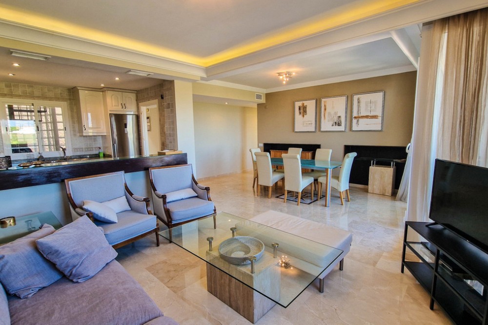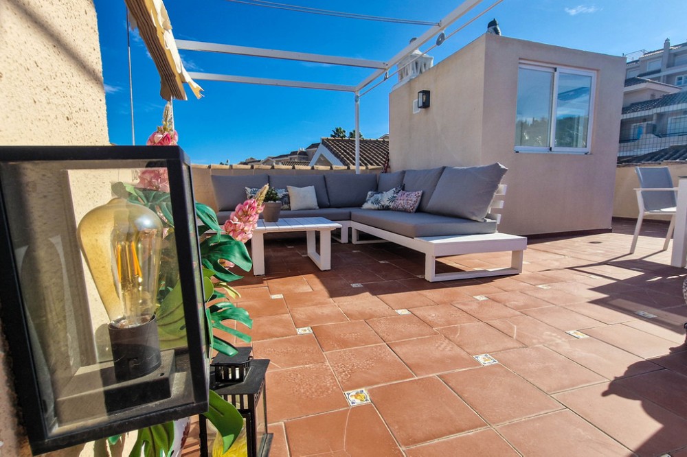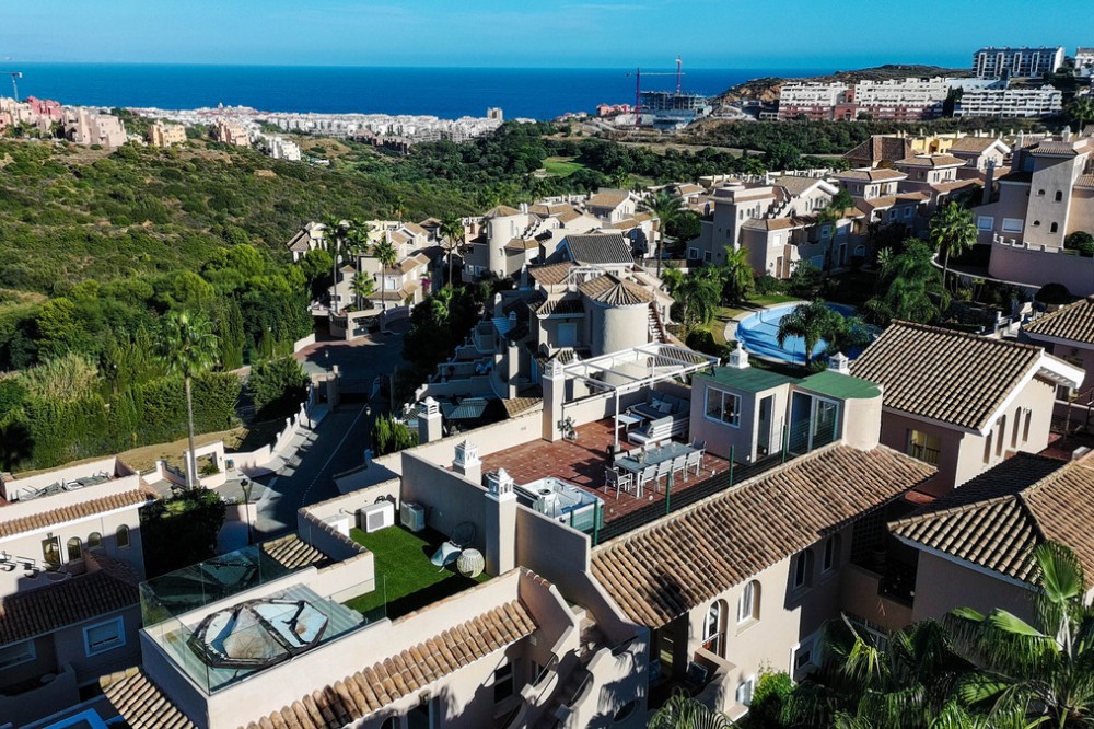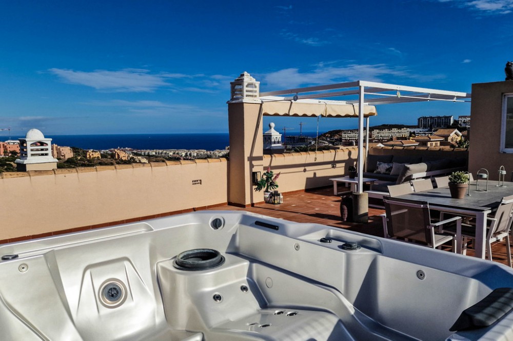 - This stunning penthouse offers a rare blend of style, comfort, and breathtaking views — a perfect retreat for those seeking an elevated Mediterranean lifestyle. Designed to capture natural light throughout the day, the residence features three spacious bedrooms and two modern bathrooms, combining contemporary finishes with a relaxed coastal feel. The open-plan living area flows effortlessly onto a private terrace, where panoramic views stretch across the landscape and beyond. An impressive solarium provides additional outdoor space — ideal for entertaining or unwinding — complete with an outdoor kitchen and jacuzzi for enjoying the warm Spanish evenings in total privacy. in addition you get to enjoy communal swimmingpools in plural and lush, wellkept gardens, throughout the urbanisation. Whether used as a full-time residence or a luxury holiday home, this penthouse offers both sophistication and practicality. Every detail has been carefully considered to create an inviting space that balances indoor comfort with outdoor living. Perfectly positioned to enjoy local amenities, beautiful beaches, and nearby golf courses, this property truly deserves to be seen in person to appreciate its exceptional setting and views beyond belief. Ladies and Gentlemen, this is an opportunity you do not want to miss, so contact us today for a viewing you will not forget. Distances: – Málaga Airport: approx. 60 minutes – Gibraltar Airport: approx. 40 minutes