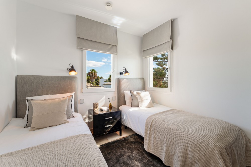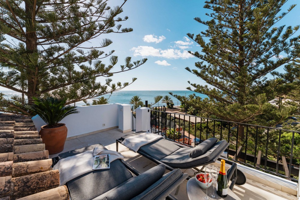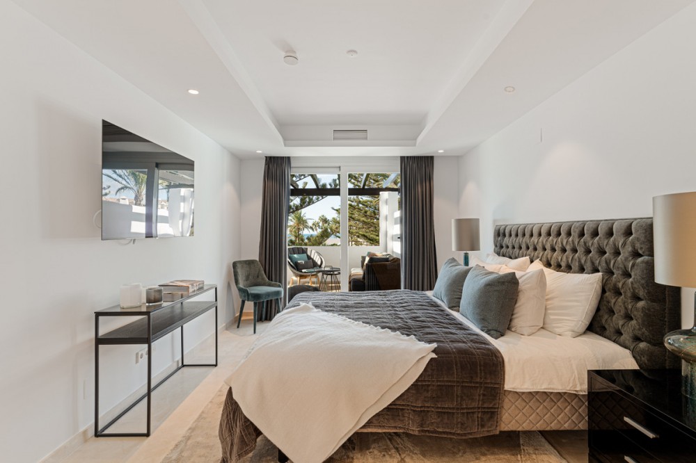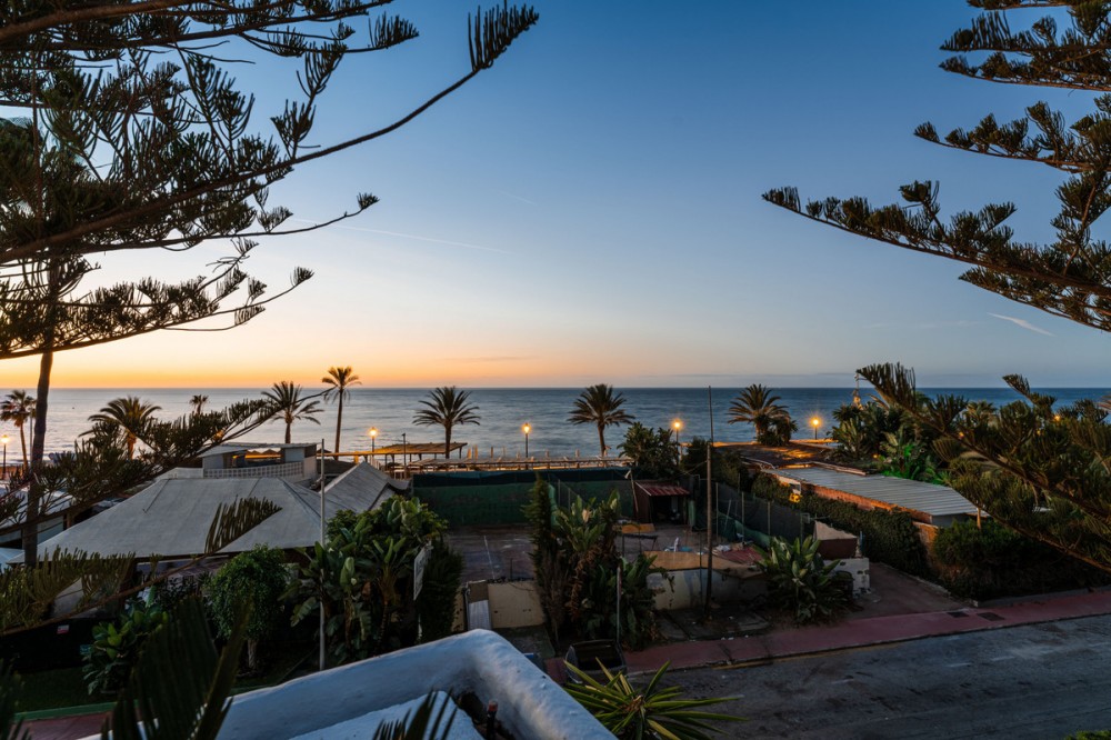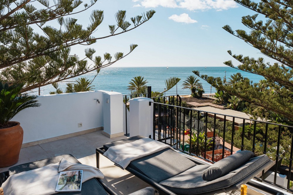 - Penthouse Horizon is a sophisticated three-bedroom, two-bathroom duplex penthouse for sale in the exclusive Castiglione urbanization in San Pedro de Alcántara. This outstanding residence has been designed to harmonize modern aesthetics with functionality. Originally constructed in 1985 and fully renovated in 2019, the property combines timeless quality with a clean, Scandinavian-inspired design. The penthouse offers 163 square meters of interior living space and two expansive terraces that invite panoramic views of the Mediterranean Sea, mountain landscape, and community pool, creating a calm and elegant environment ideal for coastal living. The home’s interior is defined by light, flow, and precision. The layout has been carefully arranged to provide a sense of openness while maintaining privacy between the living areas and bedrooms. At the core of the property lies a Poggenpohl open-plan kitchen fitted with NEFF appliances, creating a space where design meets practicality. The kitchen extends into a spacious living and dining area that opens directly to the south-facing terrace, a perfect setting for outdoor dining and entertaining, complete with a built-in BBQ station. The west-facing terrace, accessible from both the master bedroom and the living room, offers an inviting lounge space where residents can enjoy the tranquil Mediterranean evenings and spectacular sunset views. Every element of Penthouse Horizon reflects quality and contemporary craftsmanship. The residence features underfloor heating throughout, providing comfort in all seasons, and an integrated Bang & Olufsen sound system that enhances the living experience with high-end acoustics. The attention to modern convenience continues with electric blinds in each room and access to two communal swimming pools within the gated community, offering residents both security and leisure. The development also benefits from well-maintained gardens and extensive communal parking, ensuring practicality for everyday living. Positioned along Avenida de las Petunias, one of the most desirable areas in San Pedro, the property enjoys an exceptional location only 25 meters from the beach promenade. This proximity to the sea allows easy access to Playa San Pedro de Alcántara, known for its wide sandy stretch and calm waters, ideal for swimming and family activities. The surrounding area offers a lively yet relaxed atmosphere, lined with palm trees, cycling paths, and beachside dining venues such as Macaao Beach Club, Nuevo Reino, and El Ancla Restaurant, all known for their vibrant Mediterranean cuisine and sea views. The neighborhood is valued for its accessibility and safety, offering a sense of community without compromising proximity to urban amenities. Centro Comercial La Colonia is just minutes away, providing a variety of shops, grocery outlets, and cafés. Fitness enthusiasts can visit NAC gym and i/O club, while Centro Paddle Nueva Alcántara caters to tennis and paddle lovers. Guadalmina Golf Club, one of the region’s premier golf courses, is also nearby, making the location ideal for sports-oriented lifestyles. Education is another key strength of this area. Families have access to several reputable schools, including Calpe School, Laude International College, and San Pedro International College, all offering quality bilingual and international curriculums. The area is well-connected by public transport, with regular bus services running to Puerto Banús, Estepona, and central San Pedro. For drivers, the A-7 motorway is easily accessible, linking the town to the entire Costa del Sol corridor. This remarkable home, located steps from the beach in one of the most desirable areas of San Pedro, represents a rare opportunity to acquire a residence that truly defines contemporary coastal living.