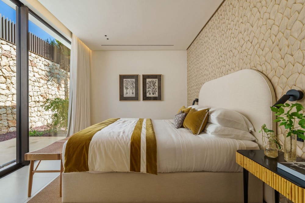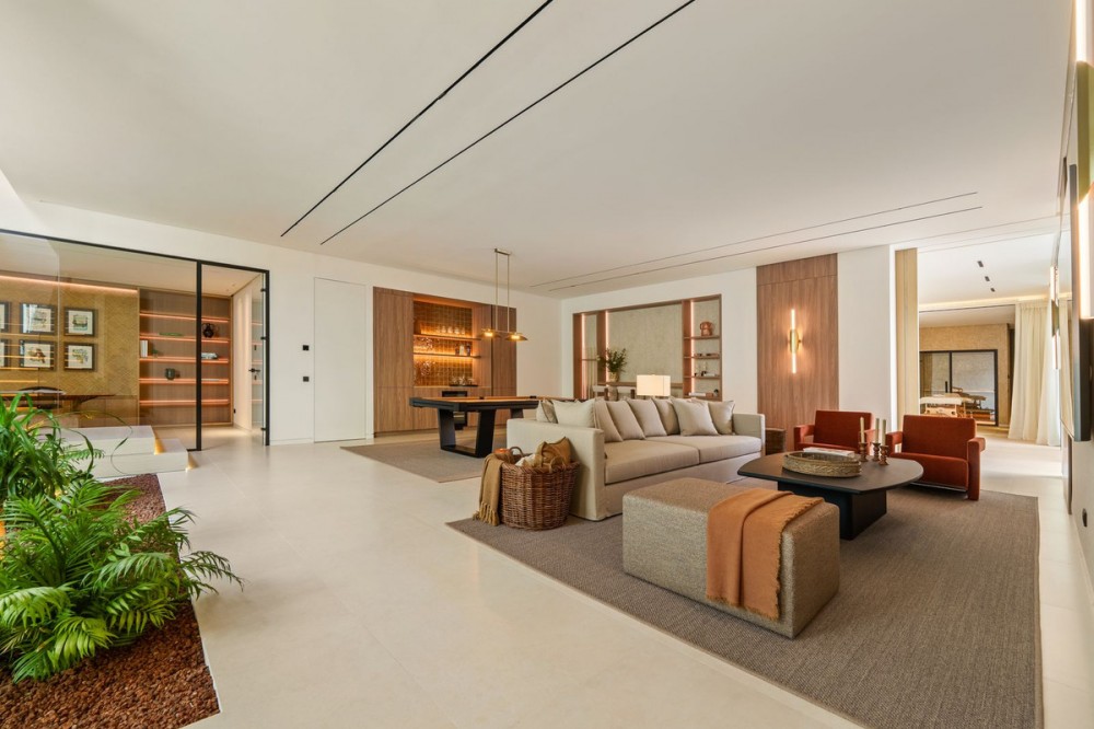 - Nestled in the prestigious Lomas de Marbella Club on Marbella’s Golden Mile, this architectural masterpiece redefines contemporary Mediterranean living. Spanning 1,460 m² on a 1,010 m² plot, the seven-bedroom residence offers an exceptional fusion of elegance, privacy, and natural serenity. Wood and stone dominate its design, infusing every space with organic warmth and creating a seamless dialogue between interior comfort and the surrounding landscape. The layout has been meticulously conceived to harmonize intimate family moments with open social living. A luminous open-plan living and dining area welcomes you upon entry, connected to a sophisticated light-wood kitchen that anchors the social core of the home. Expansive floor-to-ceiling glass doors dissolve boundaries between indoors and out, leading to wide terraces and lush gardens bathed in Mediterranean light. This level also features a private guest suite with independent terrace access for ultimate comfort and discretion. On the upper floor, three tranquil bedrooms include two guest suites opening onto the terrace and a master retreat with a walk-in closet and a spa-inspired bathroom featuring a rain shower and freestanding bathtub. The lower level is dedicated to leisure and well-being, complete with a wellness spa, hammam, gym, wine room, home office, playroom, and an additional en-suite guest bedroom with garden and pool access. Outdoors, manicured gardens frame an inviting pool, lounge, dining area, and outdoor kitchen—ideal for year-round alfresco living. This residence embodies refined design and timeless sophistication, where architecture and nature exist in perfect harmony.