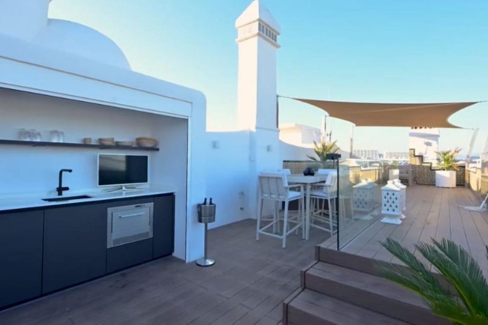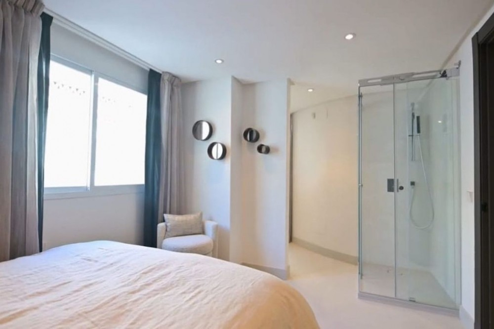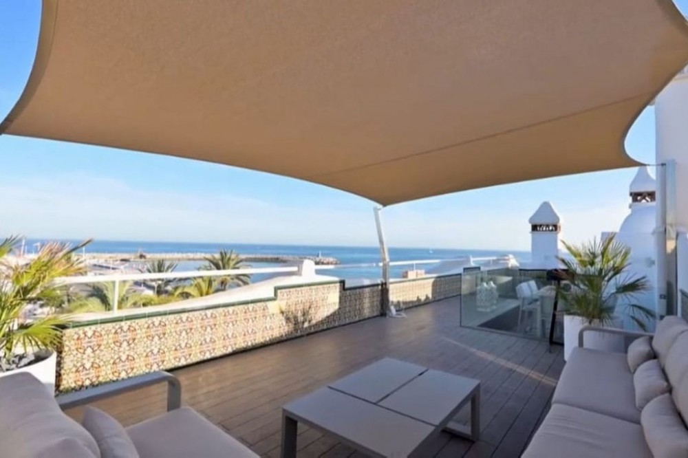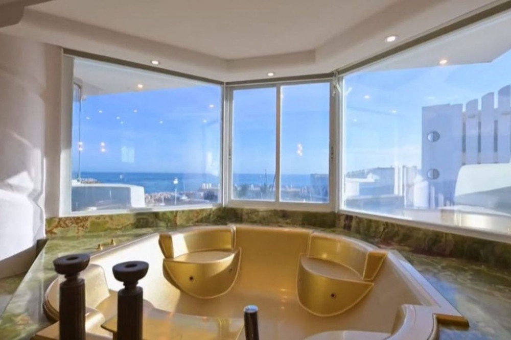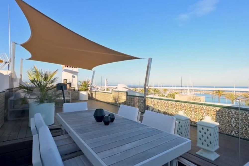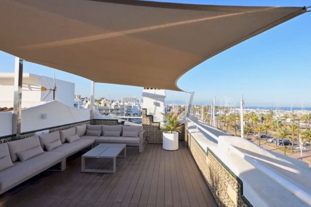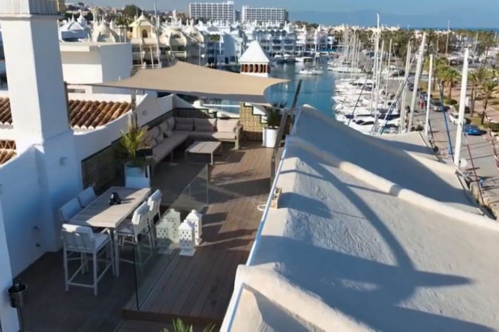 - For sale this front line luxurious four-bedroom duplex penthouse in the famous Puerto Marina in Benalmádena Costa. This stunning penthouse has been reformed to the highest standard mixing modern with contemporary living, it is one of the best penthouses front line Port that you will ever get the chance to buy. Entering the property, you have a spacious hallway that leads into a living space. On this floor natural light flows into the property effortlessly and you will also find the sleek marble kitchen and breakfast bar, accompanied by an open plan dining space. This level also has spacious terraces where you and your family can sit and enjoy the tranquillity of this amazing property, with the most amazing open views looking over the Marina and to the sea. The property 4 double bedrooms, 3 with their own ensuite bathrooms, giving the privacy and comfort for eveybody. The bathrooms are designed and have modern finishes. The master suite is a great on its own, with all the space and a walk-in closet that is sure to please design and style lovers. This corner penthouse is very light, thanks to its corner location and southwest orientation. You will enjoy natural light throughout the day, especially in the living room, where you can relax and have the spectacular views of the sea. Imagine enjoying picturesque sunsets from here! One of the specialties of this property is its private solarium which is accessed from the living room, via a spiral staircase which takes you up to the private roof terrace, which is amazing for its views and the size of it. Here you can enjoy the sun all day long, relax in the chill-out area and take advantage of the outdoor kitchen to prepare delicious meals al fresco. This space is perfect for socializing with friends and family while taking in the stunning panoramic views. Includes part of the furniture and garage space, it has everything to start enjoying now! The location in Puerto Marina, Benalmádena, adds even more value to this magnificent home. As you will find here haute cuisine restaurants, luxury boutiques and entertainment options. Welcome to book your viewings with us!