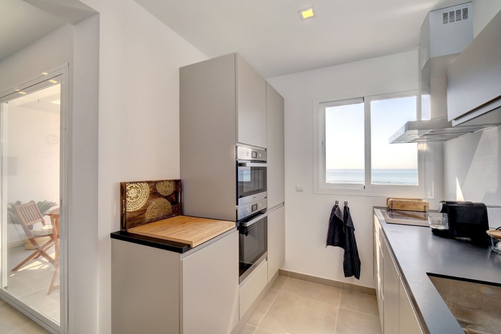 - Beautiful 3-bedrom Beachfront Apartment in Central Estepona – Unmatched Sea Views and Prime Coastal Living Description: Exclusive Costa del Sol Property Listing: We are proud to present this exclusive beachfront apartment, perfectly situated in the heart of Estepona. Directly on the first line of the beach. This exceptional property offers uninterrupted panoramic views of the Mediterranean, Gibraltar, and even the distant African coastline. This is a truly unique opportunity to own a home that combines urban living with direct beach access, something rarely available in Estepona’s vibrant town center. From your private terrace, you can enjoy the sound of the waves, the golden sunsets, and the lively yet relaxed atmosphere of one of the Costa del Sol’s most sought-after destinations. The apartment features a bright open-plan living area with floor-to-ceiling windows that frame the stunning sea views and flood the space with natural light. The modern kitchen blends seamlessly into the living area, creating a perfect environment for both everyday comfort and elegant entertaining. Step onto your private terrace, ideal for morning coffee or an evening glass of wine while watching the sunset. Every detail of the apartment reflects quality and sophistication, from the high-end finishes to the thoughtfully designed layout. With its prime beachfront position and central location, all amenities are at your doorstep: charming cafés, renowned restaurants, boutique shops, and the picturesque old town are just a short stroll away. This is more than just a property, it’s a lifestyle. Whether as a permanent residence, a holiday home, or an investment, this beachfront apartment represents one of Estepona’s most desirable offerings. Don’t miss the chance to own this extraordinary beachfront home in the very heart of Estepona. The sale includes a parking space; however, it will be sold separately from the property. Please note that this is an illustration of the property's layout with approximate measurements. Actual dimensions may vary, and buyers are advised to take their own measurements during the viewing.