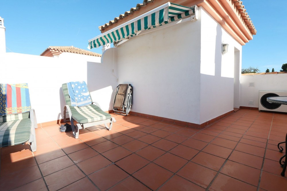 - Unique opportunity, beautiful townhouse with 2 bathrooms and possibility to 3 bedrooms, next to the port of beautiful Cabopino. This is one of the most popular, gated-community of preferred location in Marbella East, only 5-minutes' drive from some of the Costa del Sol’s best marina, beaches and protected sand dunes of Cabopino and Elviria. This highly-desirable 2-bedroom, 2,5-bathroom townhouse is located in a tranquil and well-maintained community with two large swimming pools, one of which is designed for more serious swimmers. Situated in the better of locations in the urbanisation and close to one of the two, very large, communal swimming pools, this property is accessible from its private, underground garage off the sweeping driveway, as well as from the spacious, double-terraces on the ground-floor. A percentage of the underground garage could easily be converted to an additional room/office/etc., and still leave sufficient space for a car to park in, if desired. Front-of-house boasts a gated entrance onto one of the large terraces, which enjoys afternoon and evening sun, with plenty of privacy and space for furnishing options. Inside the property, which has a notable abundance of natural light throughout, there is an enclosed fully-fitted kitchen, which leads on to the large dining and living room, with working fireplace and quality marble-flooring. Large terrace doors slide open onto the larger terrace which enjoys morning sun, equipped with its outdoor chillout and bbq area, all covered with new, sliding sunshades, making the space perfect for relaxation and late bbq evenings on the terrace. On the first-floor are 2 double bedrooms, all with attractive Juliet balconies, plus 2 bathrooms. This level leads up onto the ample rooftop solarium, which benefits of great panoramic views. This community is renowned for its high-quality surroundings, tranquil location, and convenient accessibility, within easy-walking distance to a local shop, bar and restaurant. All this is just a 10-minutes' walk to the port of Cabopino with its array of restaurants and bars, making it a perfect choice for those seeking a holiday home, or all-year round living. 15-minutes from Marbella Centro and 30-minutes from Málaga International Airport. Please contact us for more info or viewing. Keys in office.