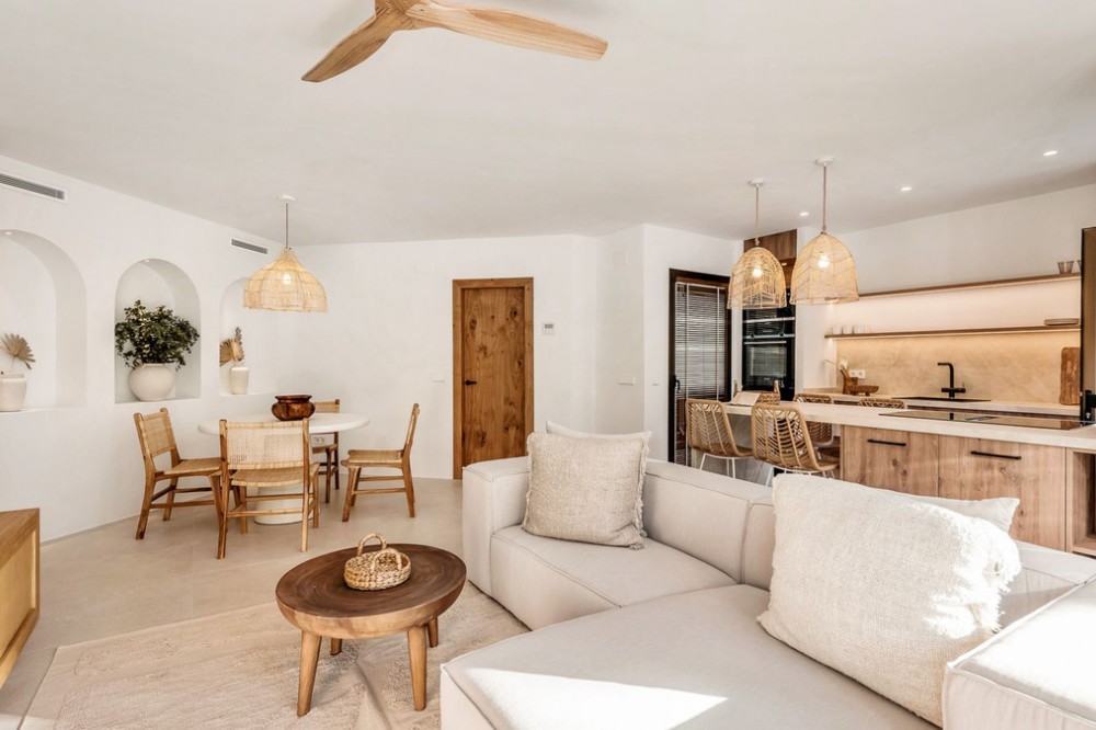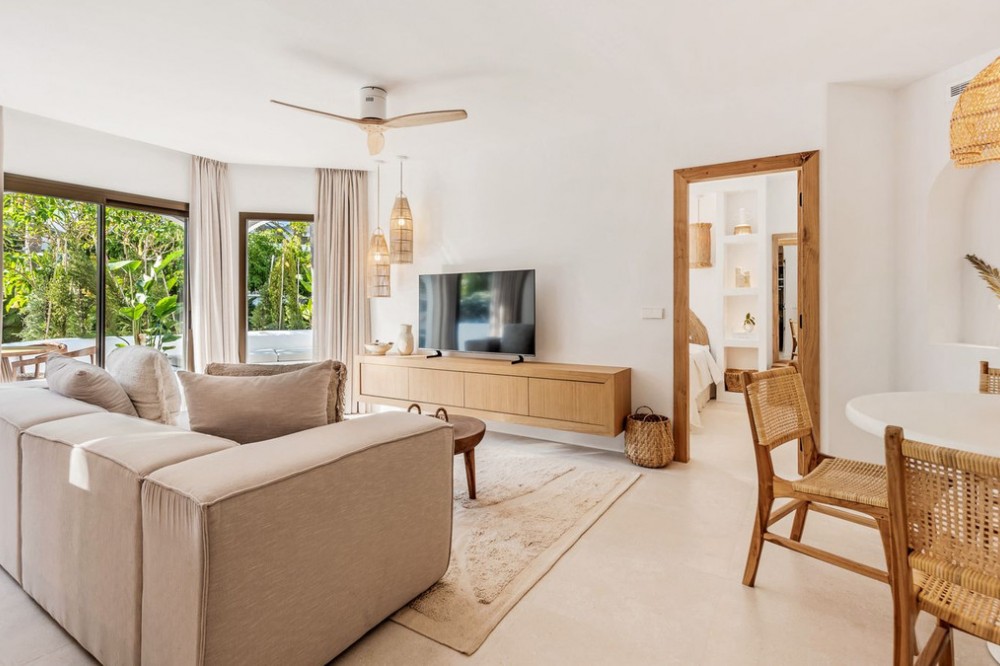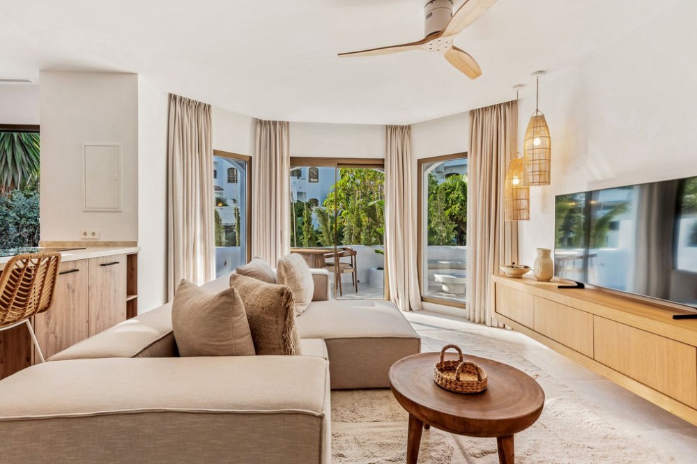 - REFURBISHED APARTMENT JUST METRES FROM THE BEACH – GOLDEN BEACH, REAL DE ZARAGOZA (Tourist licence in place) Located within the exclusive beachfront residential enclave of Golden Beach in Elviria, this fully refurbished ground-floor apartment offers the true lifestyle of modern Mediterranean living. Facing west, it enjoys beautiful sunsets, creating a warm and welcoming atmosphere both inside and out on the terrace. The property perfectly combines design, comfort and functionality, with open spaces, contemporary materials and carefully selected décor. From the living room, you have direct access to a lovely outdoor area, ideal for al fresco dining, relaxing or enjoying time with family, all surrounded by well-kept communal gardens. Situated just a few metres from the prestigious Real de Zaragoza Beach, an impressive coastal gem in Marbella boasting 1,700 metres in length and 30 metres in width, the area offers some of the finest sand on the coast. Adding to this are the nearby exclusive beach clubs, such as Plage Casanis and Estrella del Mar, which make this one of the most sought-after locations. A perfect home as a holiday getaway, permanent residence or investment with high rental demand on one of Marbella’s best beaches.